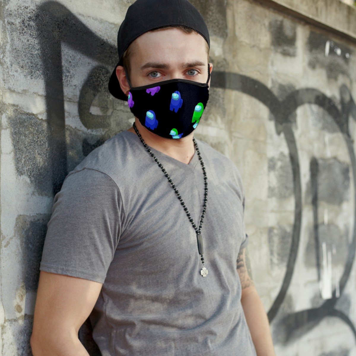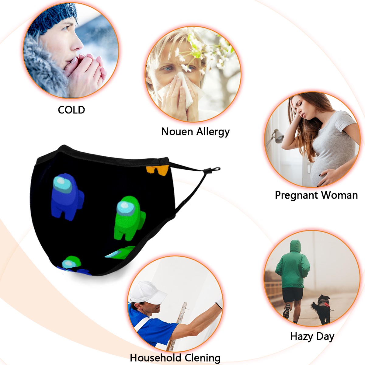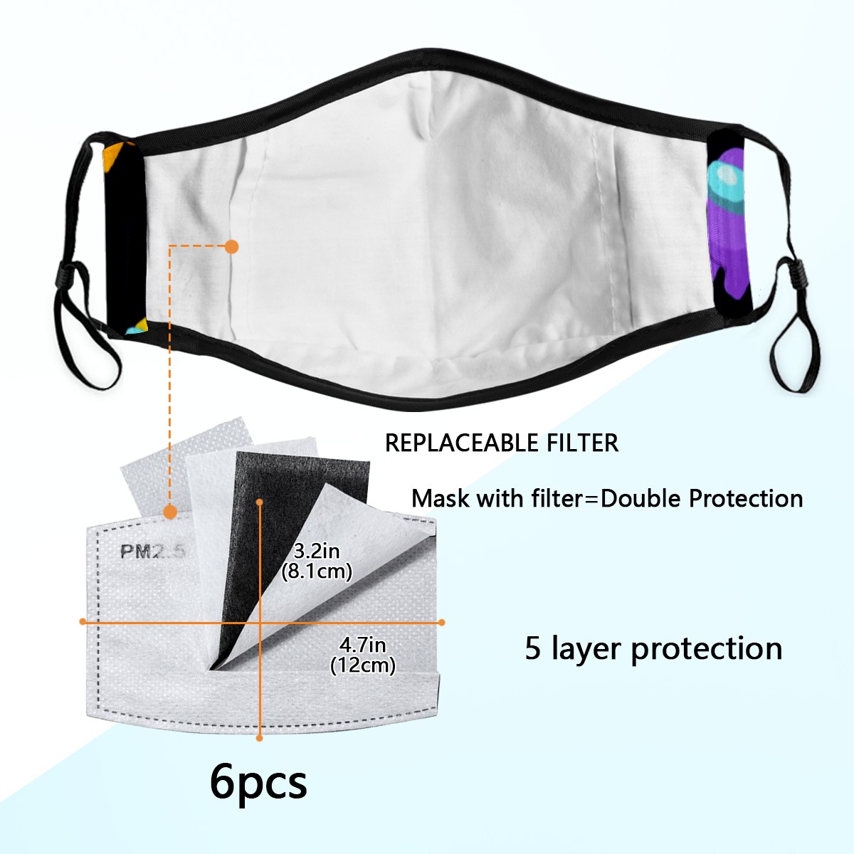 Washable Cloth Face Cover Mask Watercolor Among Us Cartoon Reusable Dust Windproof Mask Face Protection Adjustable Ear Loops & Nose Wire Bandana with 6 Pcs Filter for Women Men Kids