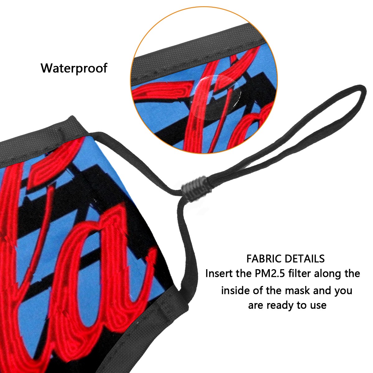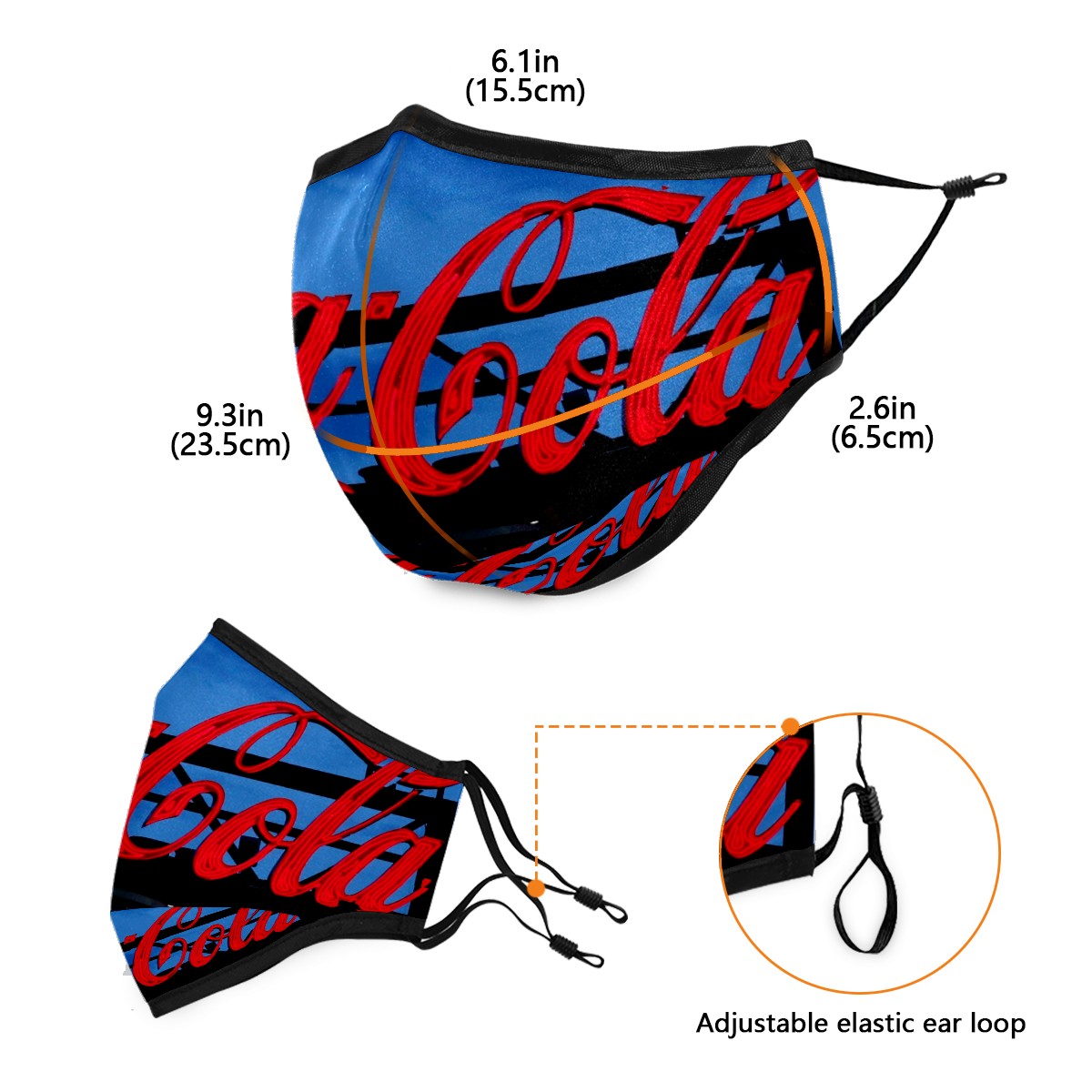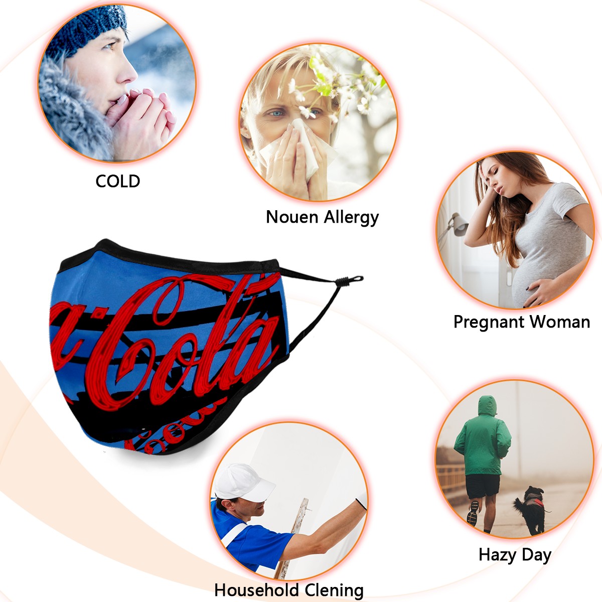 Washable Cloth Face Cover Mask Coca-Cola Sign Reusable Dust Windproof Mask Face Protection Adjustable Ear Loops & Nose Wire Bandana with 6 Pcs Filter for Women Men Kids