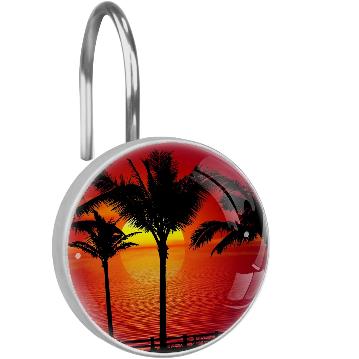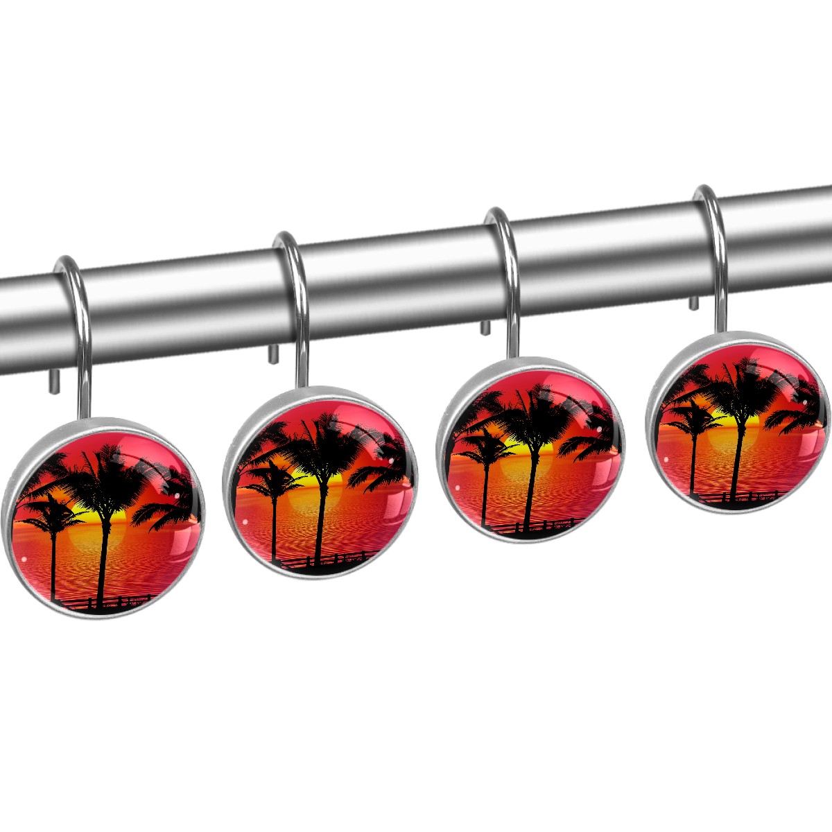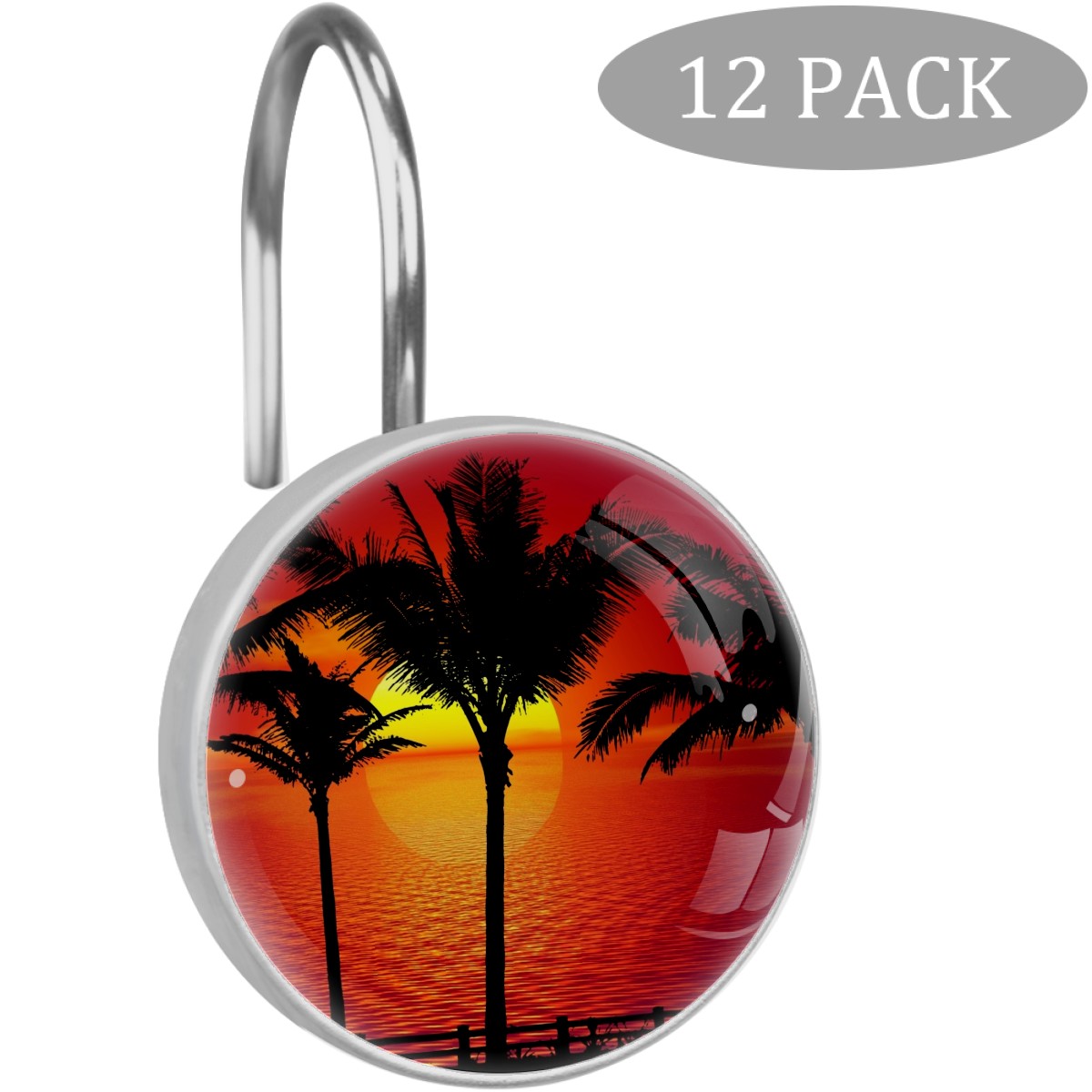 Decorative Shower Curtain Hooks Set of 12 Sunset Over Tropical Palm Trees Resin Shower Hooks for Curtain Shower Rings for Bathroom Home Hotel Shower Rods