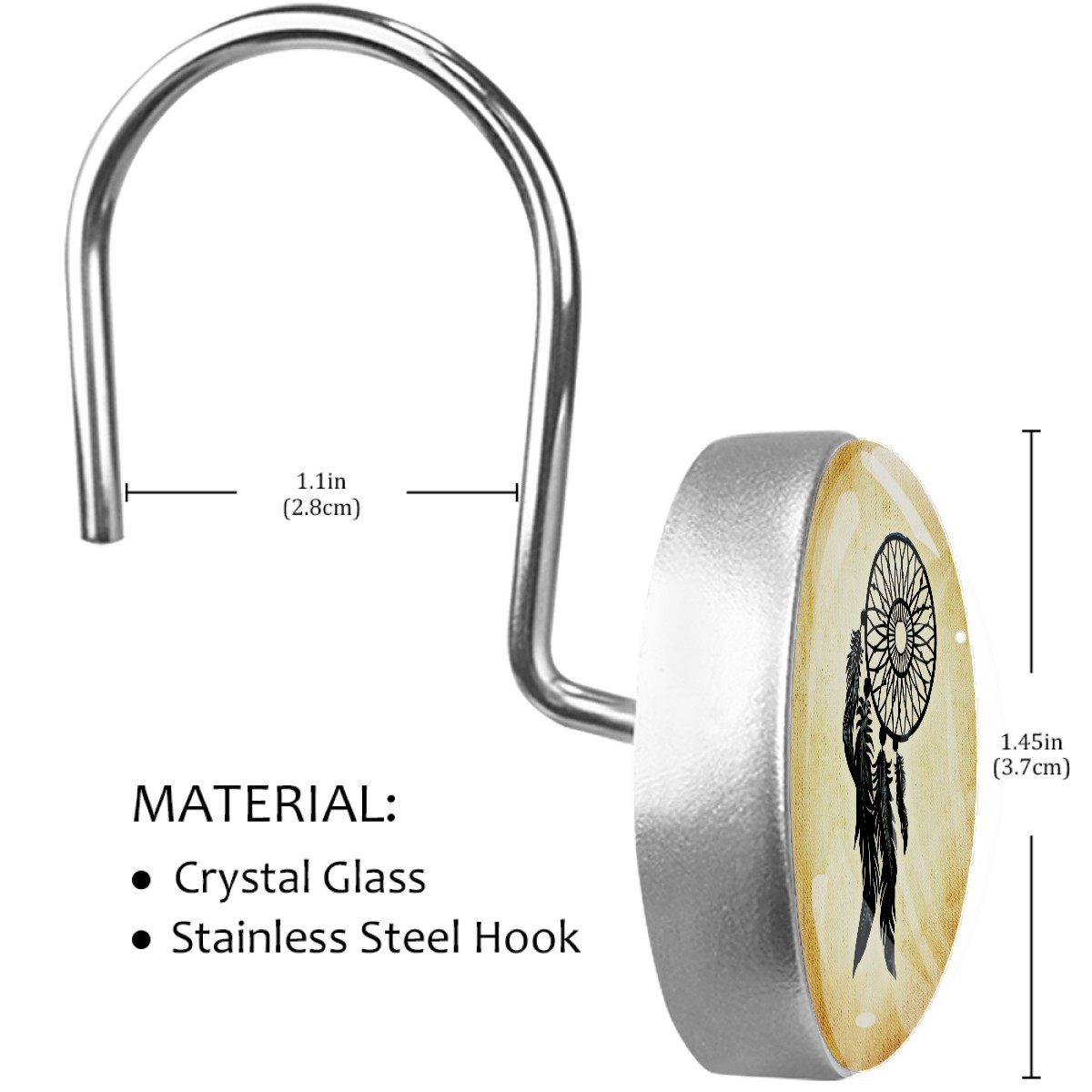 <p>This set of 12 durable hooks attach easily to any standard shower curtain, liner, and rod system to keep the curtain securely attached and evenly draped. </p><p>&nbsp;</p><p>- Impressively durable with sturdiness to hold up any shower curtain.</p><p>&nbsp;</p><p>- <b>Easy to install</b>: simply thread through existing holes and hang over shower rod.</p><p>&nbsp;</p><p>- Vibrant print on one side which adds style to your shower rod.</p><p>&nbsp;</p><p>- Astoundingly gorgeous design to <b>Decorate your bathroom</b>.</p><p>&nbsp;</p><p><b>Package Including</b></p><p>12*Shower Curtain Hooks</p><p>&nbsp;</p><p><b>Notes</b></p><p>1. Due to the different monitor and light effect, the actual color of the item might be slightly different from the color showed on the pictures. Thank you!</p><p>2. Please allow 2-3cm measuring deviation due to manual measurement.</p>