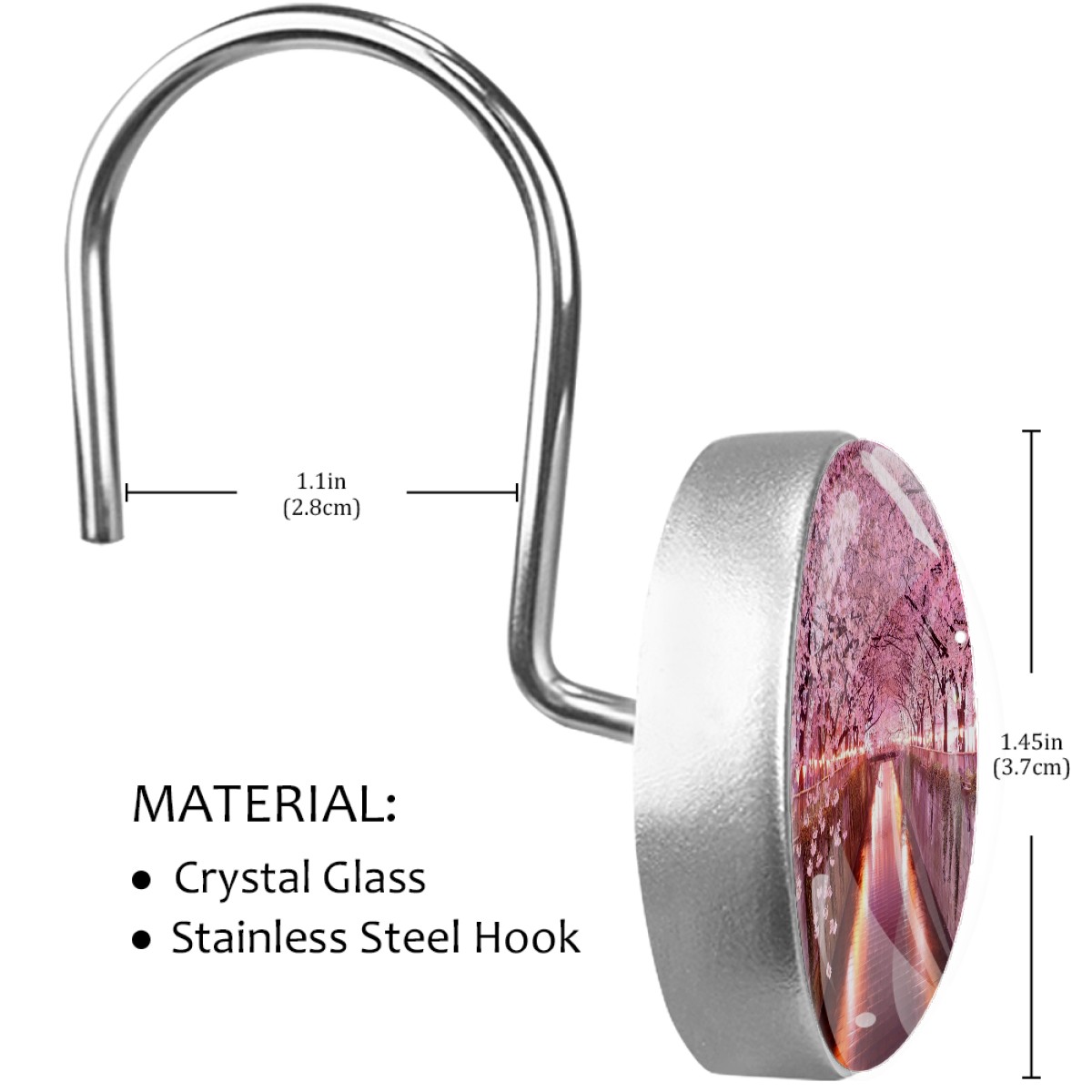 <p>This set of 12 durable hooks attach easily to any standard shower curtain, liner, and rod system to keep the curtain securely attached and evenly draped. </p><p>&nbsp;</p><p>- Impressively durable with sturdiness to hold up any shower curtain.</p><p>&nbsp;</p><p>- <b>Easy to install</b>: simply thread through existing holes and hang over shower rod.</p><p>&nbsp;</p><p>- Vibrant print on one side which adds style to your shower rod.</p><p>&nbsp;</p><p>- Astoundingly gorgeous design to <b>Decorate your bathroom</b>.</p><p>&nbsp;</p><p><b>Package Including</b></p><p>12*Shower Curtain Hooks</p><p>&nbsp;</p><p><b>Notes</b></p><p>1. Due to the different monitor and light effect, the actual color of the item might be slightly different from the color showed on the pictures. Thank you!</p><p>2. Please allow 2-3cm measuring deviation due to manual measurement.</p>