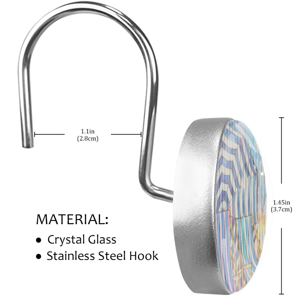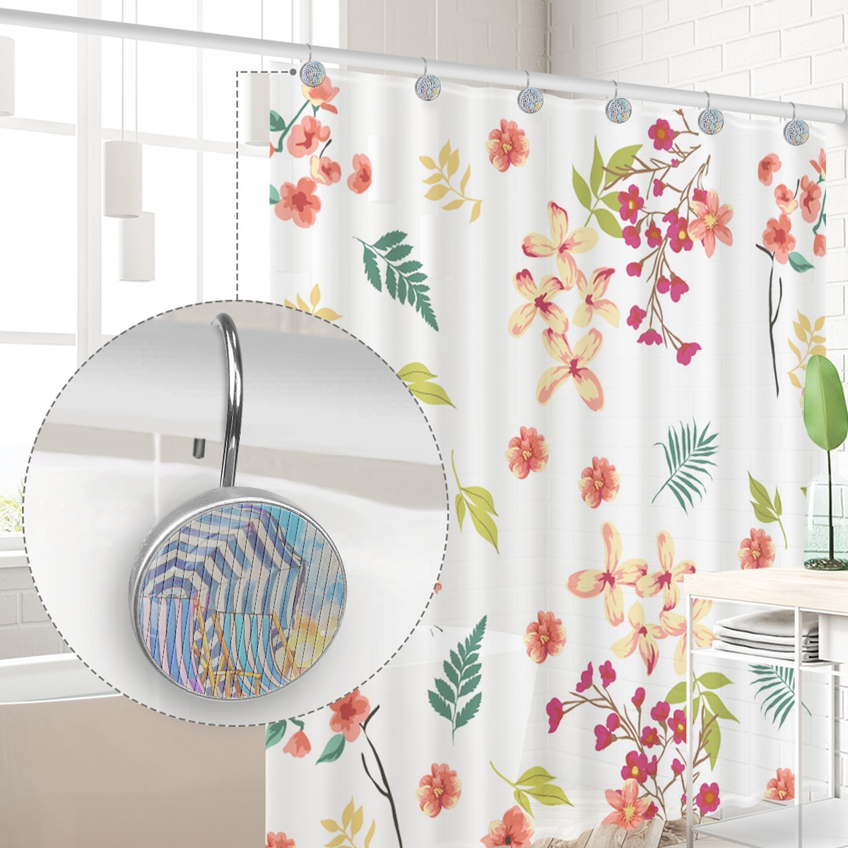 <p>This set of 12 durable hooks attach easily to any standard shower curtain, liner, and rod system to keep the curtain securely attached and evenly draped. </p><p>&nbsp;</p><p>- Impressively durable with sturdiness to hold up any shower curtain.</p><p>&nbsp;</p><p>- <b>Easy to install</b>: simply thread through existing holes and hang over shower rod.</p><p>&nbsp;</p><p>- Vibrant print on one side which adds style to your shower rod.</p><p>&nbsp;</p><p>- Astoundingly gorgeous design to <b>Decorate your bathroom</b>.</p><p>&nbsp;</p><p><b>Package Including</b></p><p>12*Shower Curtain Hooks</p><p>&nbsp;</p><p><b>Notes</b></p><p>1. Due to the different monitor and light effect, the actual color of the item might be slightly different from the color showed on the pictures. Thank you!</p><p>2. Please allow 2-3cm measuring deviation due to manual measurement.</p>