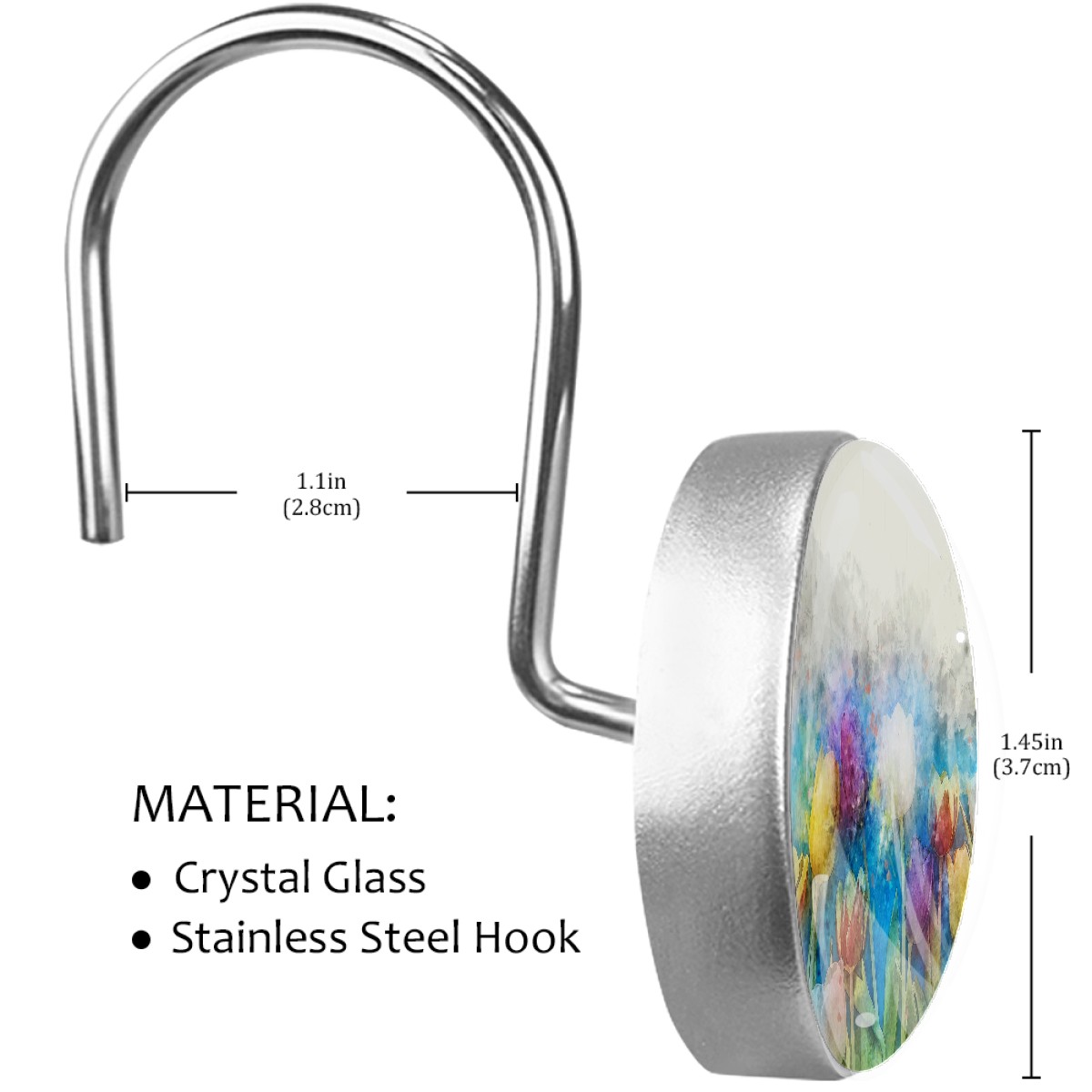 <p>This set of 12 durable hooks attach easily to any standard shower curtain, liner, and rod system to keep the curtain securely attached and evenly draped. </p><p>&nbsp;</p><p>- Impressively durable with sturdiness to hold up any shower curtain.</p><p>&nbsp;</p><p>- <b>Easy to install</b>: simply thread through existing holes and hang over shower rod.</p><p>&nbsp;</p><p>- Vibrant print on one side which adds style to your shower rod.</p><p>&nbsp;</p><p>- Astoundingly gorgeous design to <b>Decorate your bathroom</b>.</p><p>&nbsp;</p><p><b>Package Including</b></p><p>12*Shower Curtain Hooks</p><p>&nbsp;</p><p><b>Notes</b></p><p>1. Due to the different monitor and light effect, the actual color of the item might be slightly different from the color showed on the pictures. Thank you!</p><p>2. Please allow 2-3cm measuring deviation due to manual measurement.</p>