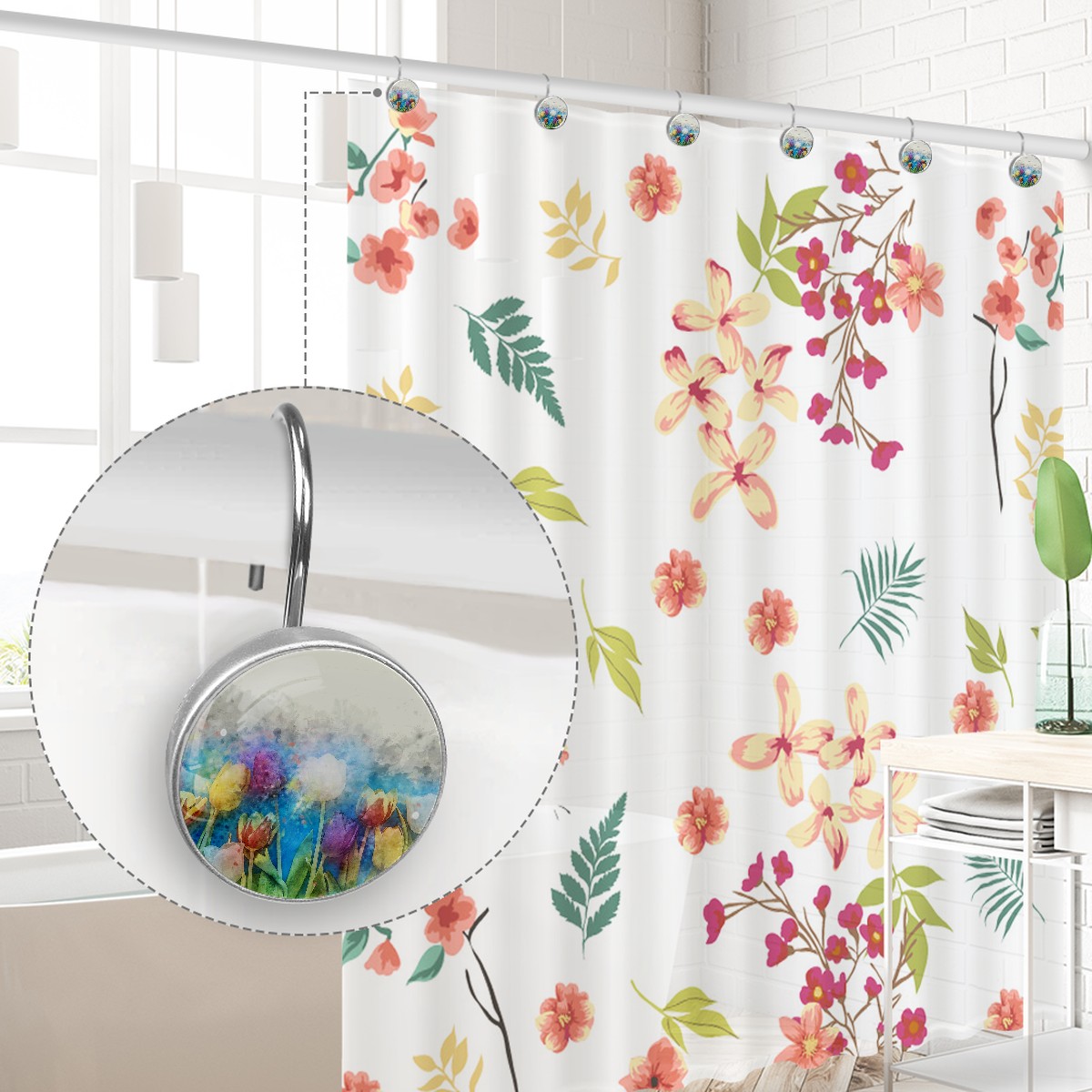 Decorative Shower Curtain Hooks Set of 12 Watercolor Flower Resin Shower Hooks for Curtain Shower Rings for Bathroom Home Hotel Shower Rods