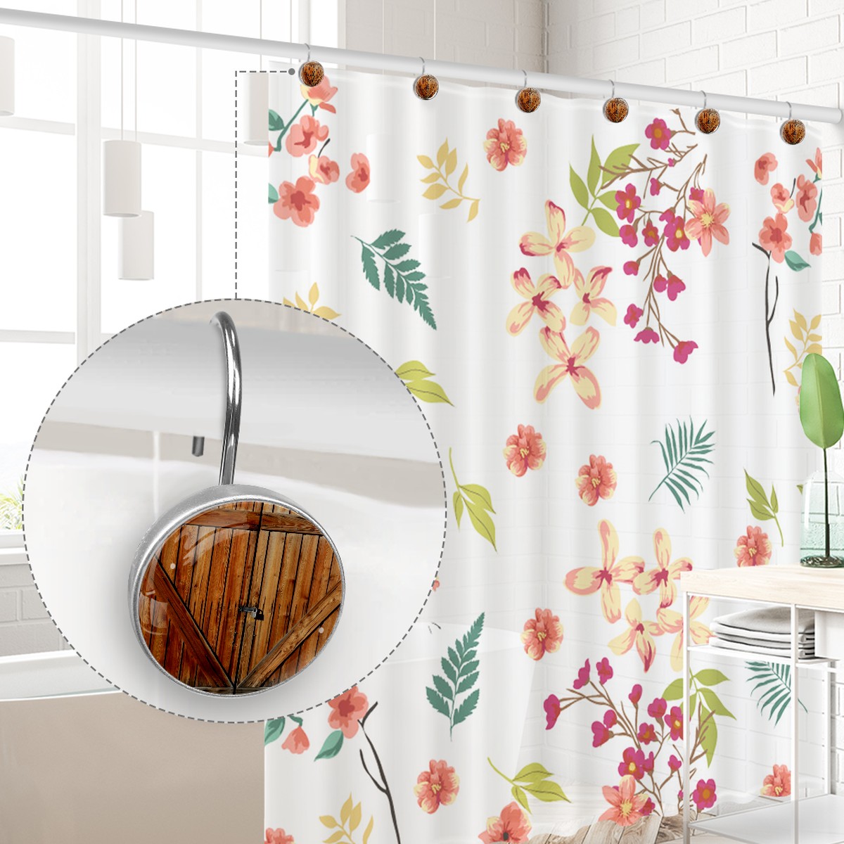<p>This set of 12 durable hooks attach easily to any standard shower curtain, liner, and rod system to keep the curtain securely attached and evenly draped. </p><p>&nbsp;</p><p>- Impressively durable with sturdiness to hold up any shower curtain.</p><p>&nbsp;</p><p>- <b>Easy to install</b>: simply thread through existing holes and hang over shower rod.</p><p>&nbsp;</p><p>- Vibrant print on one side which adds style to your shower rod.</p><p>&nbsp;</p><p>- Astoundingly gorgeous design to <b>Decorate your bathroom</b>.</p><p>&nbsp;</p><p><b>Package Including</b></p><p>12*Shower Curtain Hooks</p><p>&nbsp;</p><p><b>Notes</b></p><p>1. Due to the different monitor and light effect, the actual color of the item might be slightly different from the color showed on the pictures. Thank you!</p><p>2. Please allow 2-3cm measuring deviation due to manual measurement.</p>