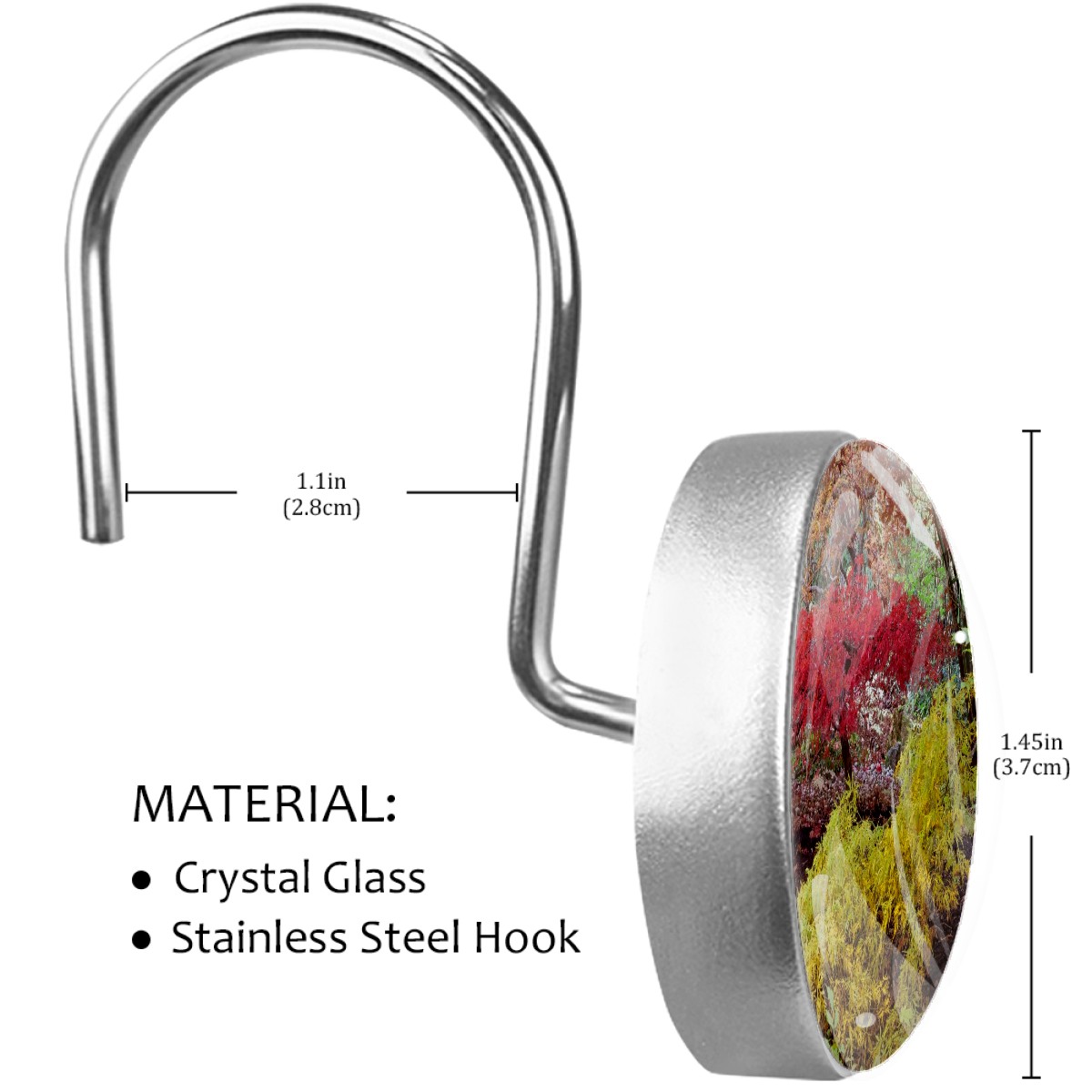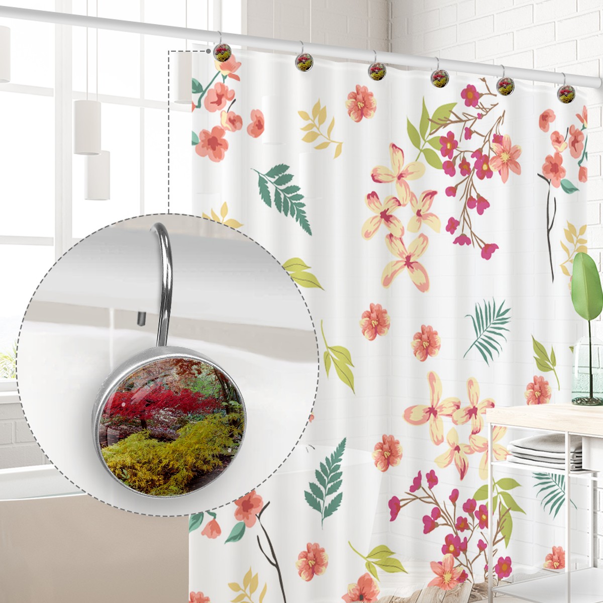 <p>This set of 12 durable hooks attach easily to any standard shower curtain, liner, and rod system to keep the curtain securely attached and evenly draped. </p><p> </p><p>- Impressively durable with sturdiness to hold up any shower curtain.</p><p> </p><p>- <b>Easy to install</b>: simply thread through existing holes and hang over shower rod.</p><p> </p><p>- Vibrant print on one side which adds style to your shower rod.</p><p> </p><p>- Astoundingly gorgeous design to <b>Decorate your bathroom</b>.</p><p> </p><p><b>Package Including</b></p><p>12*Shower Curtain Hooks</p><p> </p><p><b>Notes</b></p><p>1. Due to the different monitor and light effect, the actual color of the item might be slightly different from the color showed on the pictures. Thank you!</p><p>2. Please allow 2-3cm measuring deviation due to manual measurement.</p>