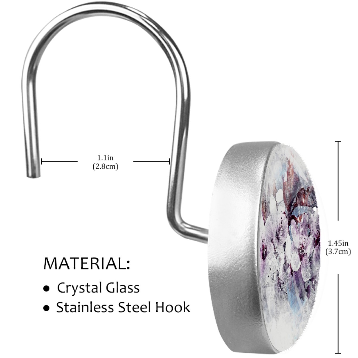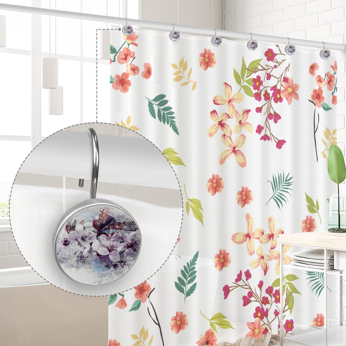 <p>This set of 12 durable hooks attach easily to any standard shower curtain, liner, and rod system to keep the curtain securely attached and evenly draped. </p><p>&nbsp;</p><p>- Impressively durable with sturdiness to hold up any shower curtain.</p><p>&nbsp;</p><p>- <b>Easy to install</b>: simply thread through existing holes and hang over shower rod.</p><p>&nbsp;</p><p>- Vibrant print on one side which adds style to your shower rod.</p><p>&nbsp;</p><p>- Astoundingly gorgeous design to <b>Decorate your bathroom</b>.</p><p>&nbsp;</p><p><b>Package Including</b></p><p>12*Shower Curtain Hooks</p><p>&nbsp;</p><p><b>Notes</b></p><p>1. Due to the different monitor and light effect, the actual color of the item might be slightly different from the color showed on the pictures. Thank you!</p><p>2. Please allow 2-3cm measuring deviation due to manual measurement.</p>
