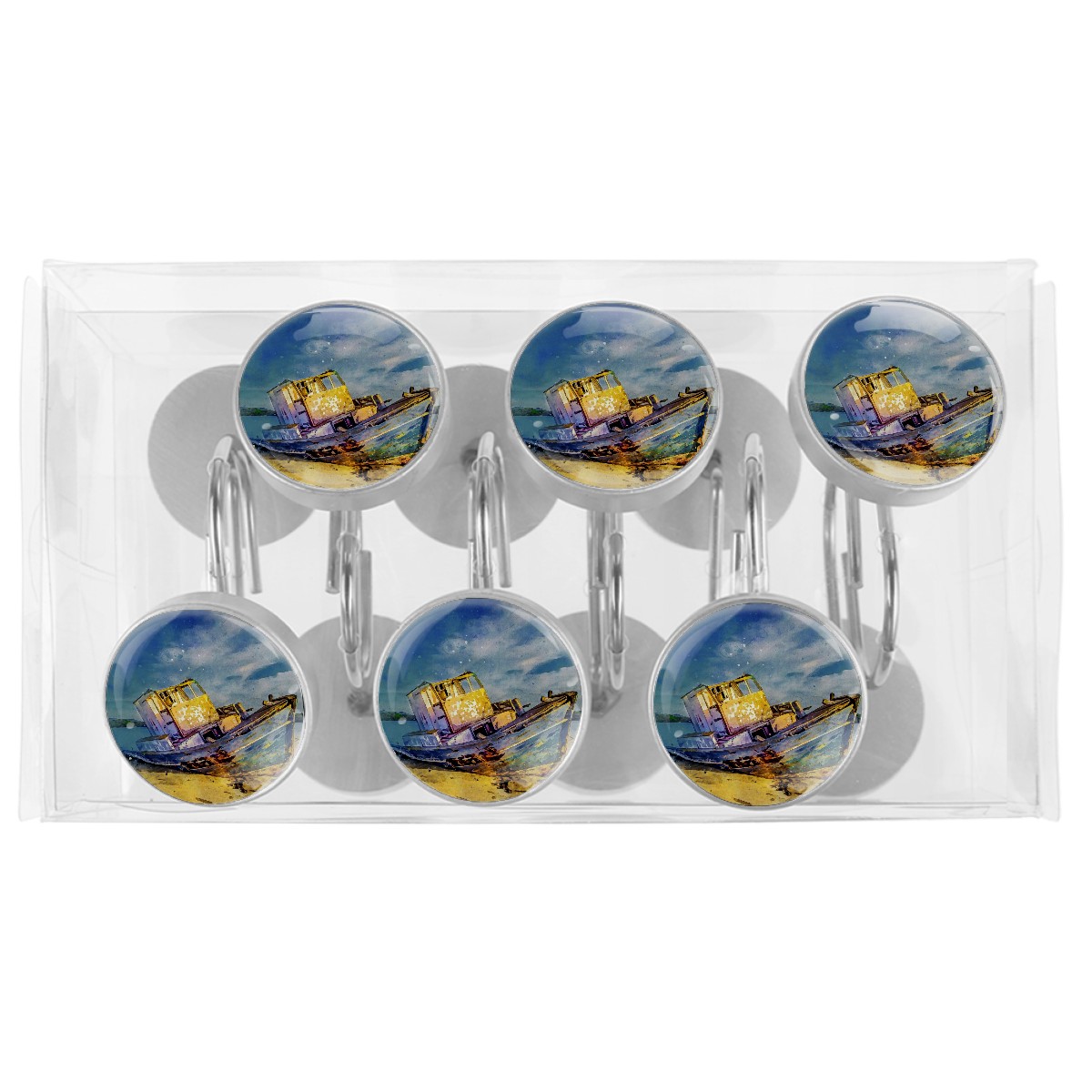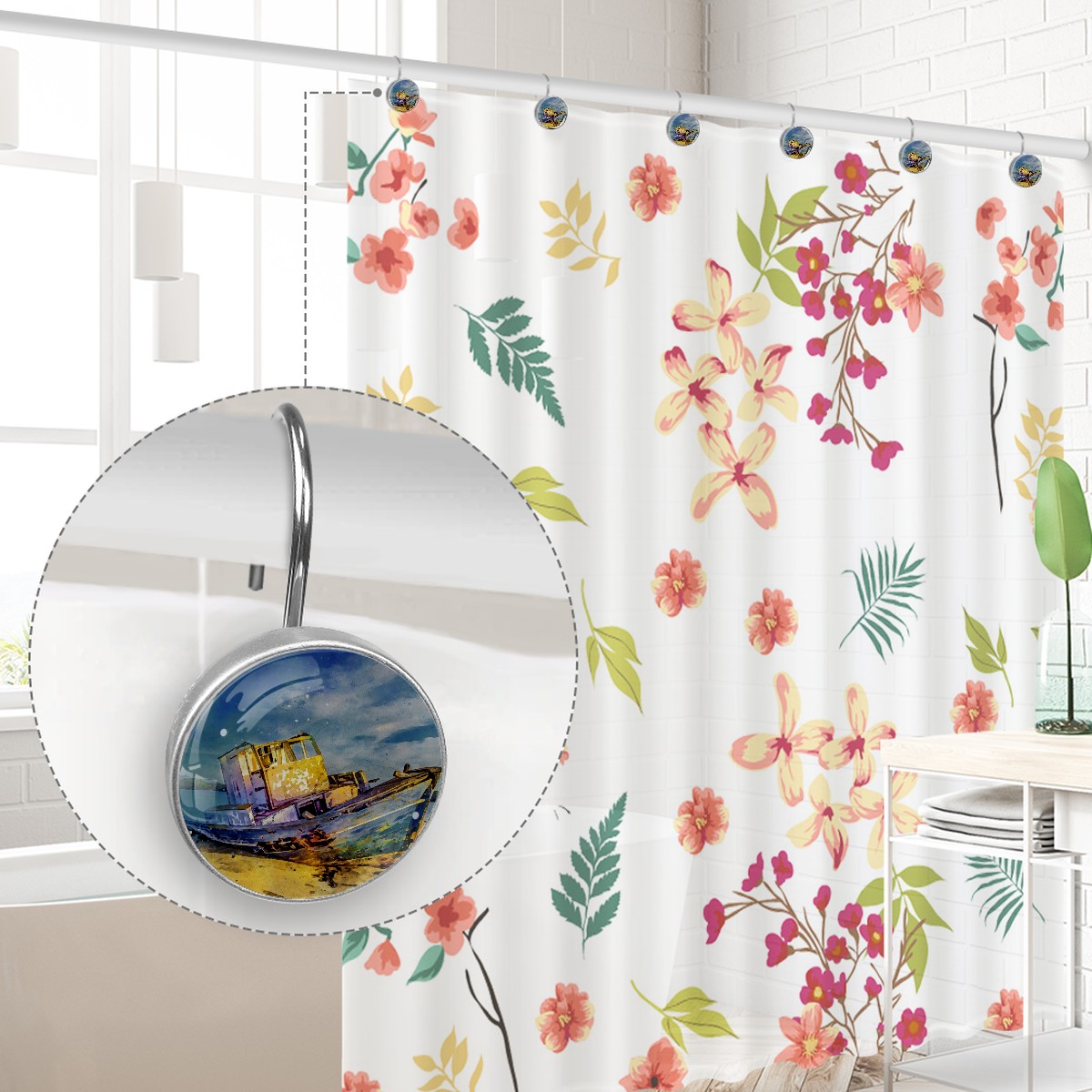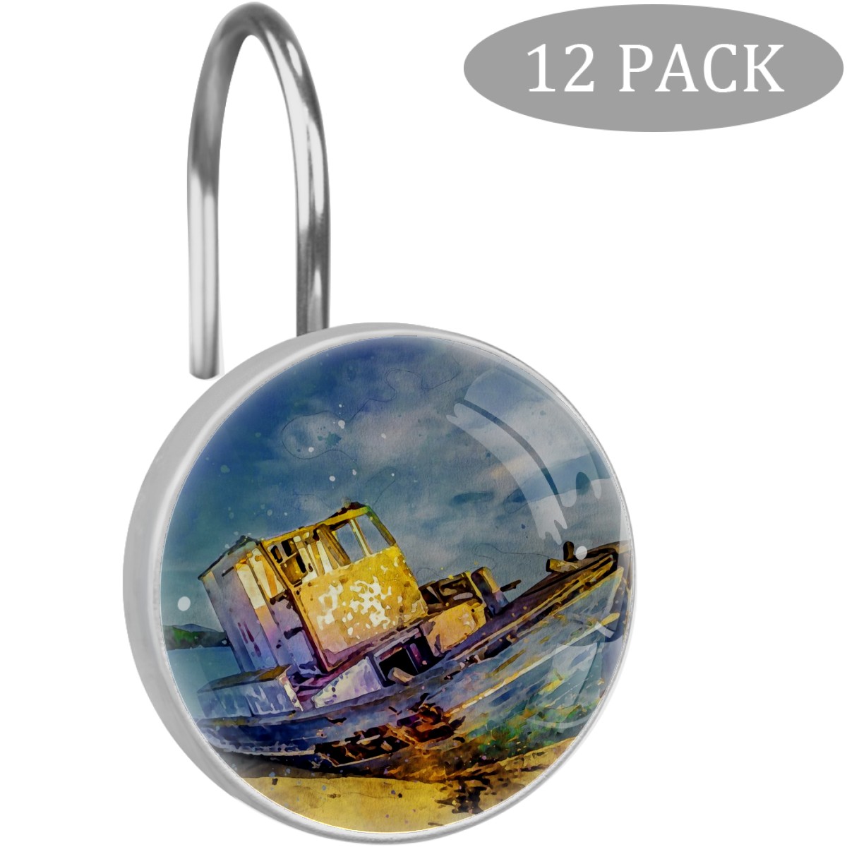 Decorative Shower Curtain Hooks Set of 12 Boat Sea Sky Landscape Nature Resin Shower Hooks for Curtain Shower Rings for Bathroom Home Hotel Shower Rods