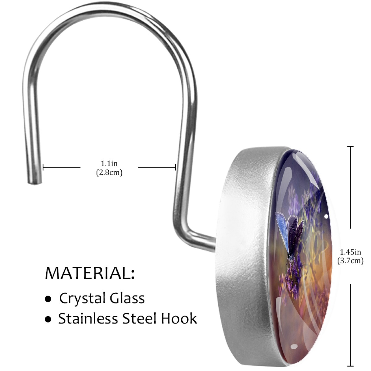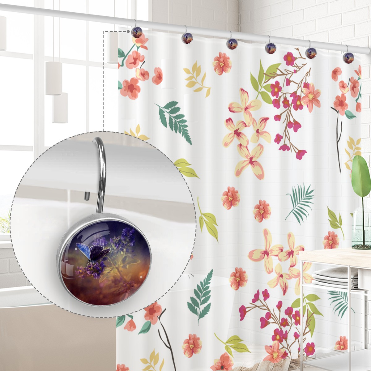 <p>This set of 12 durable hooks attach easily to any standard shower curtain, liner, and rod system to keep the curtain securely attached and evenly draped. </p><p>&nbsp;</p><p>- Impressively durable with sturdiness to hold up any shower curtain.</p><p>&nbsp;</p><p>- <b>Easy to install</b>: simply thread through existing holes and hang over shower rod.</p><p>&nbsp;</p><p>- Vibrant print on one side which adds style to your shower rod.</p><p>&nbsp;</p><p>- Astoundingly gorgeous design to <b>Decorate your bathroom</b>.</p><p>&nbsp;</p><p><b>Package Including</b></p><p>12*Shower Curtain Hooks</p><p>&nbsp;</p><p><b>Notes</b></p><p>1. Due to the different monitor and light effect, the actual color of the item might be slightly different from the color showed on the pictures. Thank you!</p><p>2. Please allow 2-3cm measuring deviation due to manual measurement.</p>