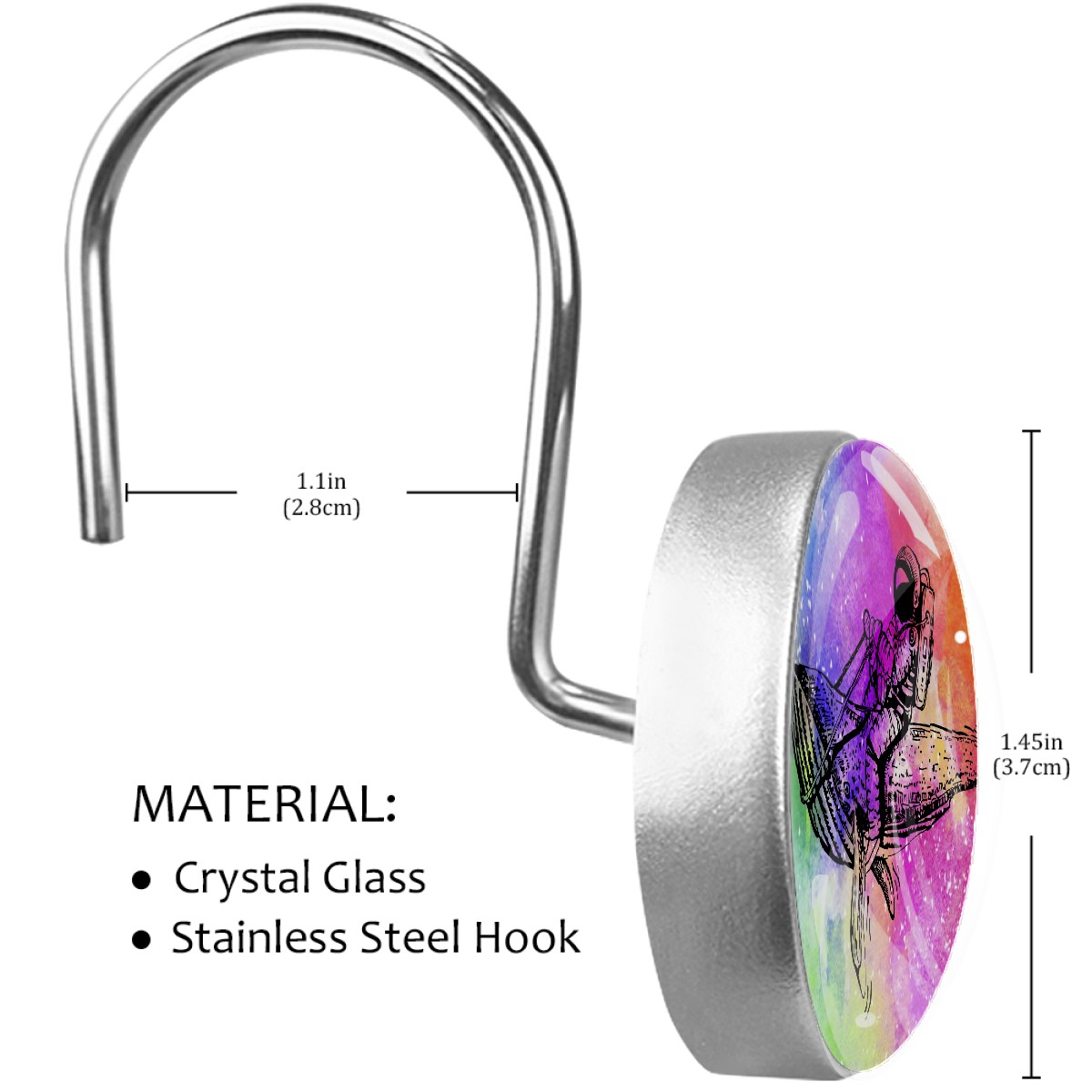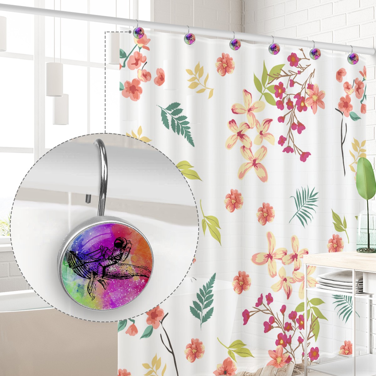 <p>This set of 12 durable hooks attach easily to any standard shower curtain, liner, and rod system to keep the curtain securely attached and evenly draped. </p><p>&nbsp;</p><p>- Impressively durable with sturdiness to hold up any shower curtain.</p><p>&nbsp;</p><p>- <b>Easy to install</b>: simply thread through existing holes and hang over shower rod.</p><p>&nbsp;</p><p>- Vibrant print on one side which adds style to your shower rod.</p><p>&nbsp;</p><p>- Astoundingly gorgeous design to <b>Decorate your bathroom</b>.</p><p>&nbsp;</p><p><b>Package Including</b></p><p>12*Shower Curtain Hooks</p><p>&nbsp;</p><p><b>Notes</b></p><p>1. Due to the different monitor and light effect, the actual color of the item might be slightly different from the color showed on the pictures. Thank you!</p><p>2. Please allow 2-3cm measuring deviation due to manual measurement.</p>