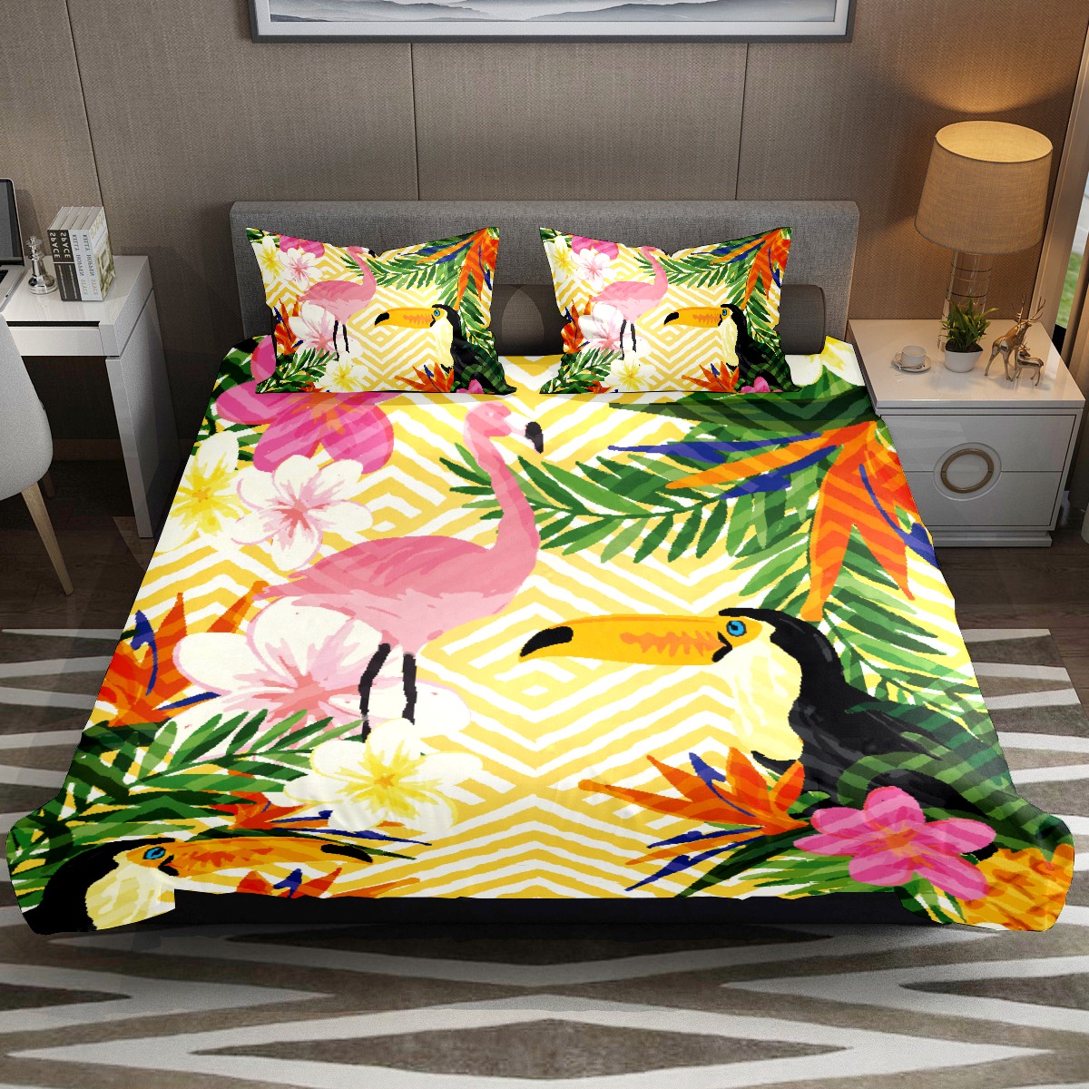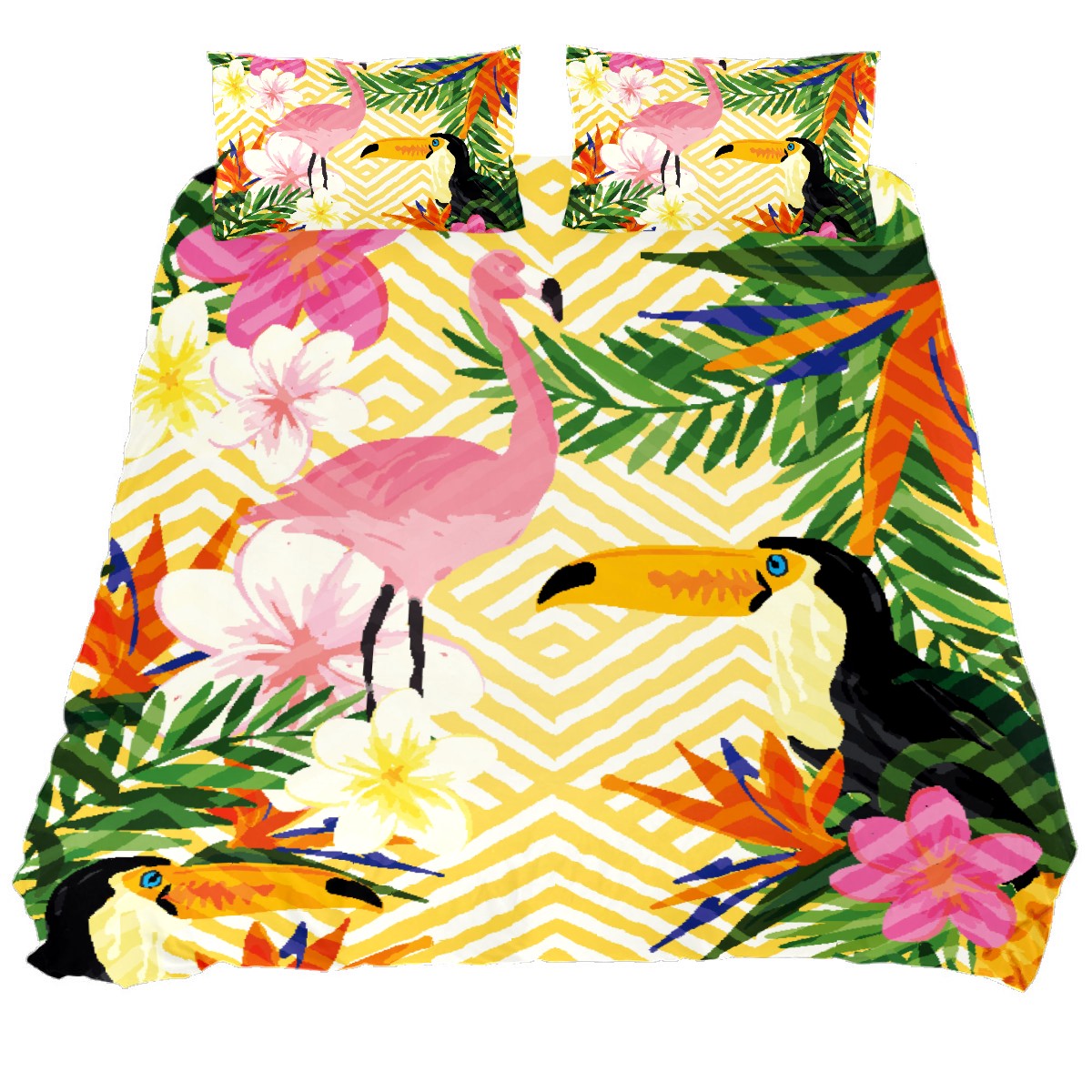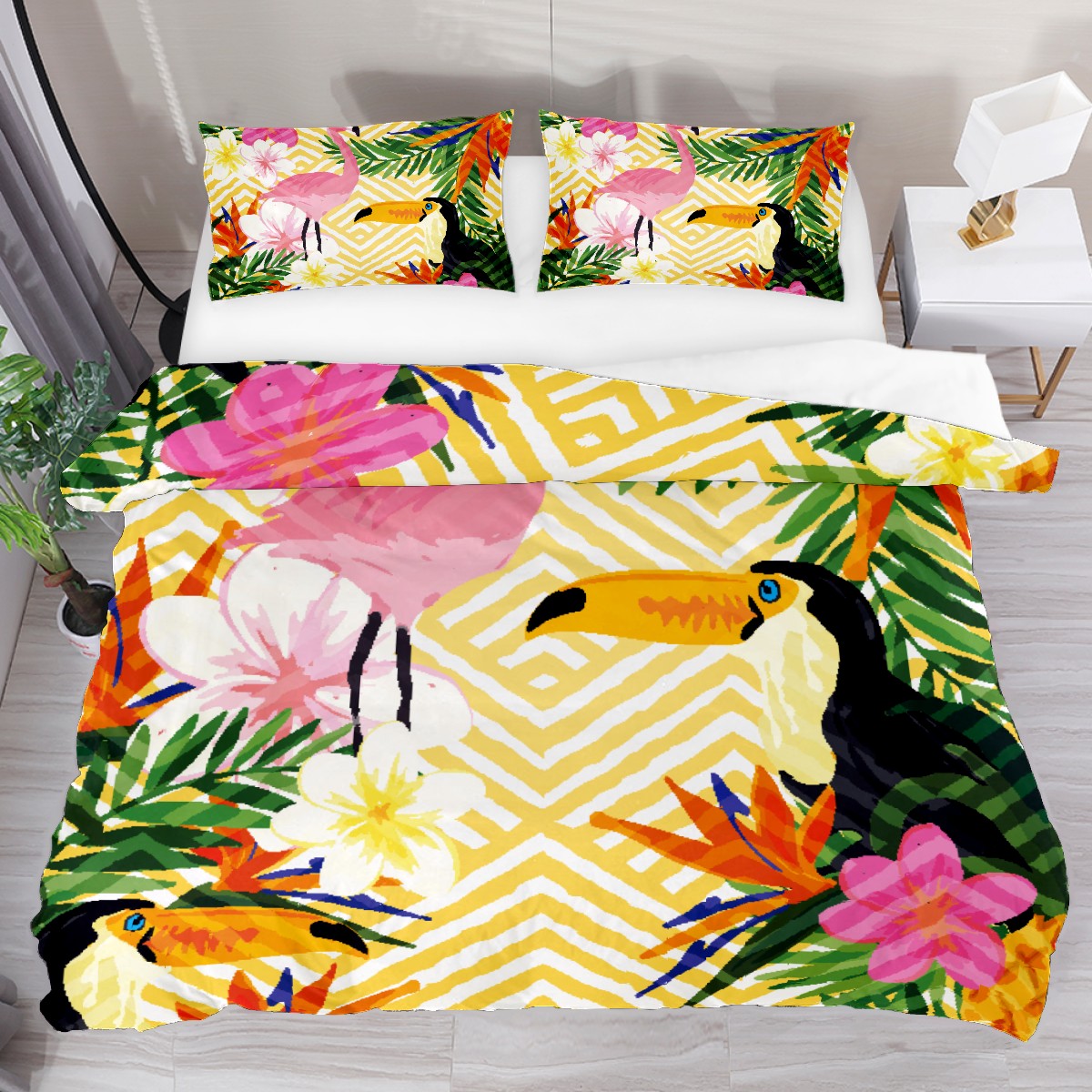 3 Piece Duvet Cover Set, Flower Toucan And Flamingo Bedding Set Twin Size, Luxury Ultra Soft Breathable Comforter Cover Set (1 Duvet Cover + 2 Pillowcases)