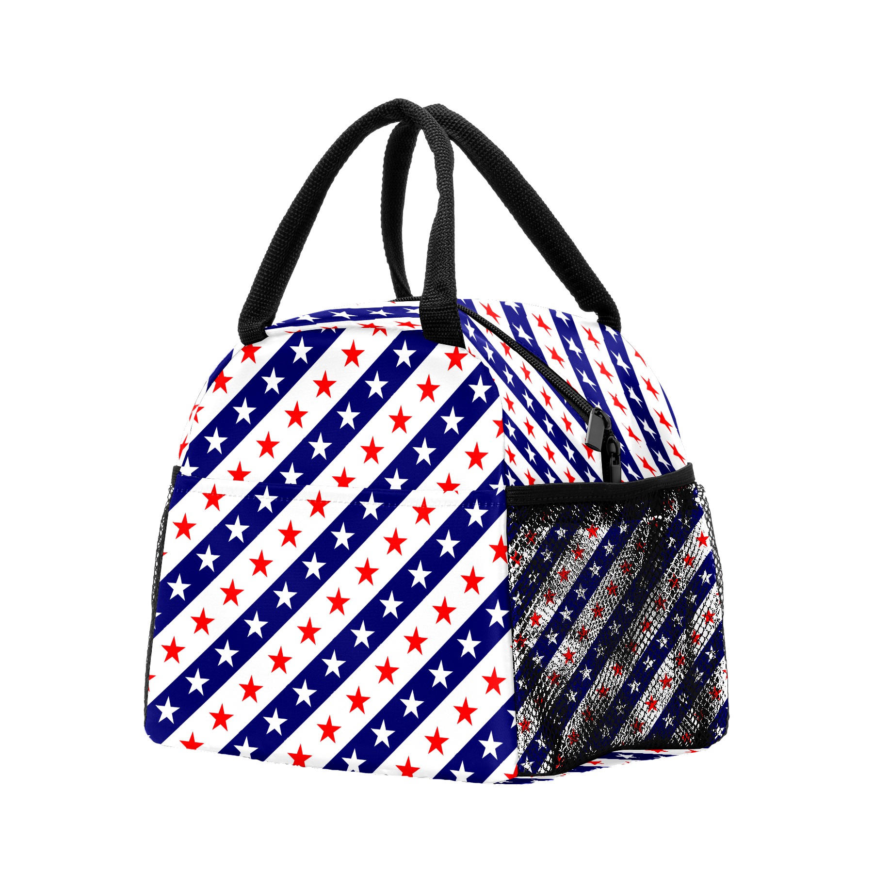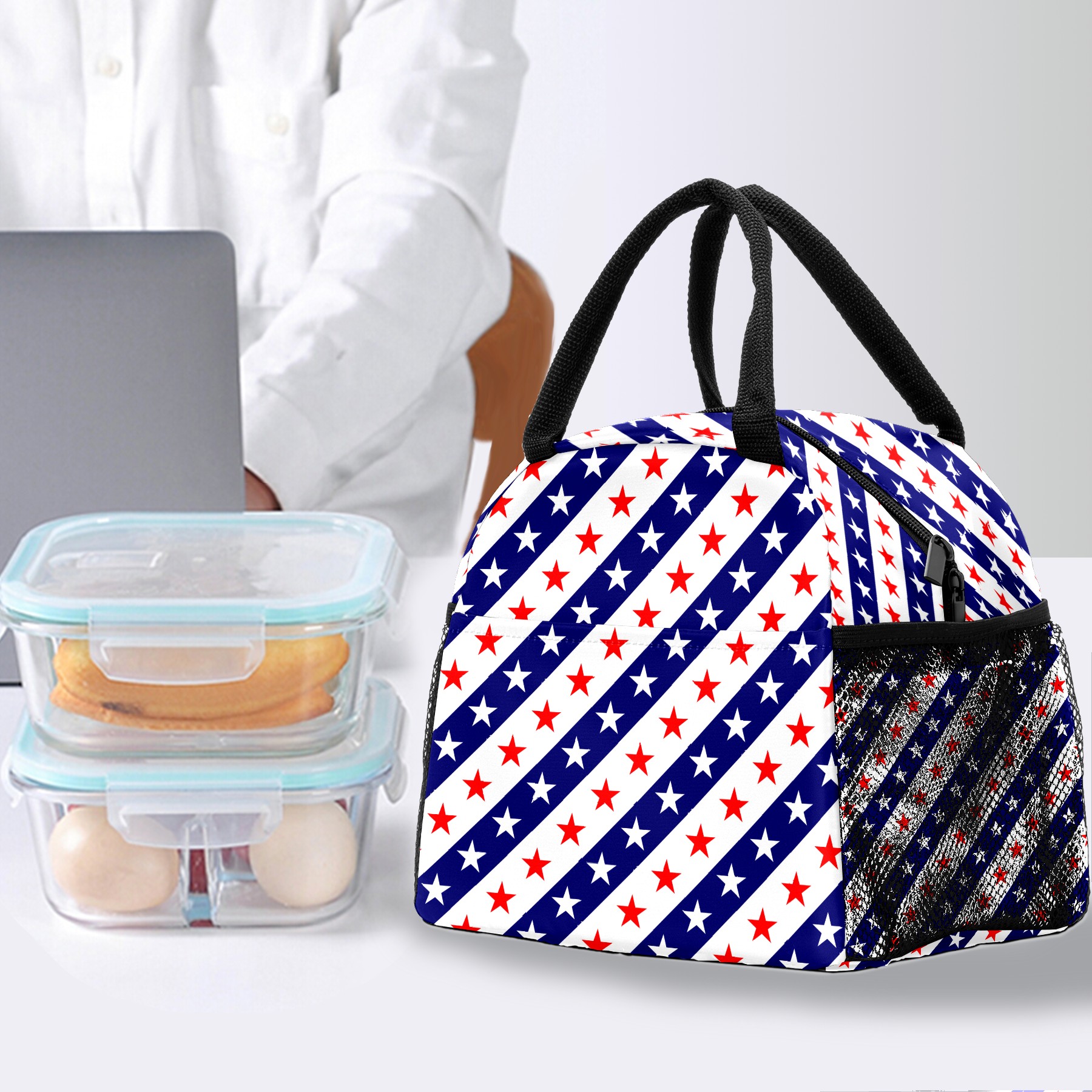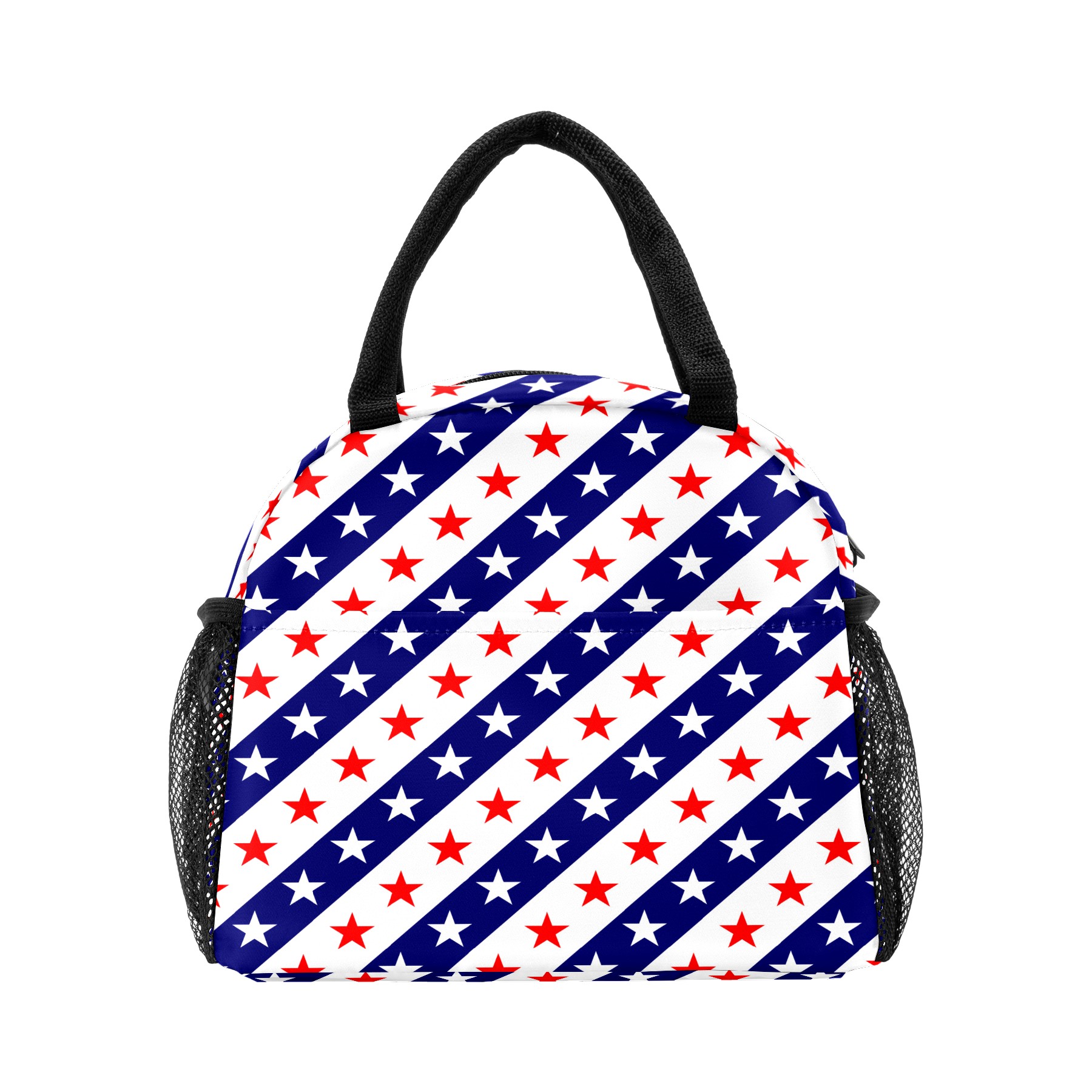 Lunch Bag for Women Men, USA Flag Blue White Red Stars Stripes Insulated Reusable Lunch Box Thermal Cooler Tote Bag for Work Picnic Hiking Travel Beach