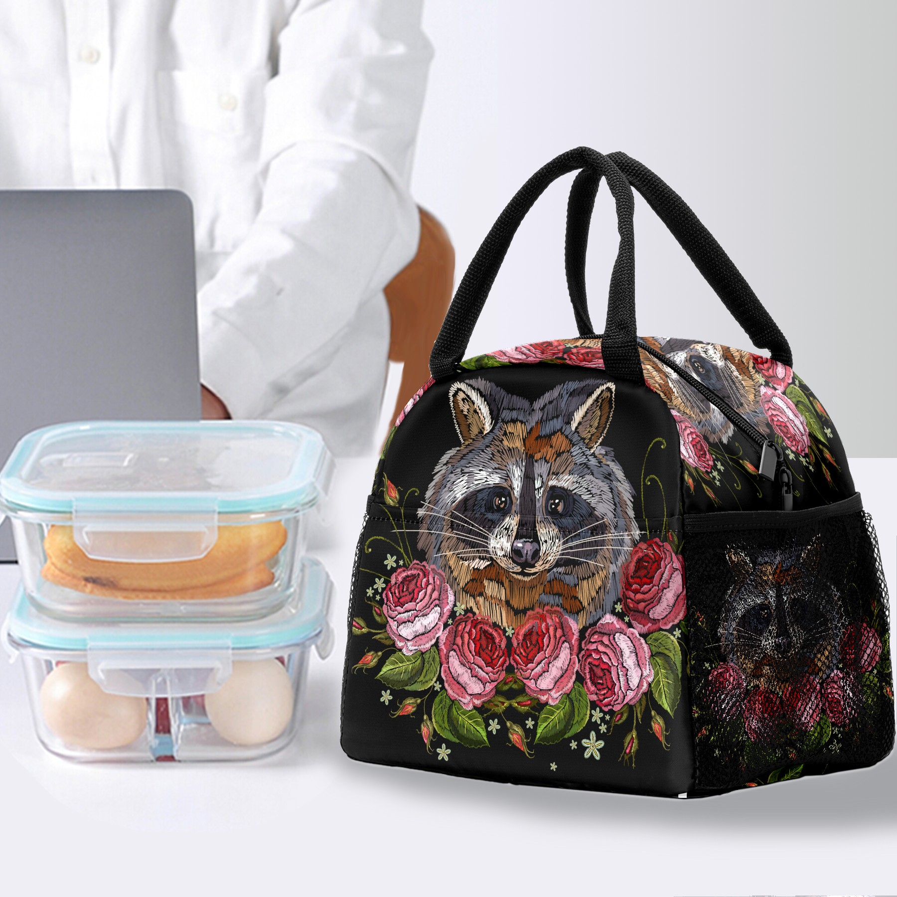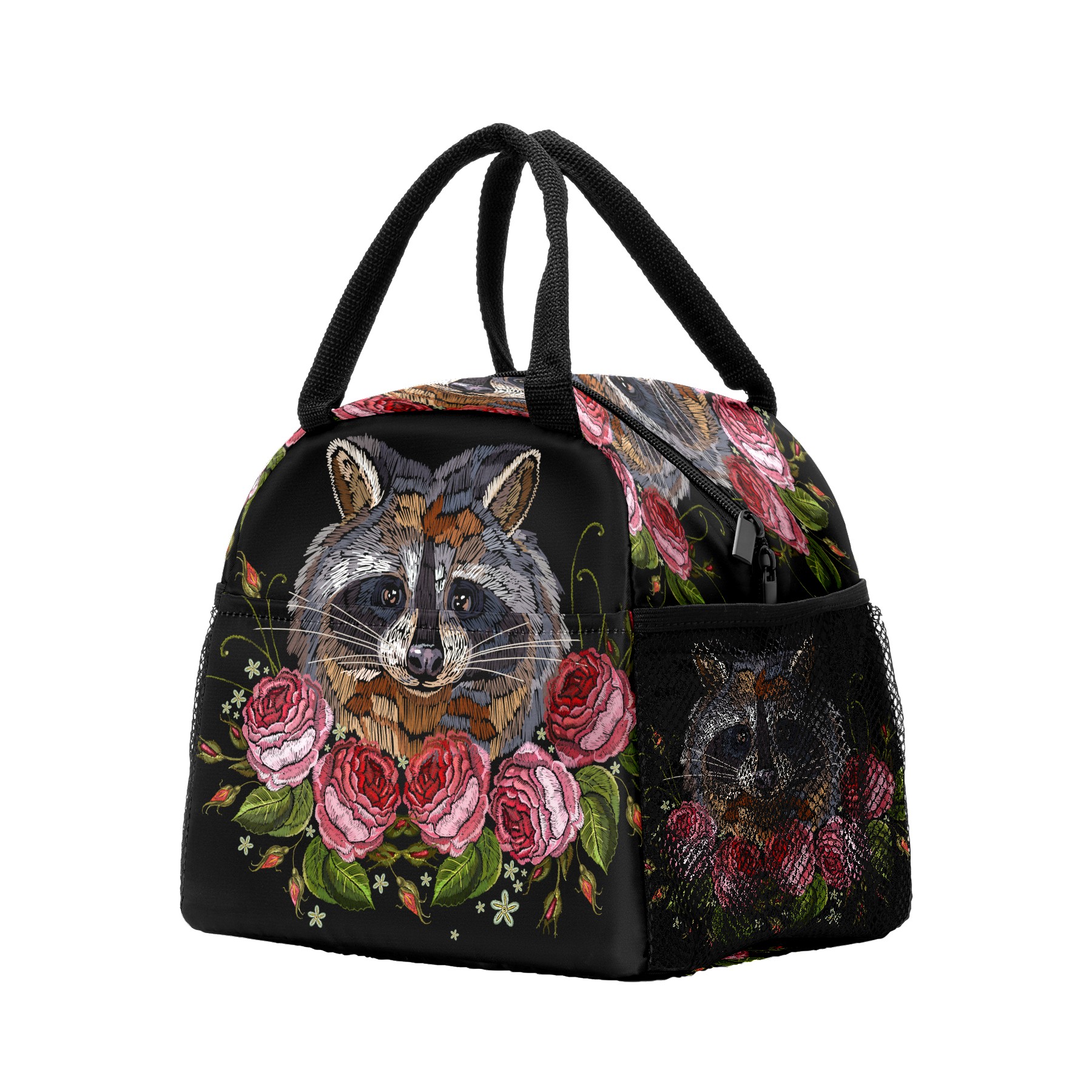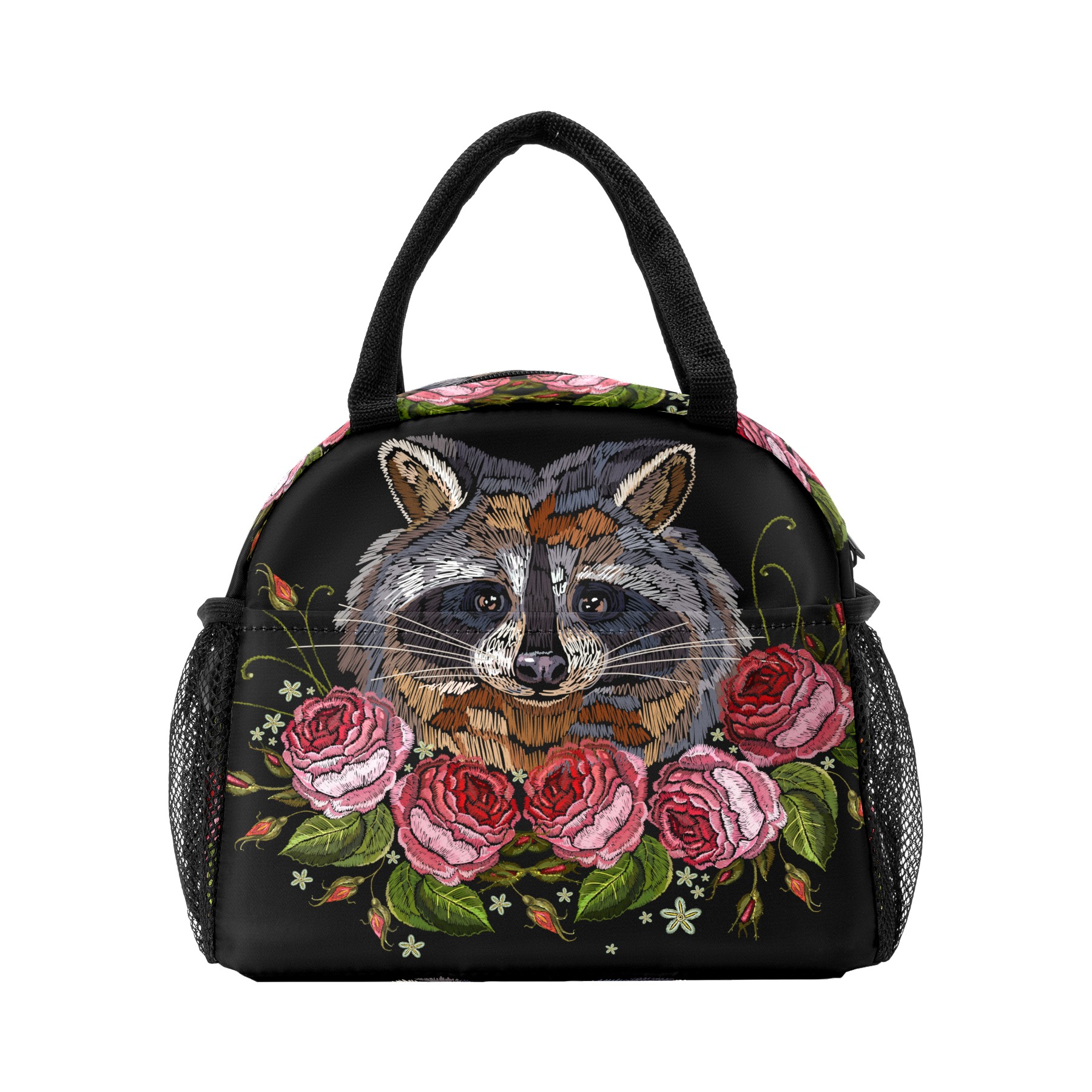 Lunch Bag for Women Men, Retro Embroidery Raccoon Rose Insulated Reusable Lunch Box Thermal Cooler Tote Bag for Work Picnic Hiking Travel Beach