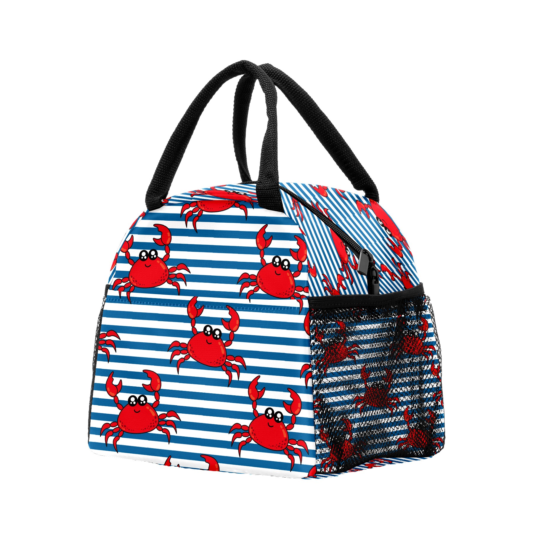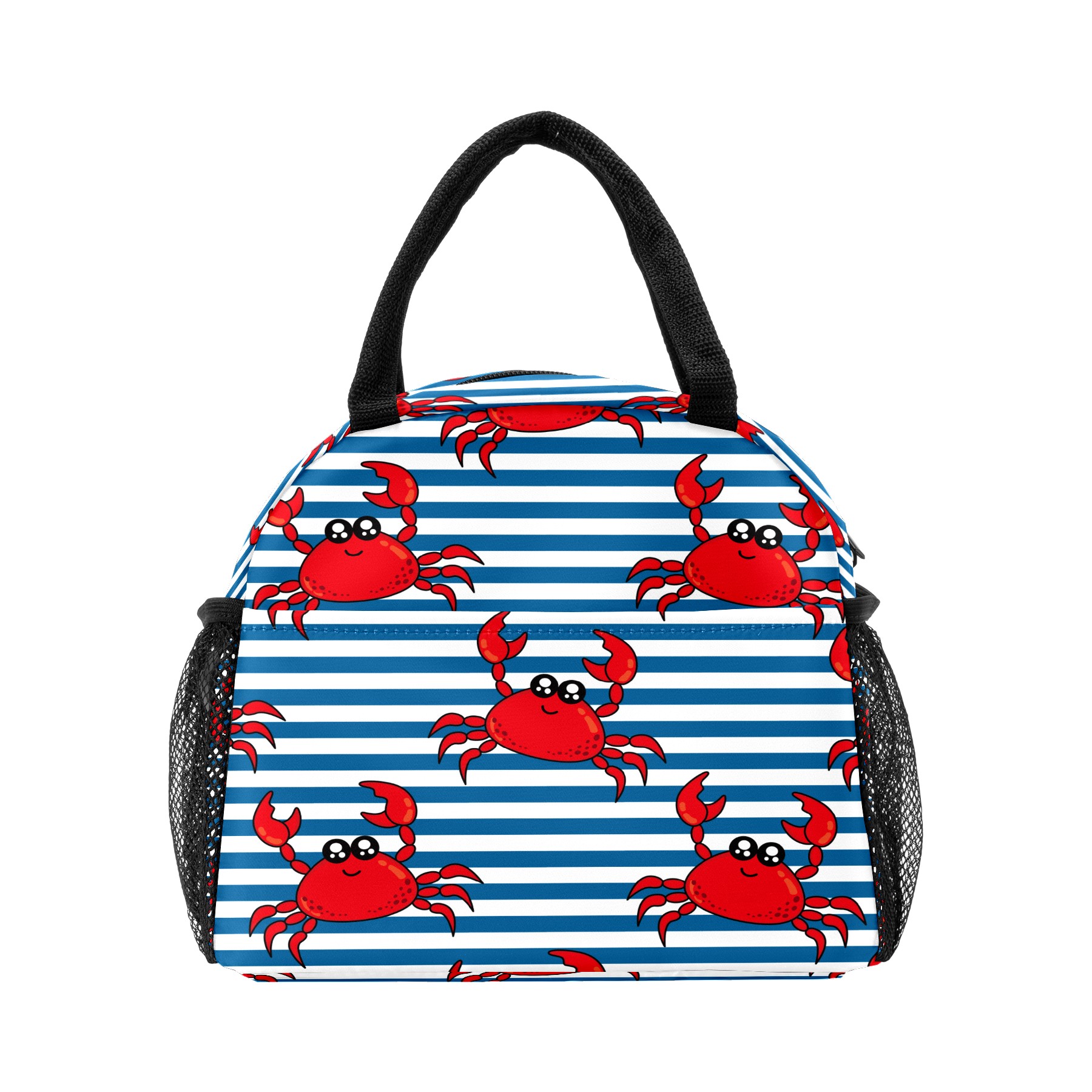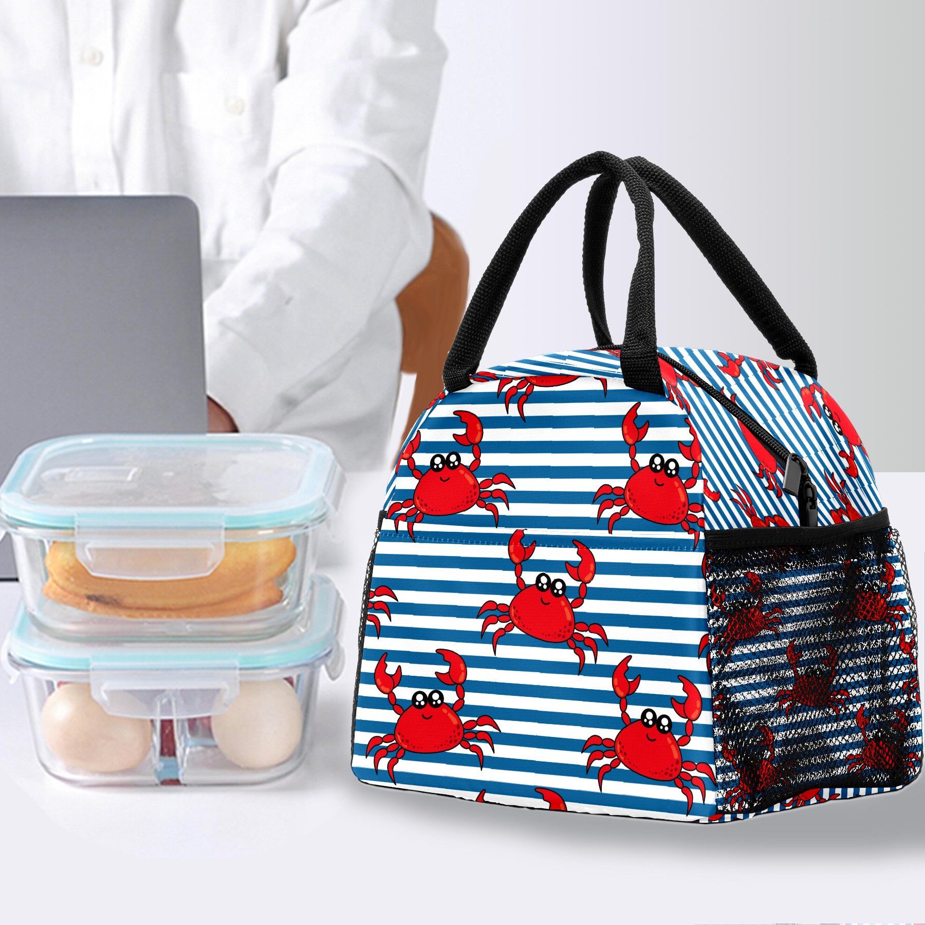 Lunch Bag for Women Men, Red Crabs Blue White Stipes Insulated Reusable Lunch Box Thermal Cooler Tote Bag for Work Picnic Hiking Travel Beach
