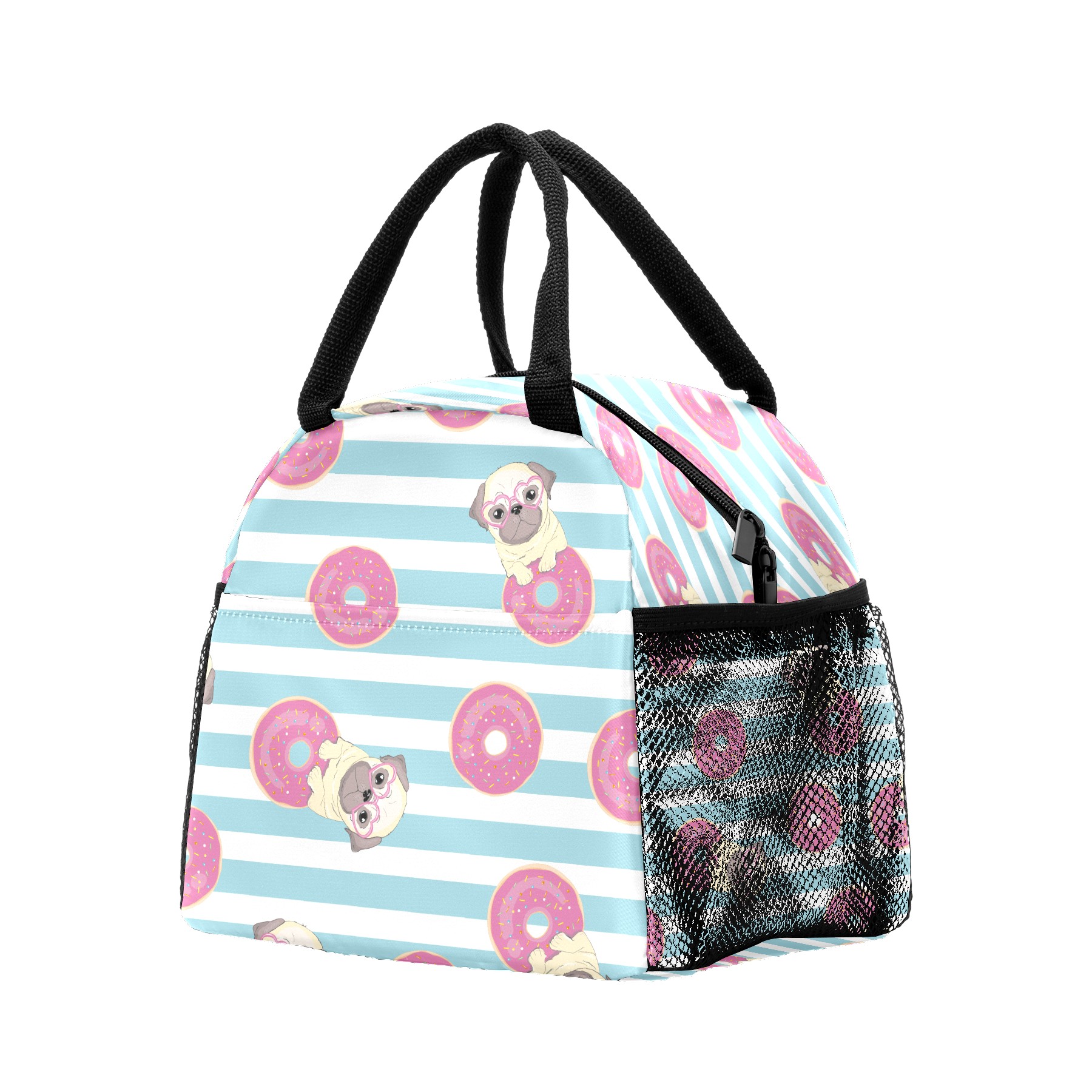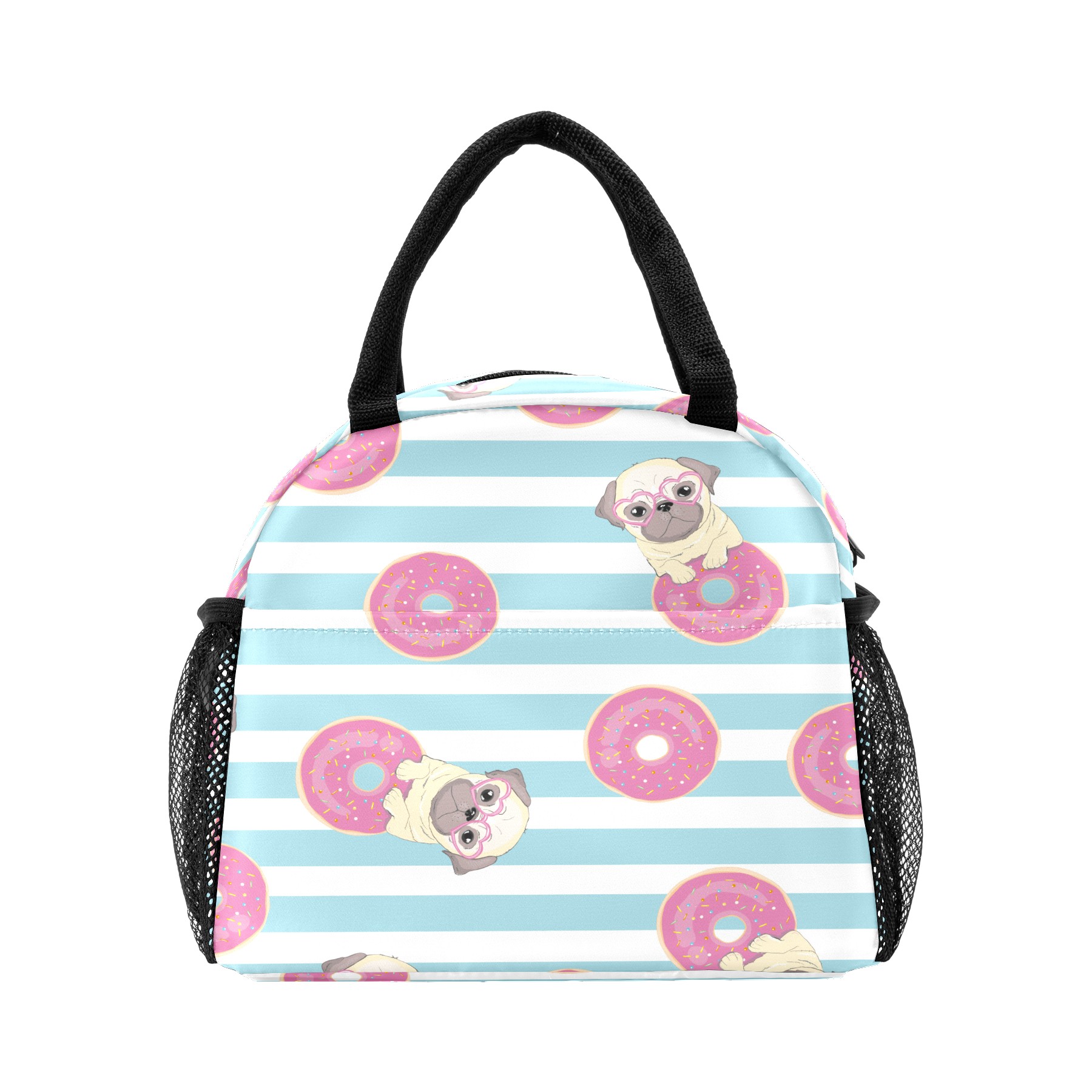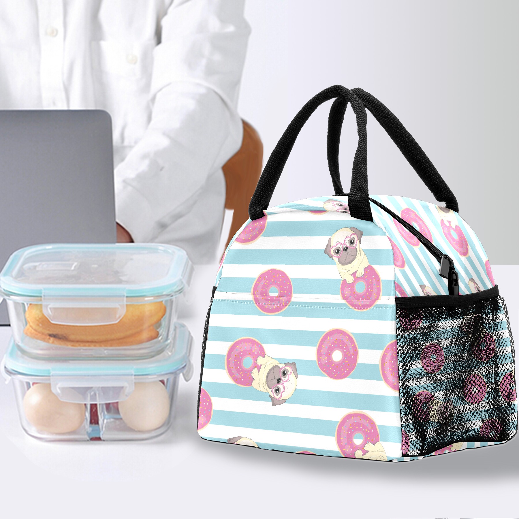 Lunch Bag for Women Men, Funny Pug With Donuts Pattern Insulated Reusable Lunch Box Thermal Cooler Tote Bag for Work Picnic Hiking Travel Beach
