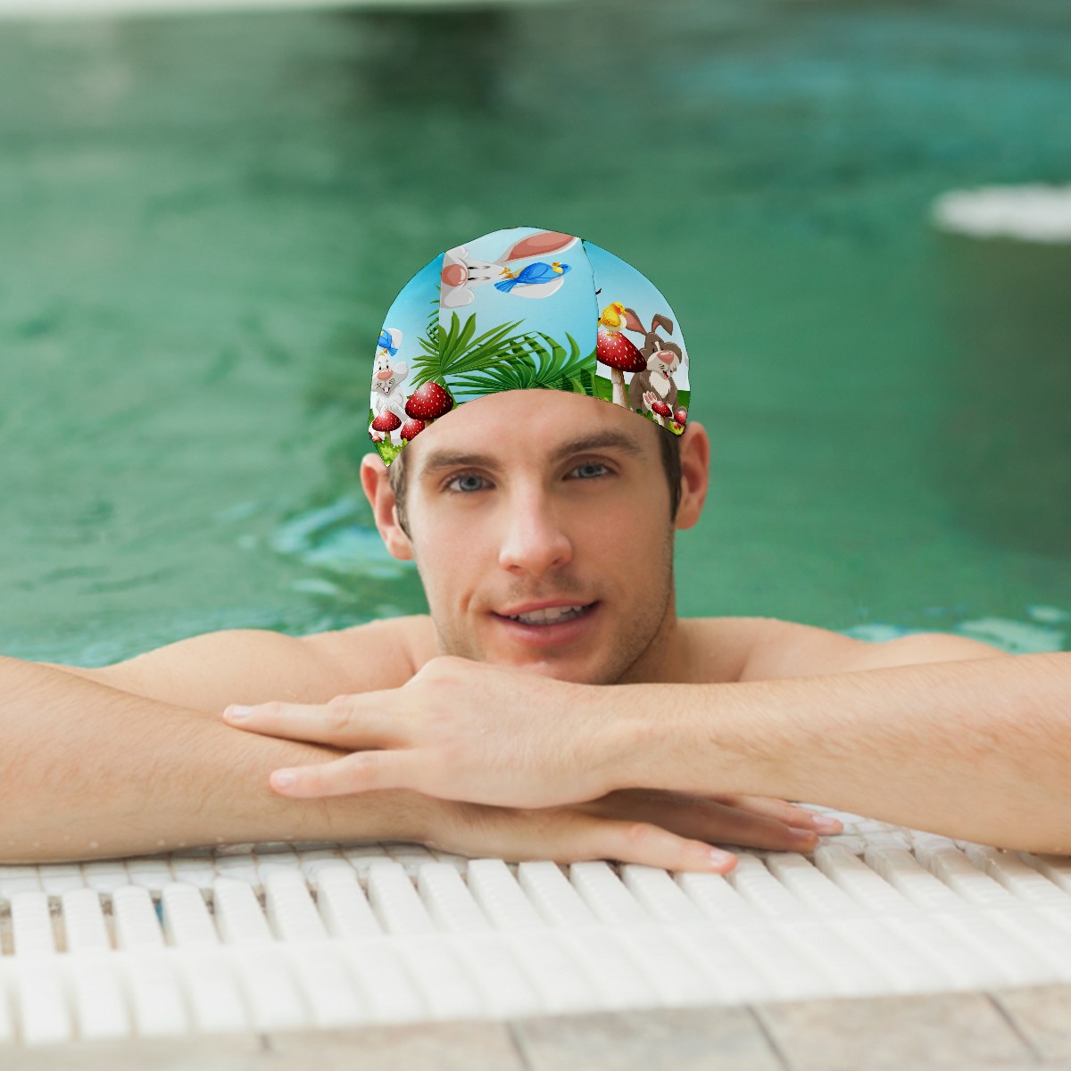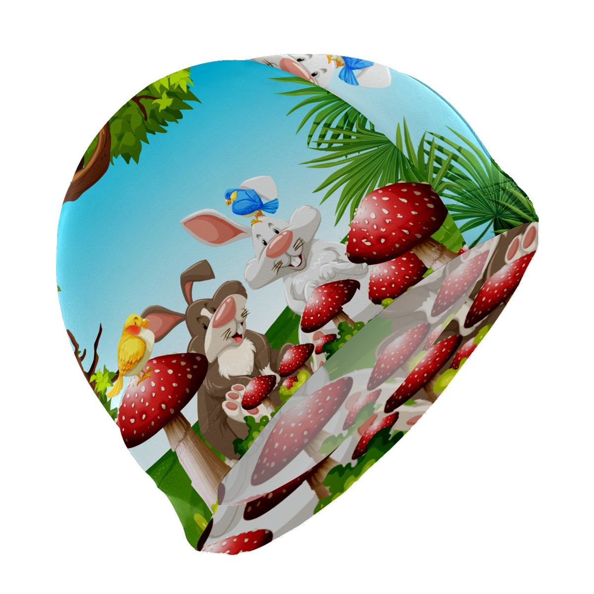 Swim Caps Cartoon Rabbits And Birds In The Garden With Mushroom Swimming Cap Hat Bathing Shower Hair Cover for Adult Men Women Girls Boys