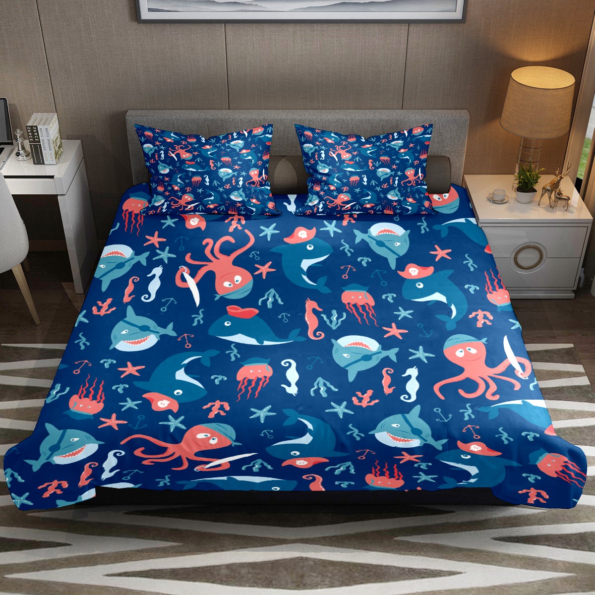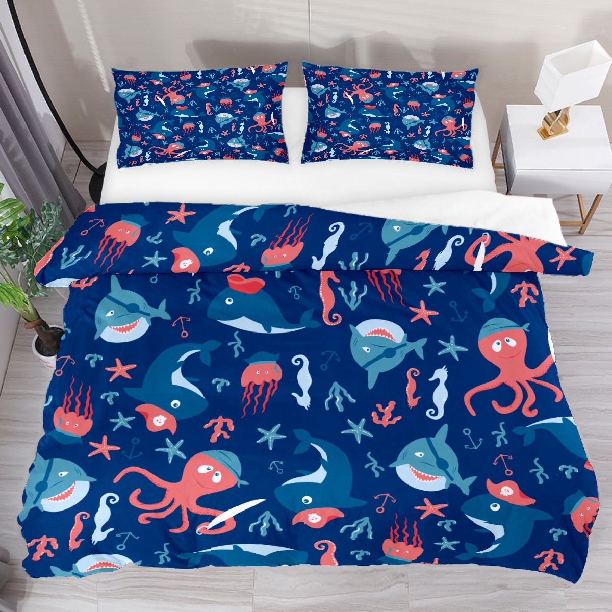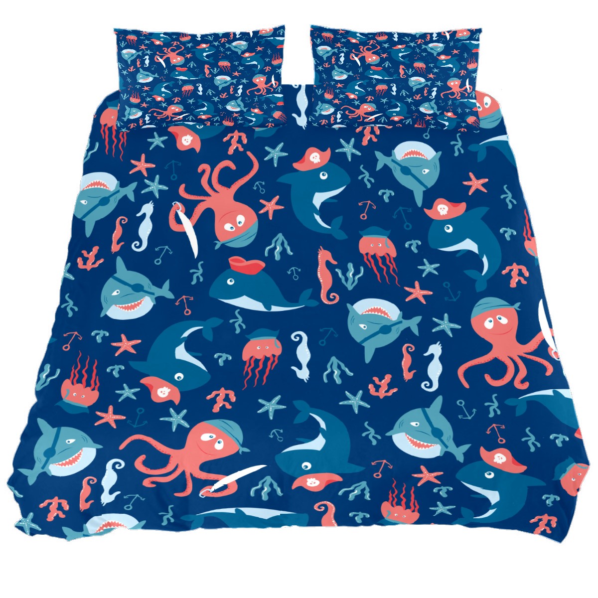 Duvet Cover Twin Ocean Octopus Shark 3pcs Bedding Duvet Cover Set Modern Quilt Cover Microfiber Comforter Cover with Button Closure with 2 Pillow Cases 1 Duvet Cover