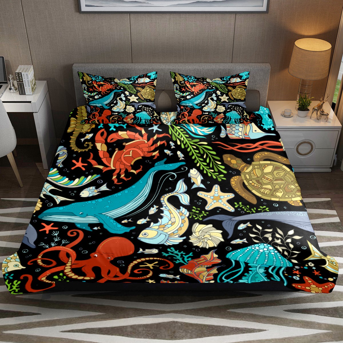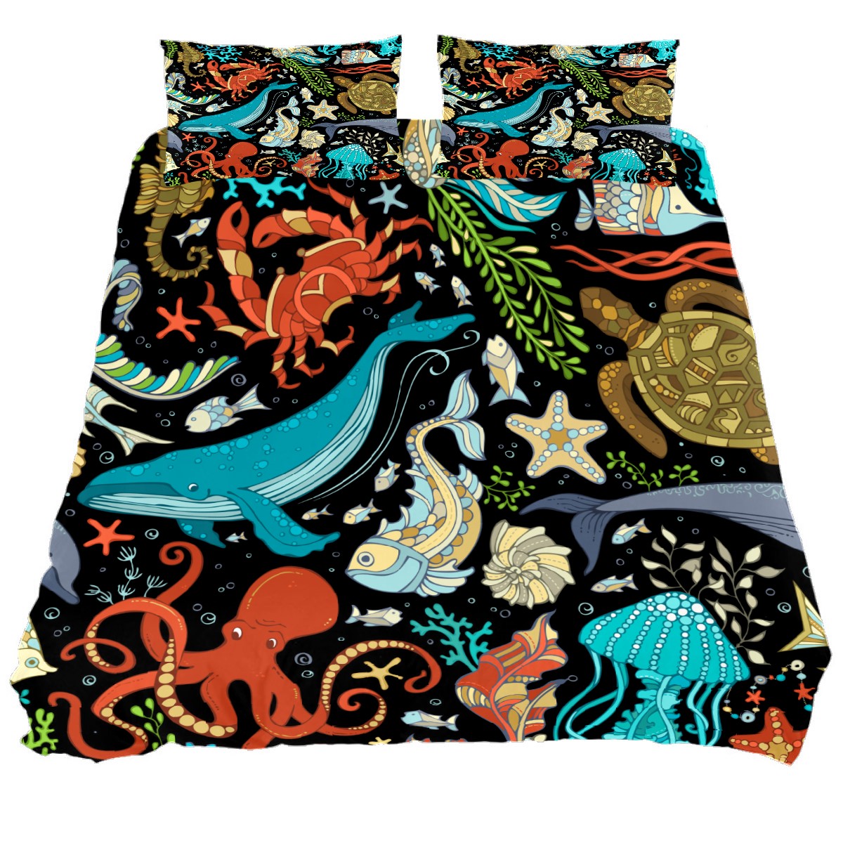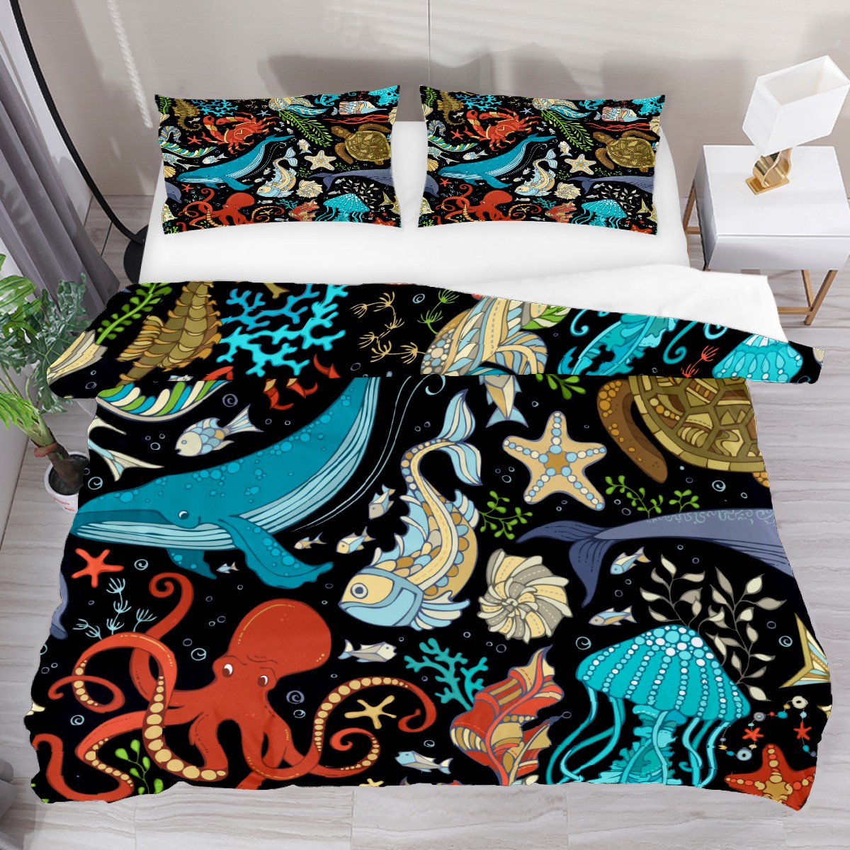 Duvet Cover Twin Ocean Marine Animals Colorful 3pcs Bedding Duvet Cover Set Modern Quilt Cover Microfiber Comforter Cover with Button Closure with 2 Pillow Cases 1 Duvet Cover