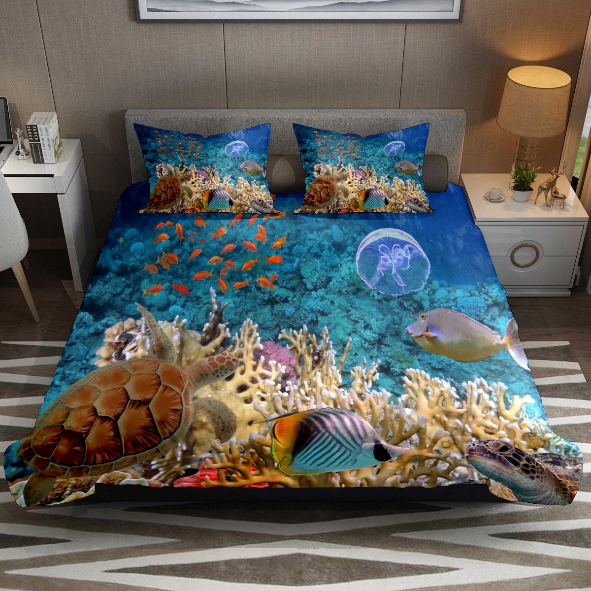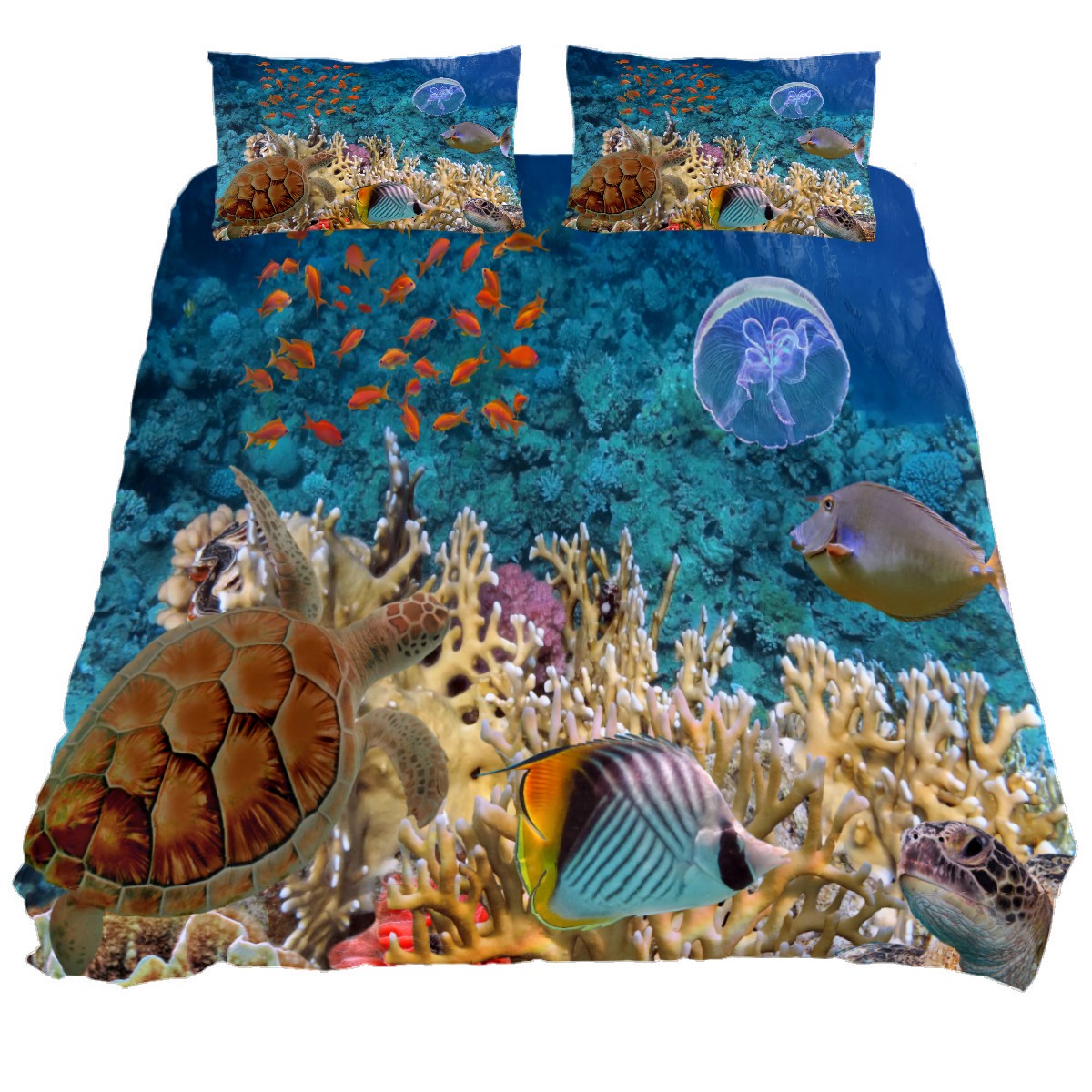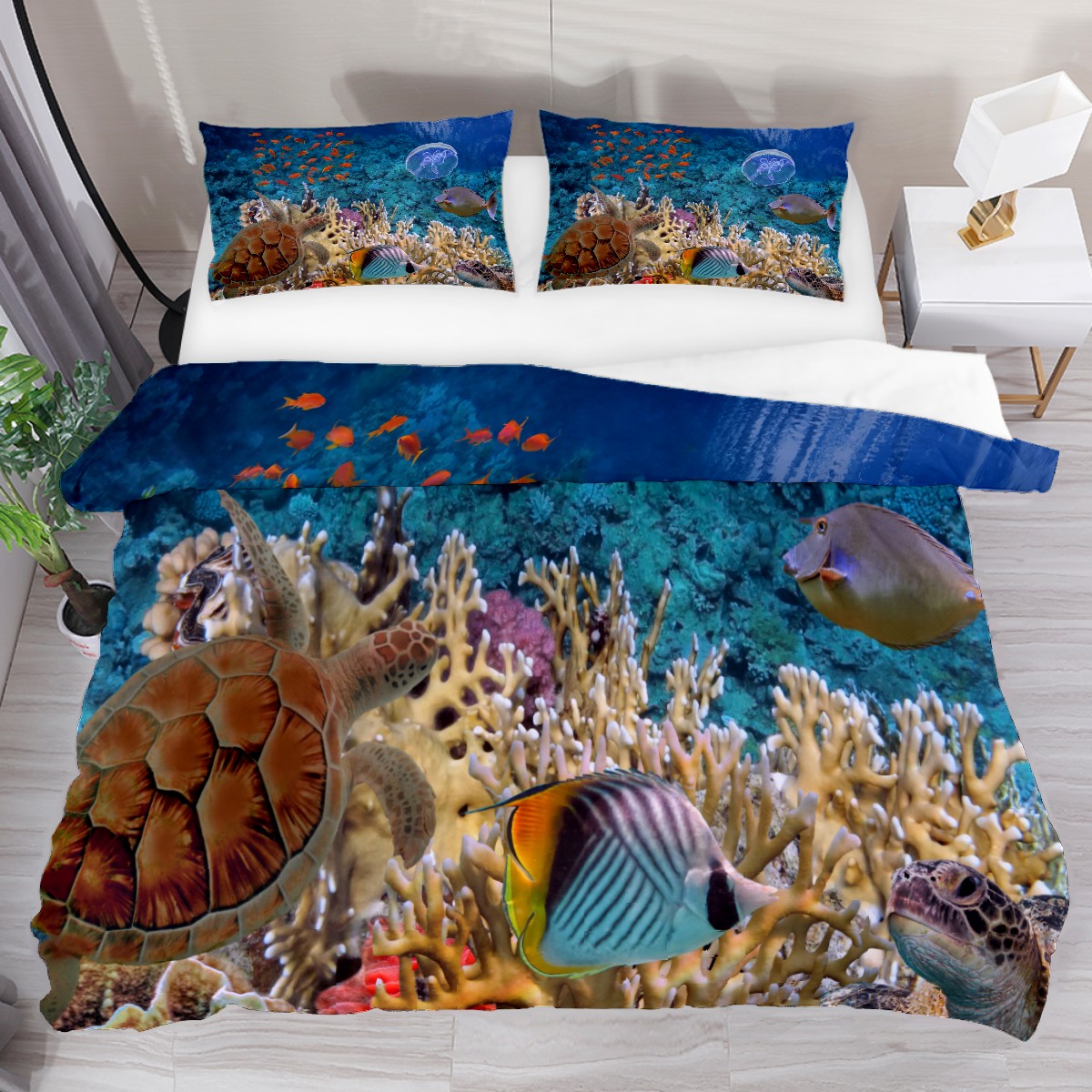 Duvet Cover Twin Ocean Fish Tortoise 3pcs Bedding Duvet Cover Set Modern Quilt Cover Microfiber Comforter Cover with Button Closure with 2 Pillow Cases 1 Duvet Cover