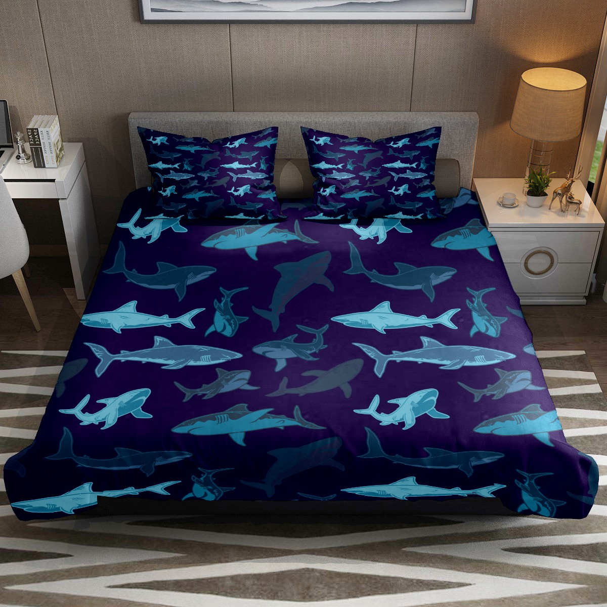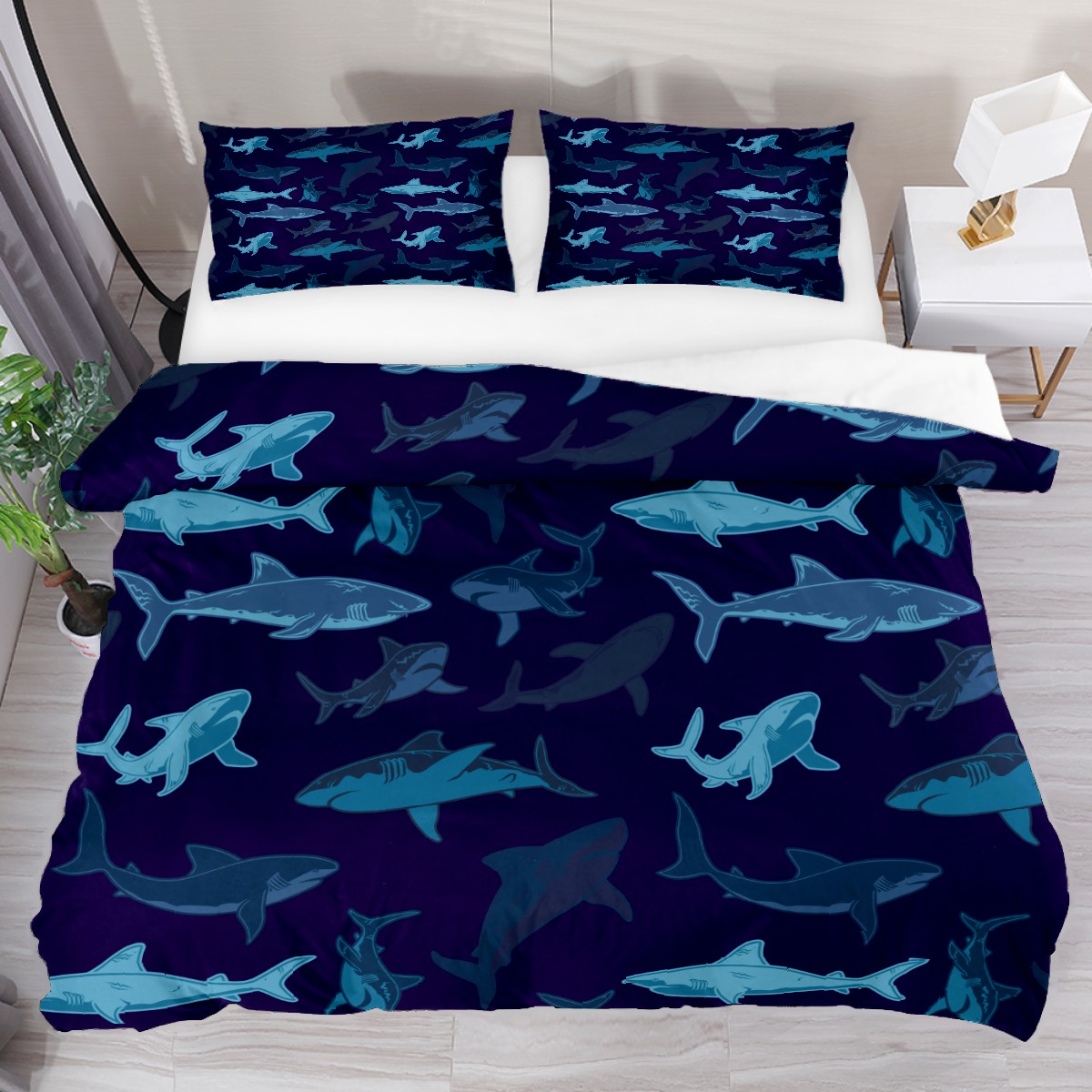Duvet Cover Twin Ocean Blue Shark Pattern 3pcs Bedding Duvet Cover Set Modern Quilt Cover Microfiber Comforter Cover with Button Closure with 2 Pillow Cases 1 Duvet Cover