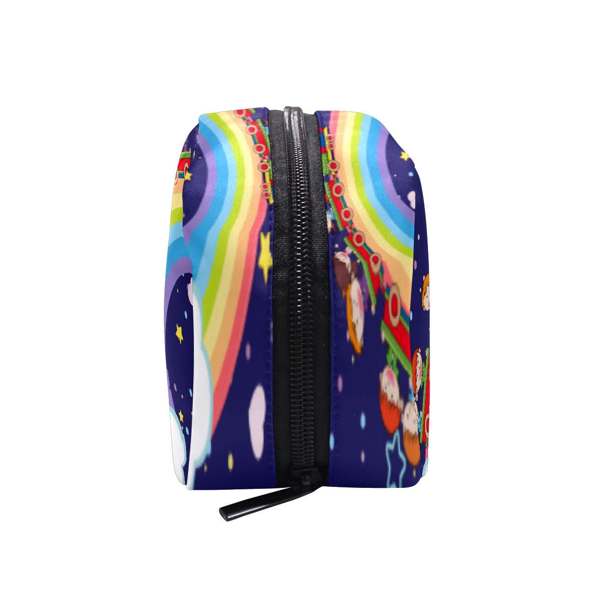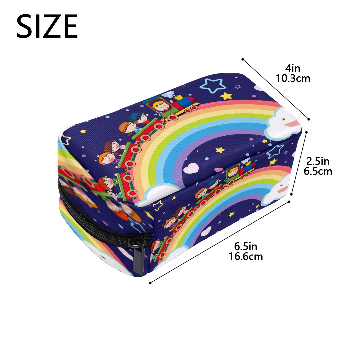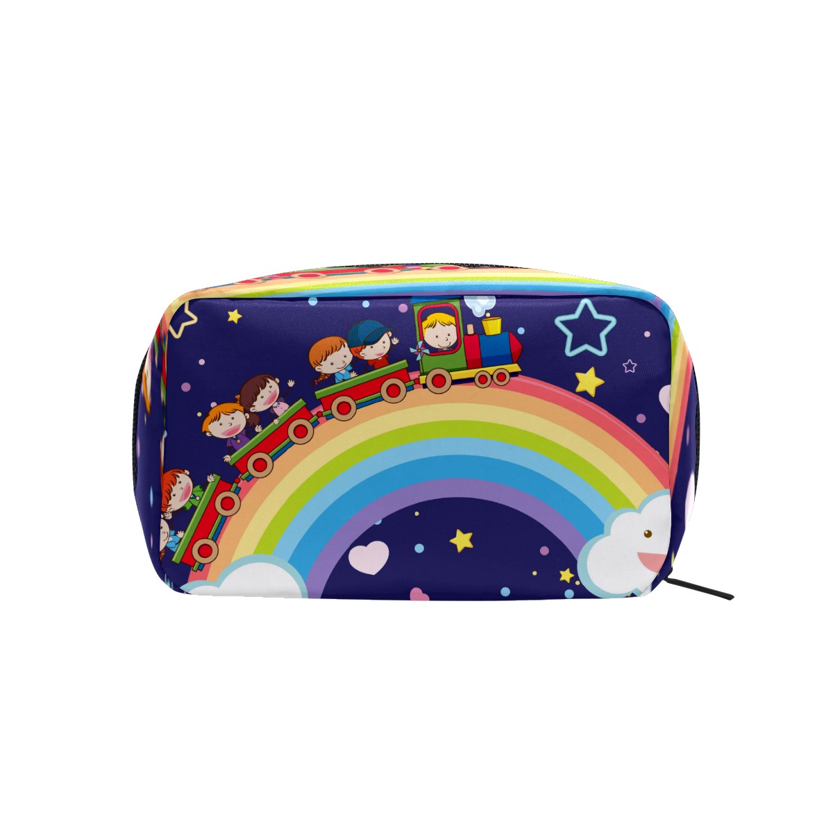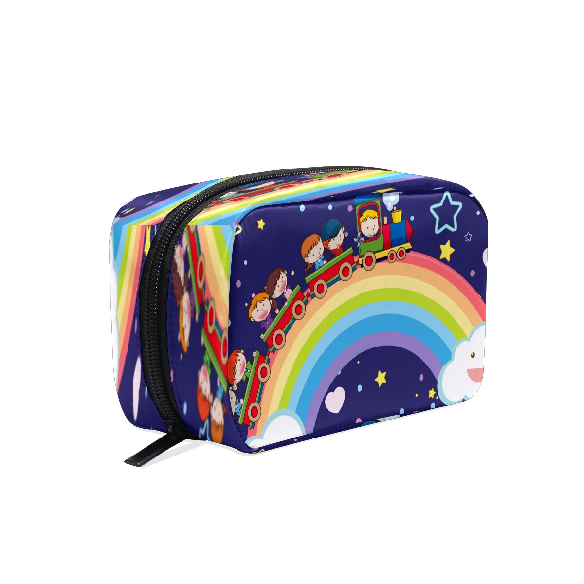 Cosmetic Bag for Women Girls Trave Makeup Bag Toiletry Case Pouch Accessories Organizer Funny Cartoon Kids Taking Train Over The Rainbow Clouds