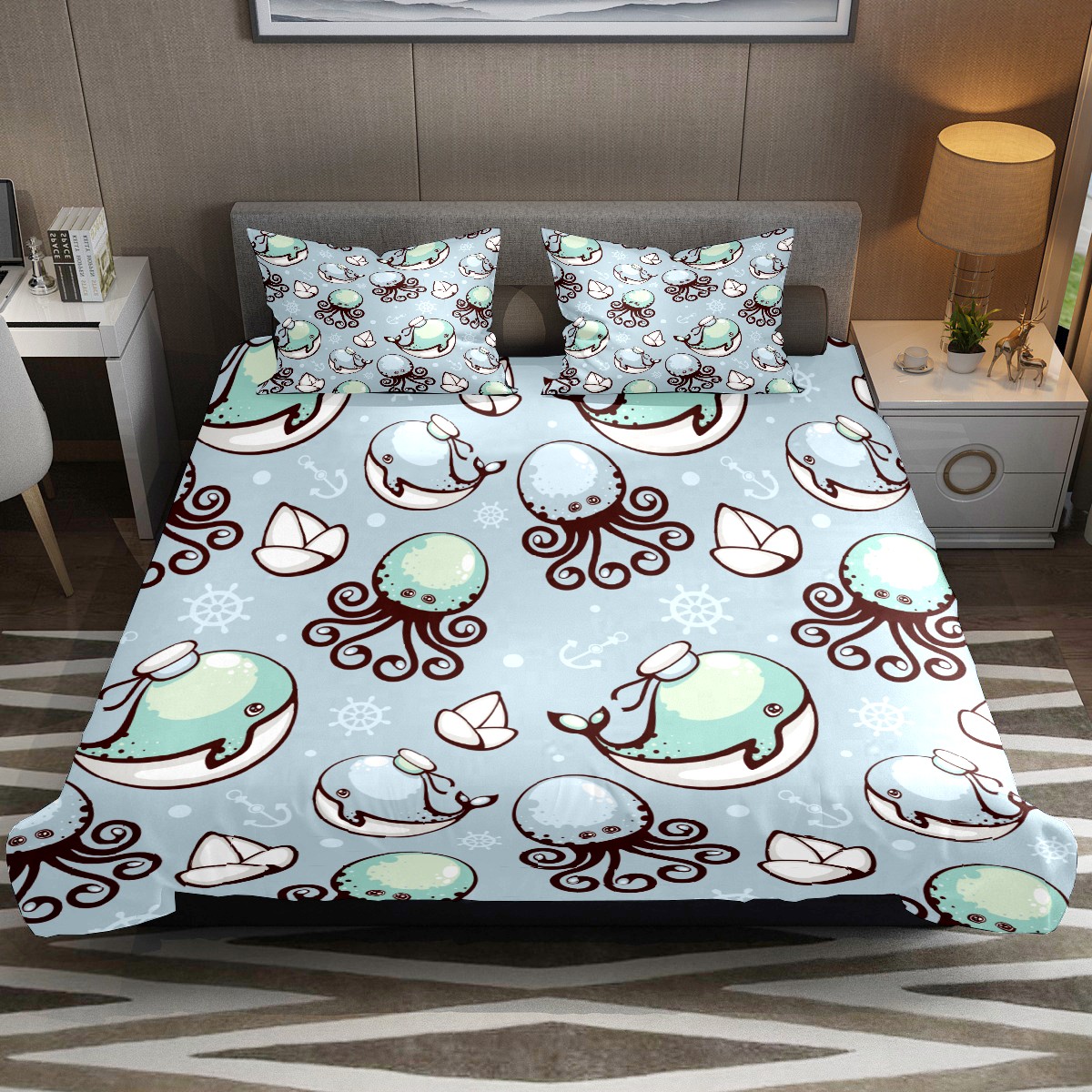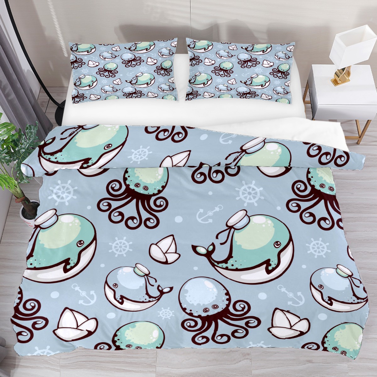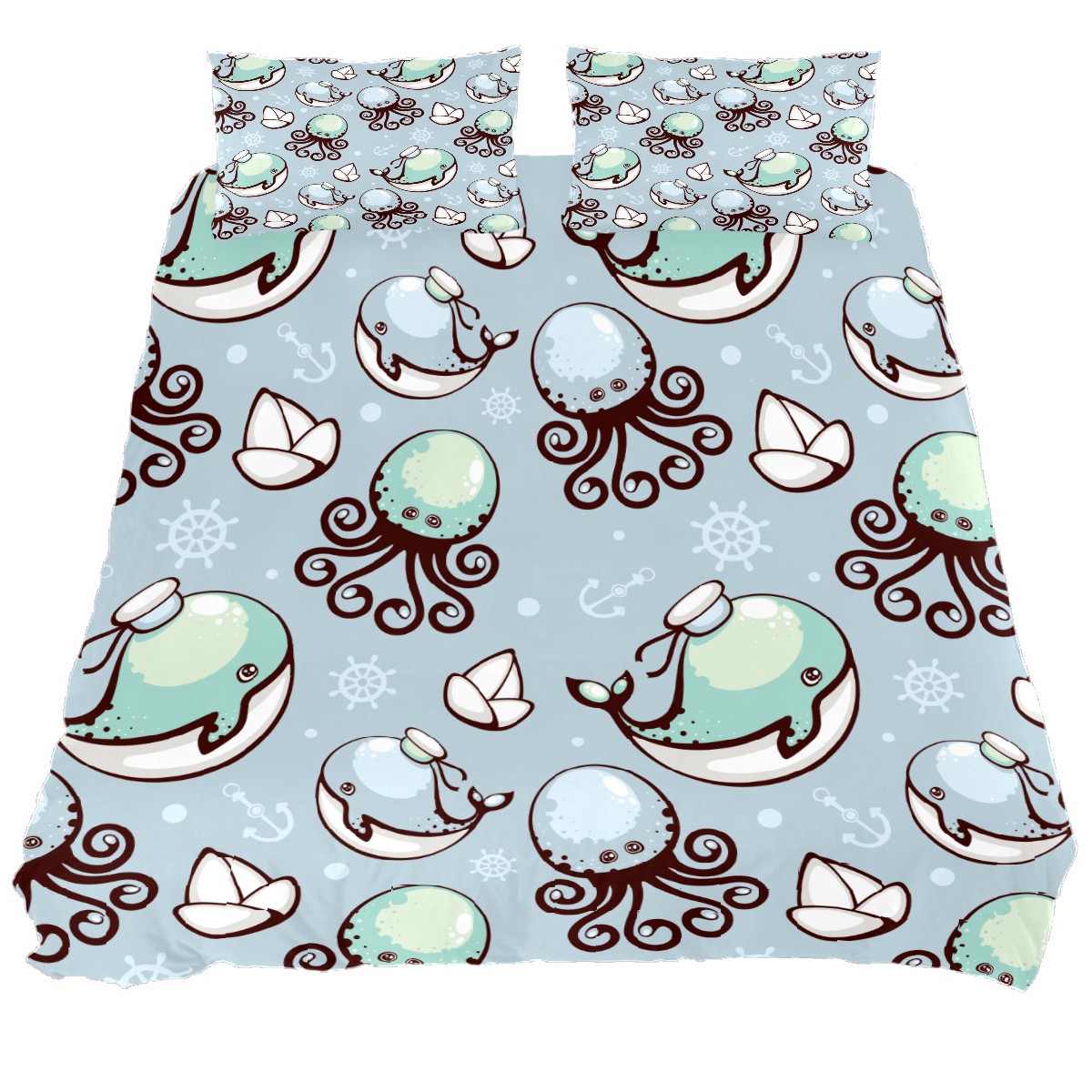 Duvet Cover Twin Cute Fish Octopus Whale 3pcs Bedding Duvet Cover Set Modern Quilt Cover Microfiber Comforter Cover with Button Closure with 2 Pillow Cases 1 Duvet Cover