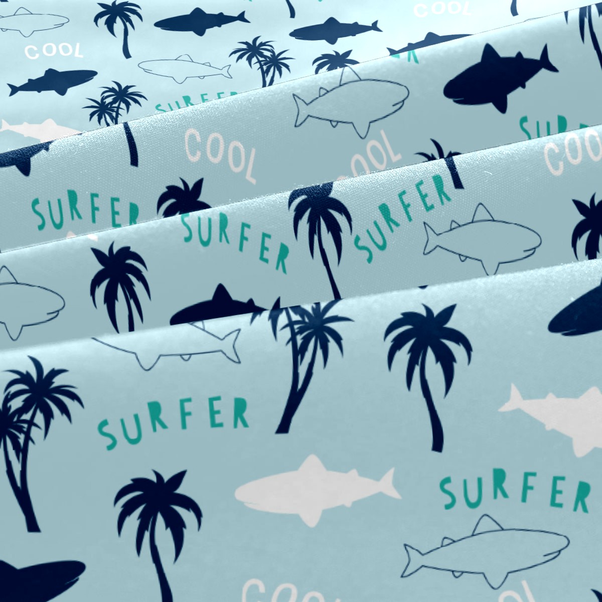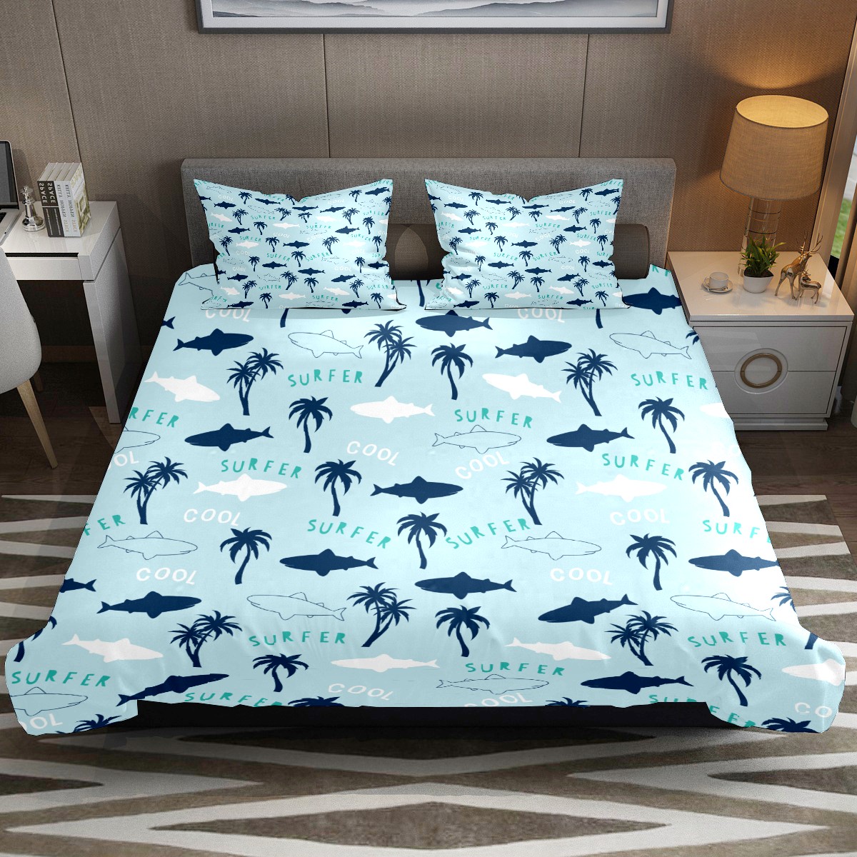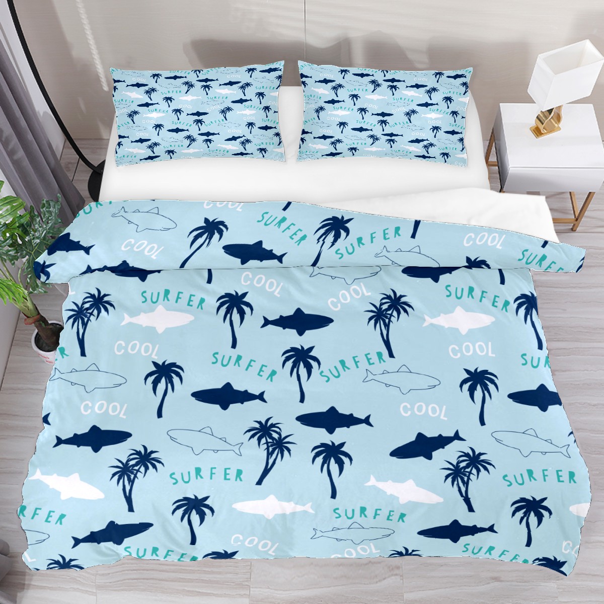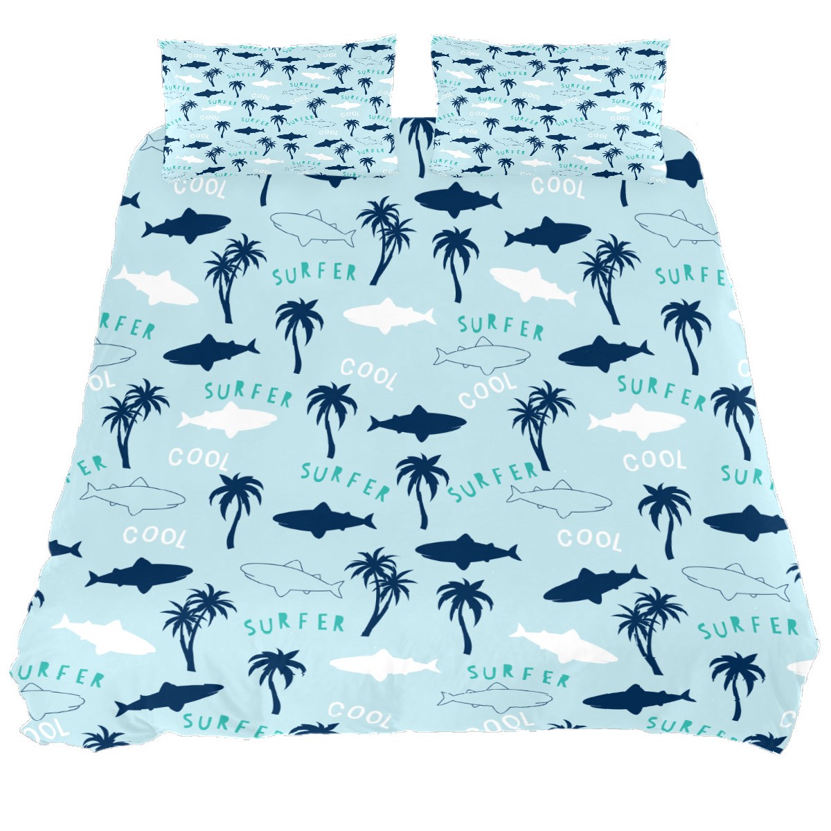 Duvet Cover Twin Beach Surfer Shark Palm Trees Pattern 3pcs Bedding Duvet Cover Set Modern Quilt Cover Microfiber Comforter Cover with Button Closure with 2 Pillow Cases 1 Duvet Cover
