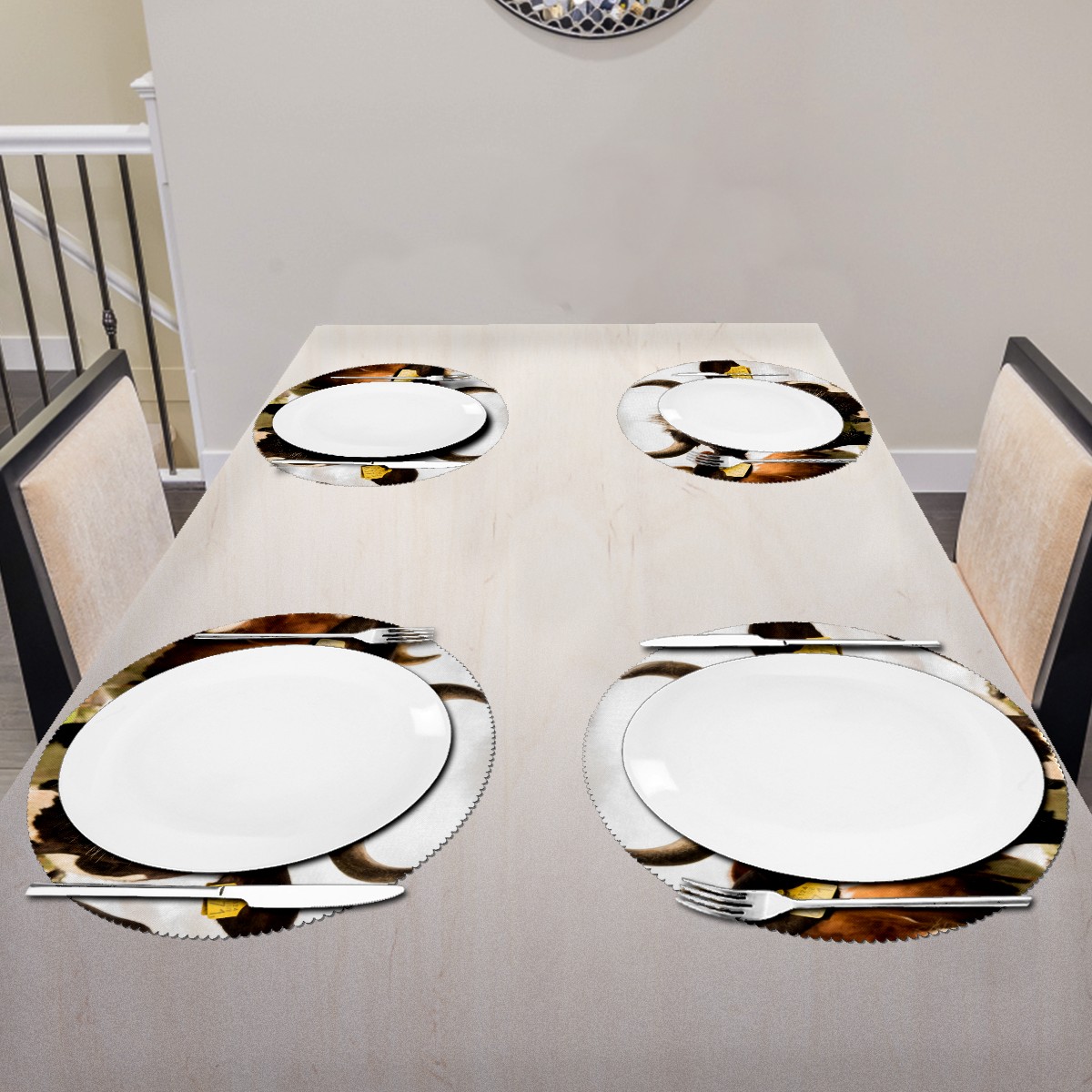 • <p><b>The fashionable design with this table placemat will makes your table look more outstanding and pretty.</b></p> <p><b>Diameter:</b> 15.4 In / 39 cm.</p> <p><b>Packing:</b> 1 PCS/4 PCS/6 PCS.</p> <p><b>Care Instructions:</b></p> <p>1.Wash with water and dry in a cool place. If there are stains on the placemat, you can wipe it with a damp sponge or damp cloth.</p> <p>2.Do not machine wash or sterilize in a microwave oven.</p> <p>3.Note: The package has been rolled up. If you encounter crease problems, please immerse it in warm water and take it out and place a flat object on the mat. The crease will disappear.</p> <p><b>Quality you can trust:</b></p> <p><b>1.Material:High Quality Polyester.</b></p> <p>2.Environmental protection material, no pollution, can be cleaned directly, non-slip, heat-resistant.</p> <p>3.Durable, no deformation,not fade,wrinkle resistant,wear resistant,easy to clean.</p> <p>4.Personalized design. One-Side High Quality Printing Technology.Vivid color and clear images.&nbsp;</p> <p><b>Home Decoration: Suitable for kitchen table,dinner hall,restaurant,hotel,business office,cafe,BBQ,picnic,party,etc.Both practical and decorative.</b></p> <p><b>Best Birthday/Christmas/Halloween/easter/thanksgiving/wedding/engagement anniversary gift to your baby/children/kids/family/boys/girls/parents/friends/girlfriend/boyfriend/wife, etc.</b></p>