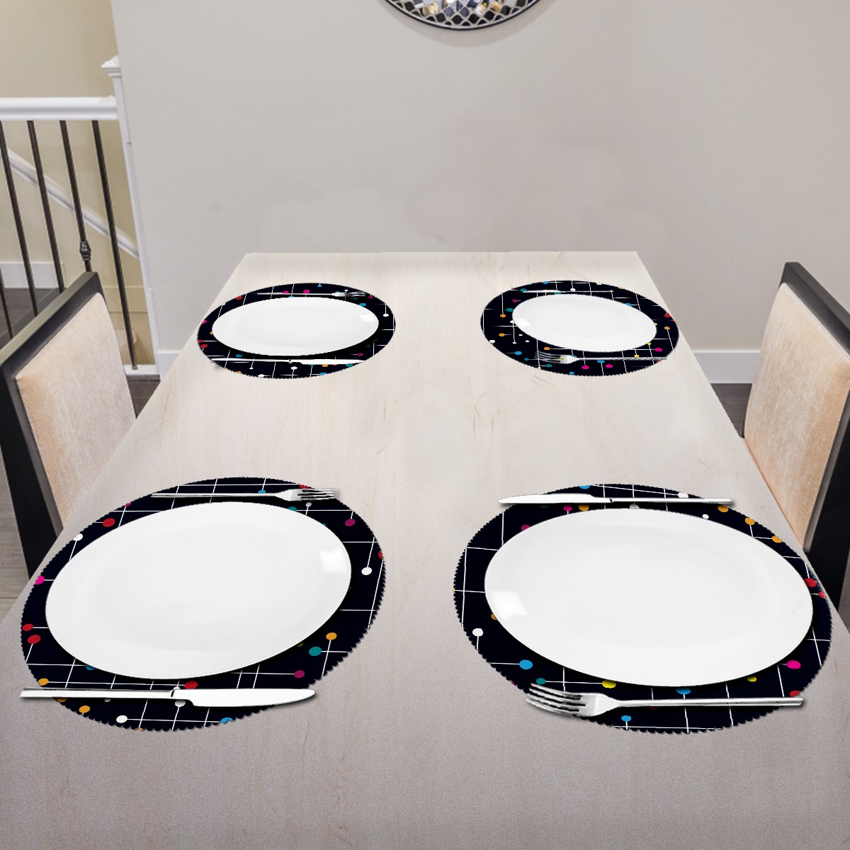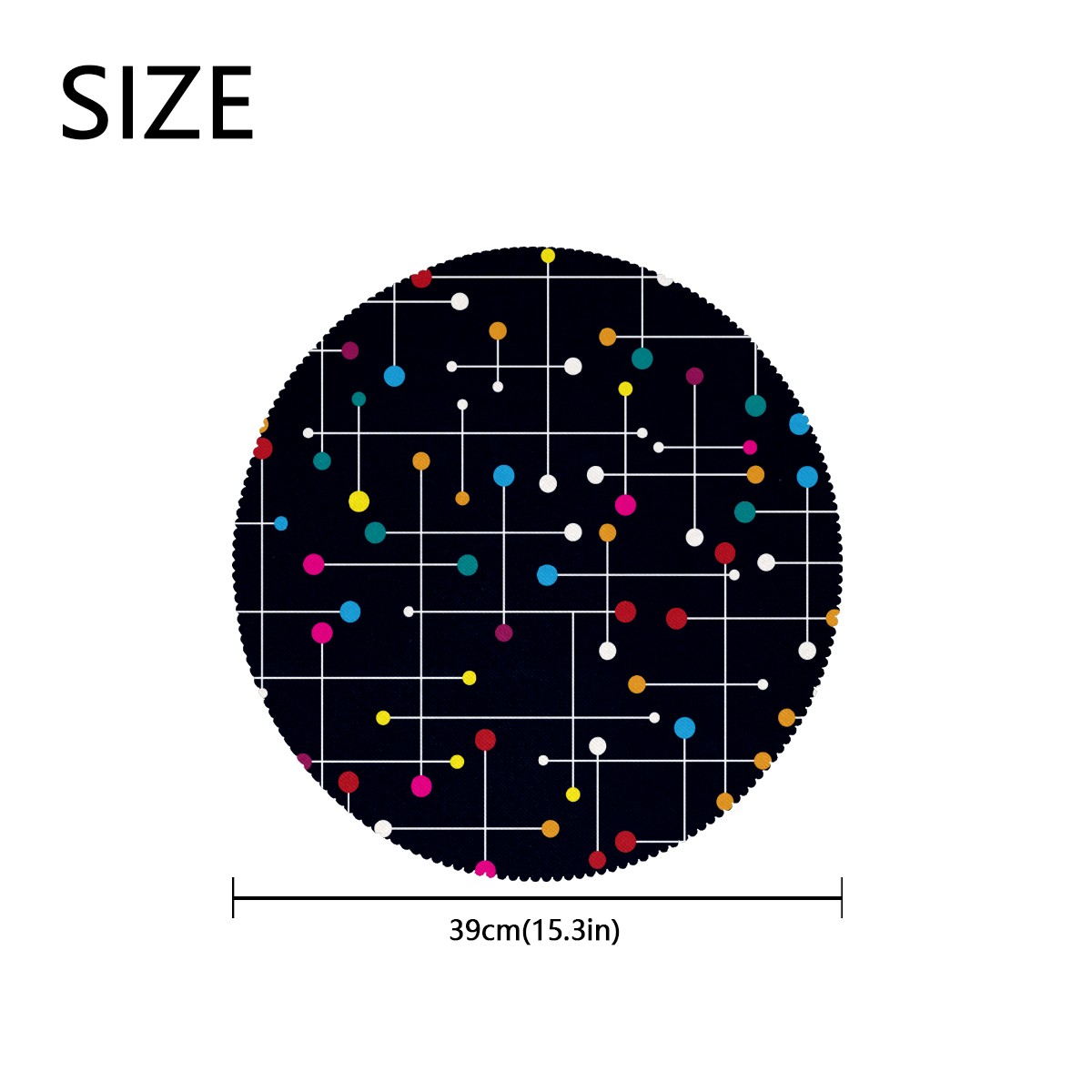 • <p><b>The fashionable design with this table placemat will makes your table look more outstanding and pretty.</b></p> <p><b>Diameter:</b> 15.4 In / 39 cm.</p> <p><b>Packing:</b> 1 PCS/4 PCS/6 PCS.</p> <p><b>Care Instructions:</b></p> <p>1.Wash with water and dry in a cool place. If there are stains on the placemat, you can wipe it with a damp sponge or damp cloth.</p> <p>2.Do not machine wash or sterilize in a microwave oven.</p> <p>3.Note: The package has been rolled up. If you encounter crease problems, please immerse it in warm water and take it out and place a flat object on the mat. The crease will disappear.</p> <p><b>Quality you can trust:</b></p> <p><b>1.Material:High Quality Polyester.</b></p> <p>2.Environmental protection material, no pollution, can be cleaned directly, non-slip, heat-resistant.</p> <p>3.Durable, no deformation,not fade,wrinkle resistant,wear resistant,easy to clean.</p> <p>4.Personalized design. One-Side High Quality Printing Technology.Vivid color and clear images.&nbsp;</p> <p><b>Home Decoration: Suitable for kitchen table,dinner hall,restaurant,hotel,business office,cafe,BBQ,picnic,party,etc.Both practical and decorative.</b></p> <p><b>Best Birthday/Christmas/Halloween/easter/thanksgiving/wedding/engagement anniversary gift to your baby/children/kids/family/boys/girls/parents/friends/girlfriend/boyfriend/wife, etc.</b></p>