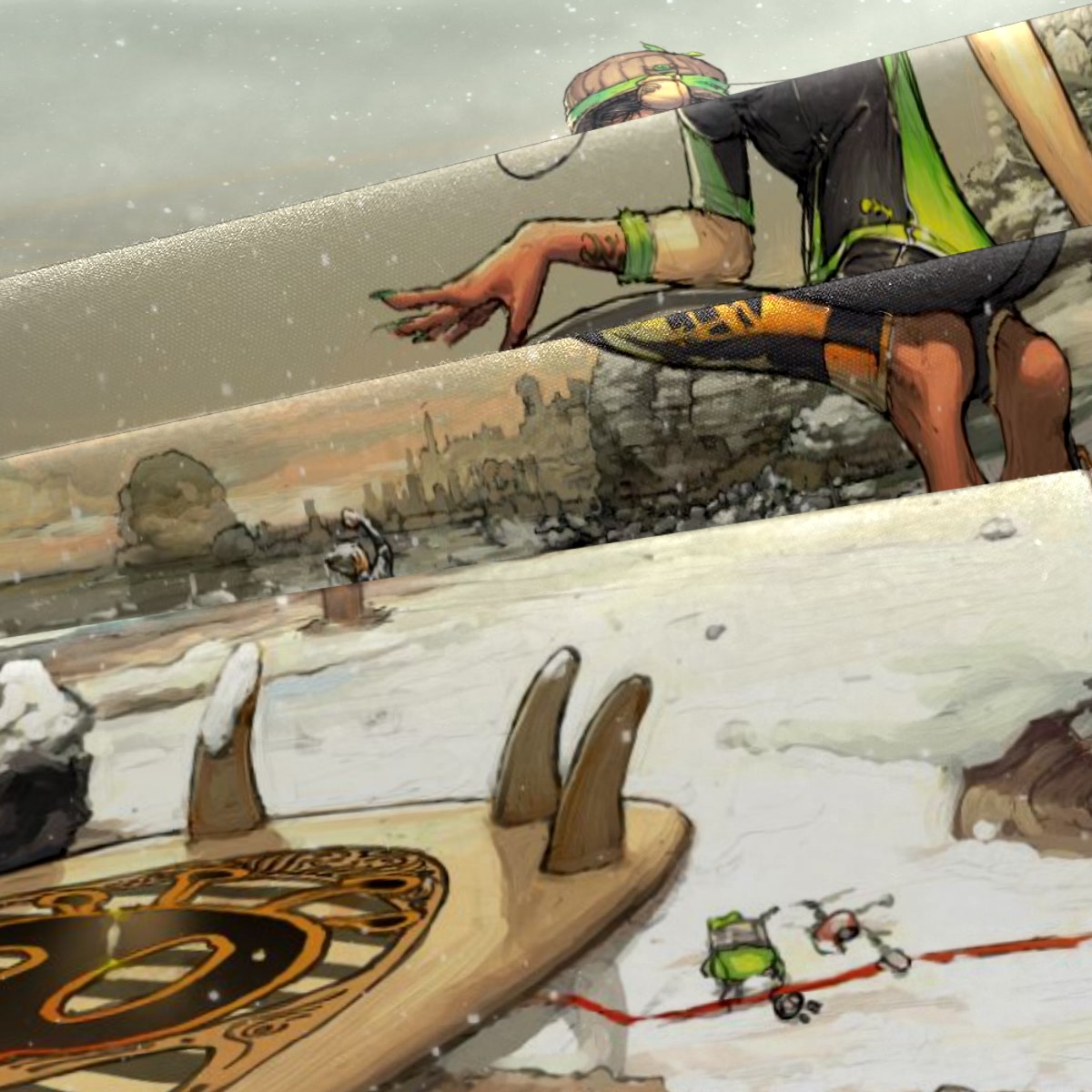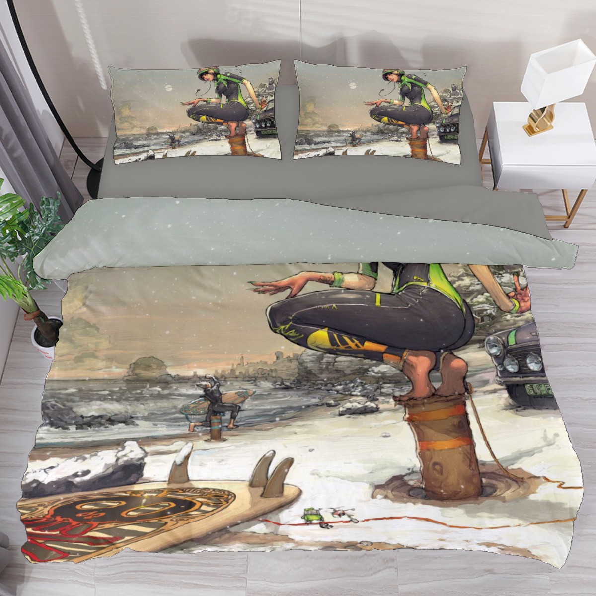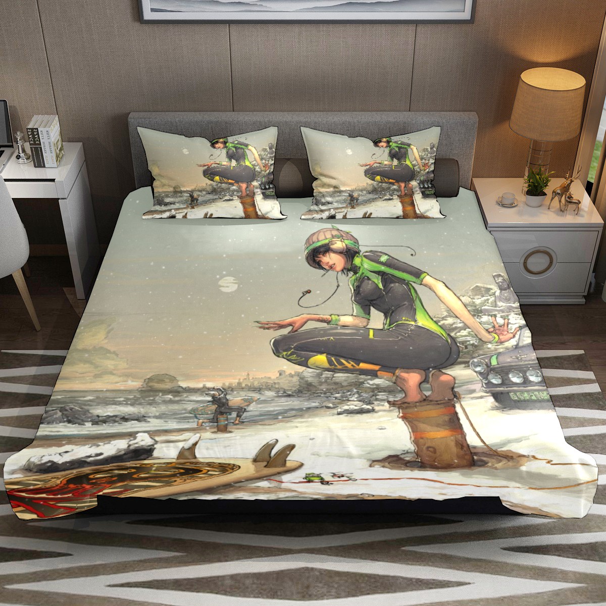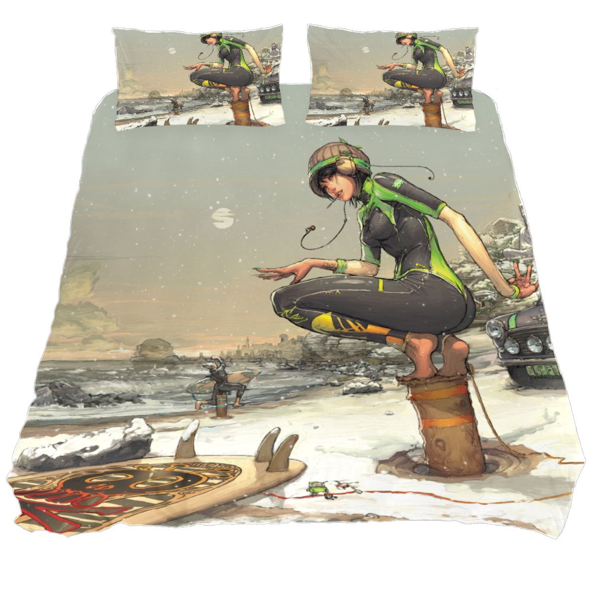 Anime Fitted Sheet & Pillow Sham Set Japanese Comics Surfer Girl In The Snow Manga Image Cartoon Print Decorative Printed 3 Piece Bedding Decor Set,Twin