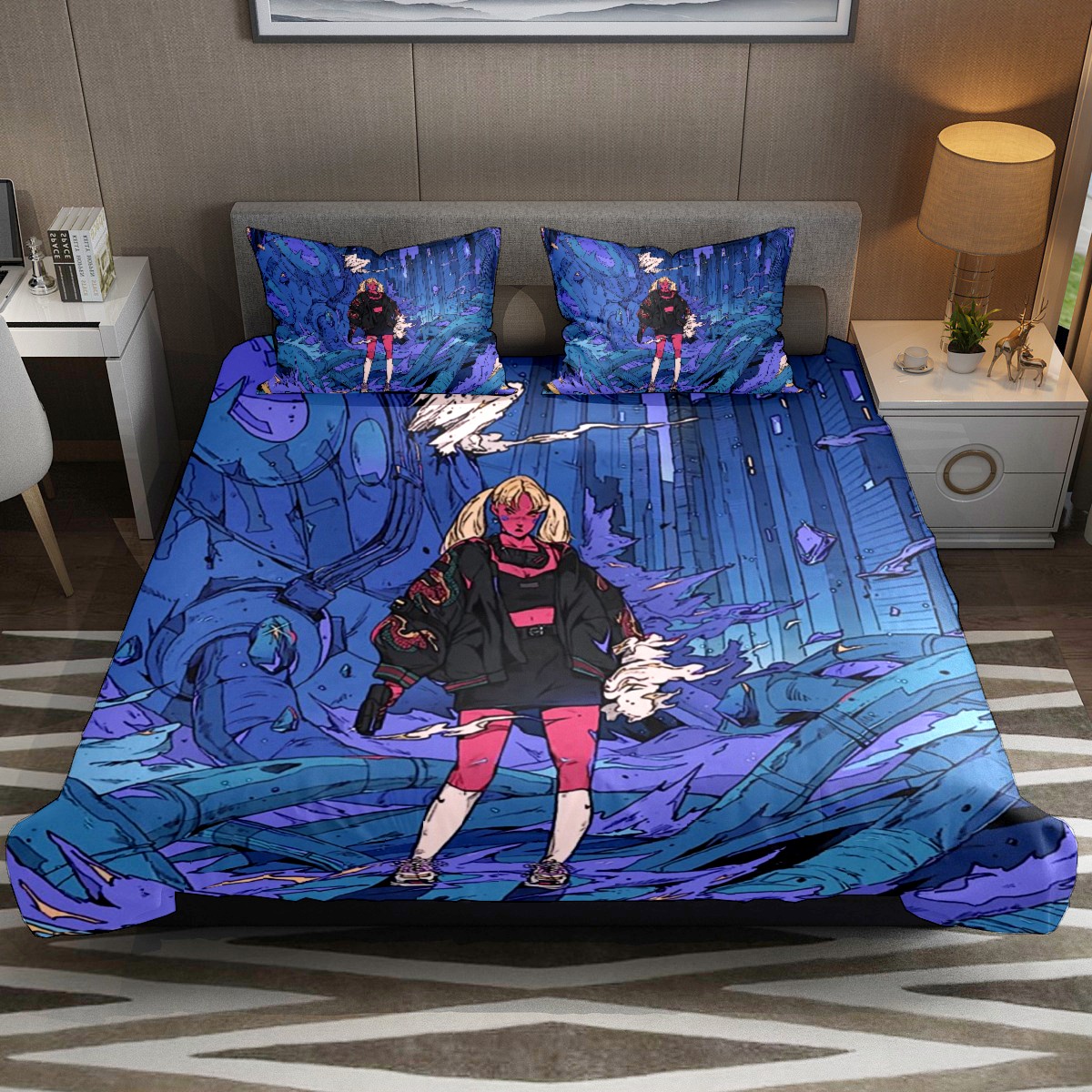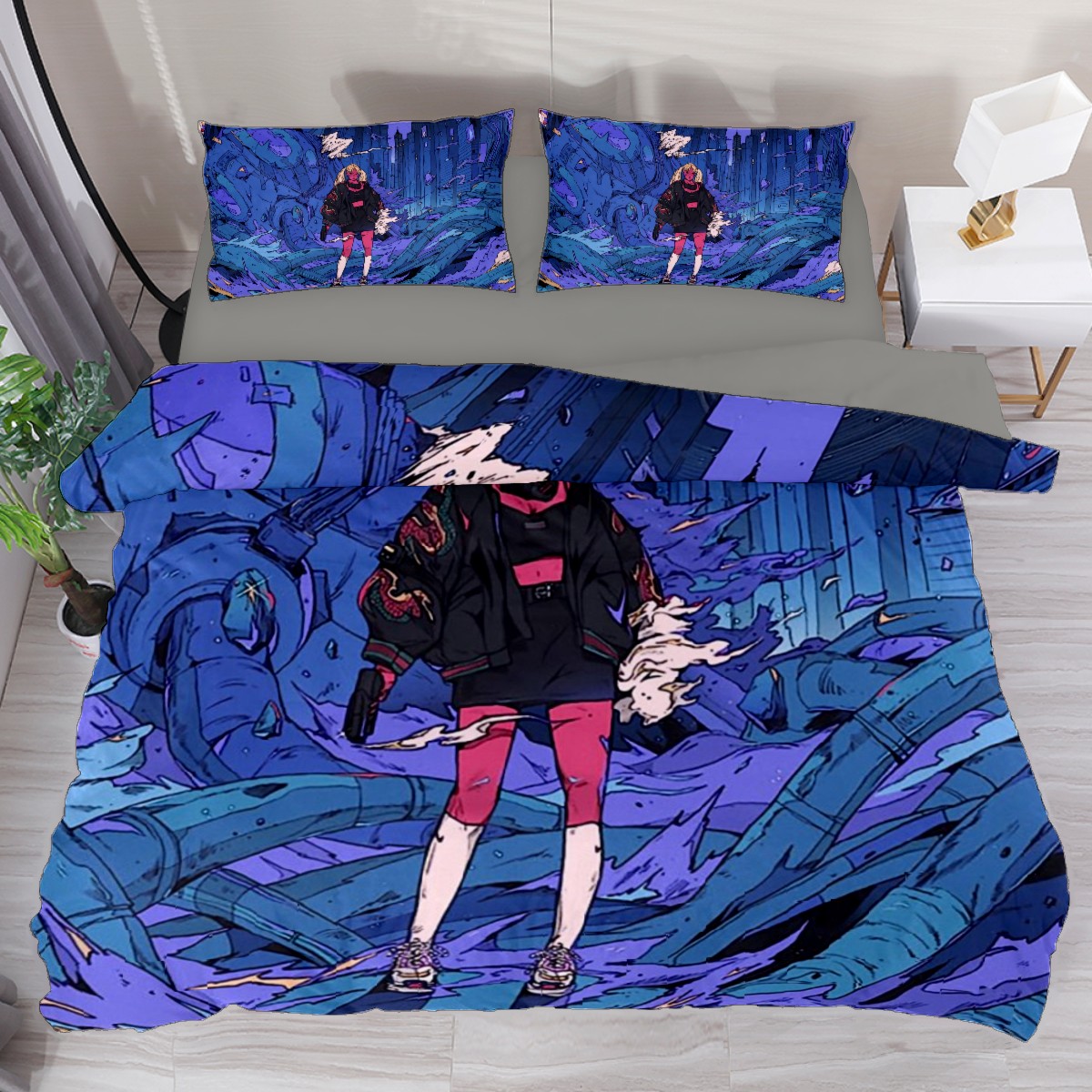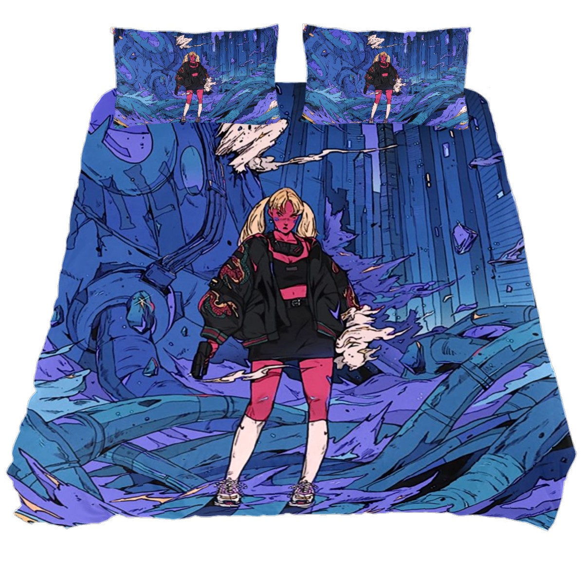 Anime Fitted Sheet & Pillow Sham Set Japanese Comics Purple Girl Modern City Machine Manga Image Cartoon Print Decorative Printed 3 Piece Bedding Decor Set,Twin