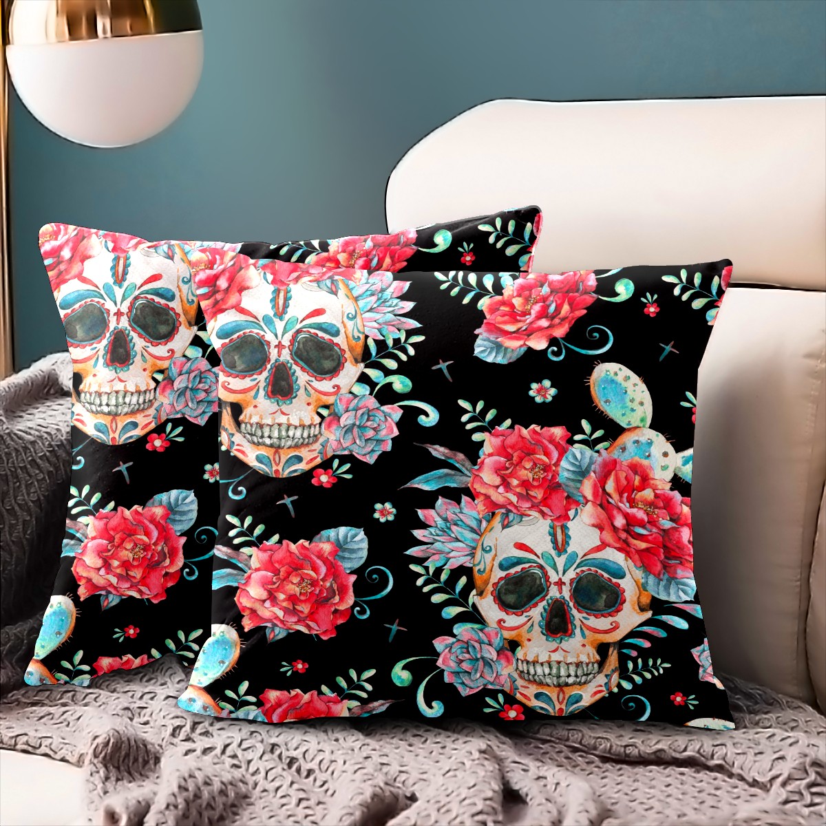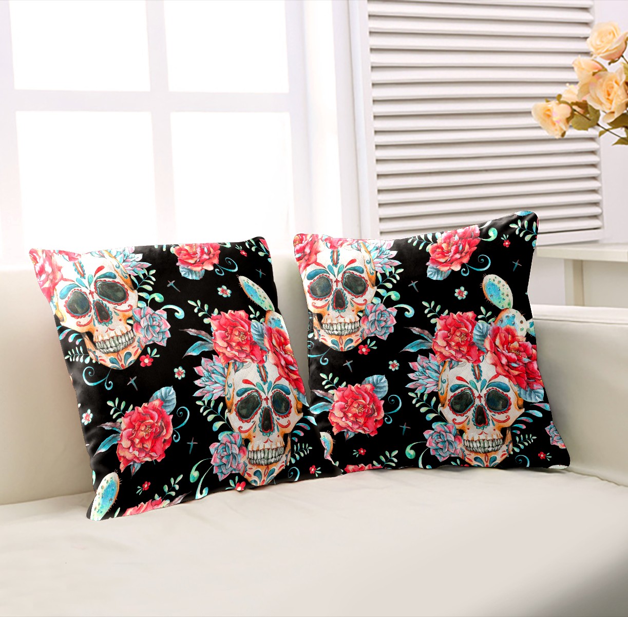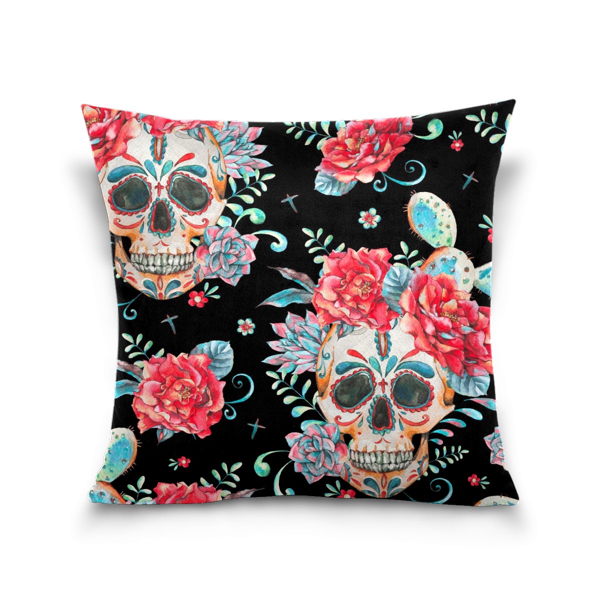 Mexican Skull Pink Peony Flower Pillow Covers 16x16 Square Decorative Throw Pillow Cover Case Soft Velvet Cushion Cover for Couch Sofa Bed Living Room Car Home Decoration Set of 2