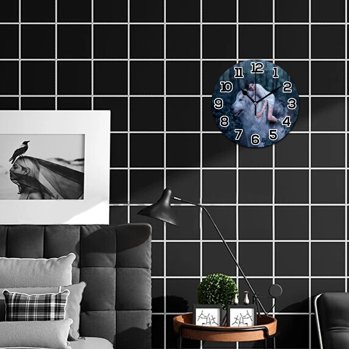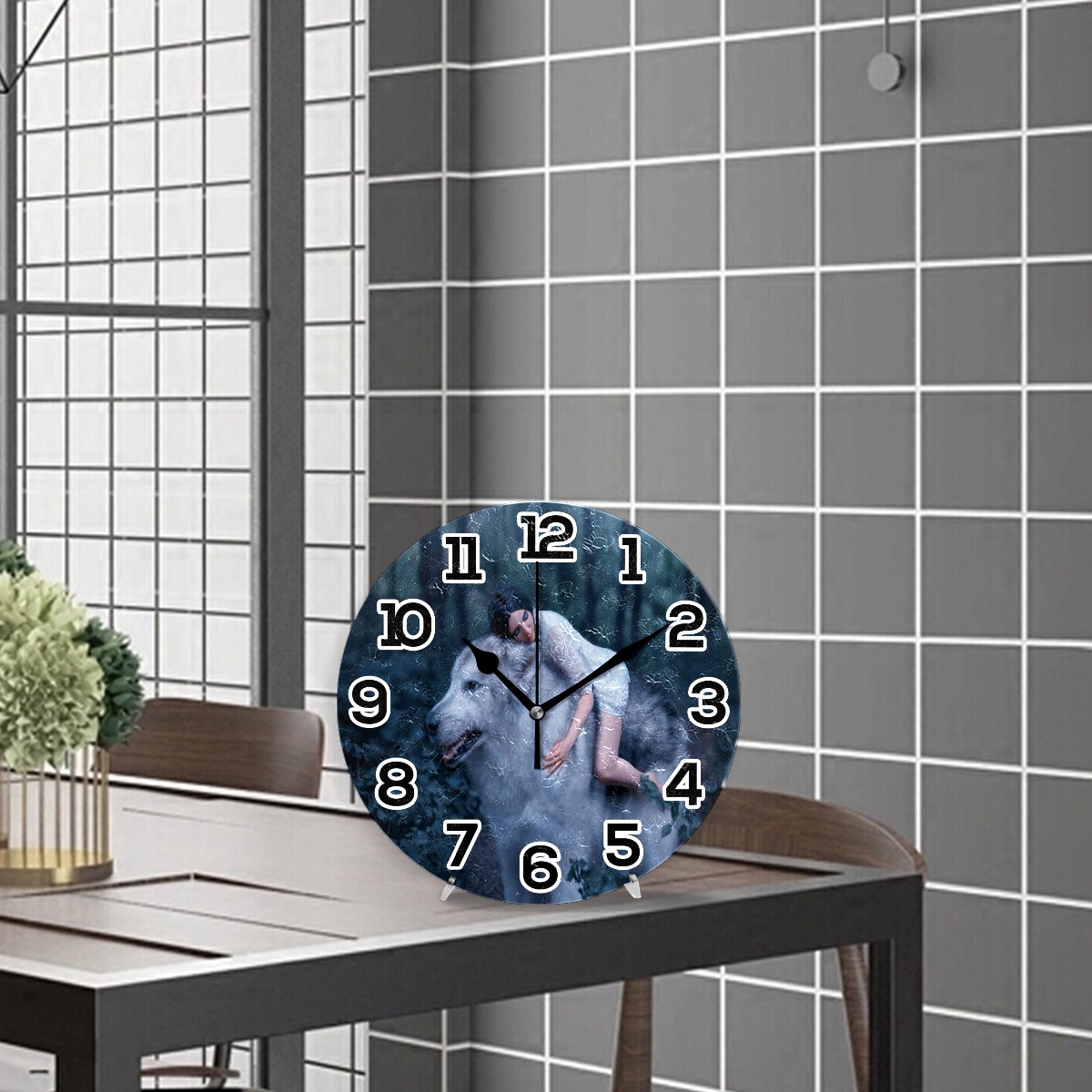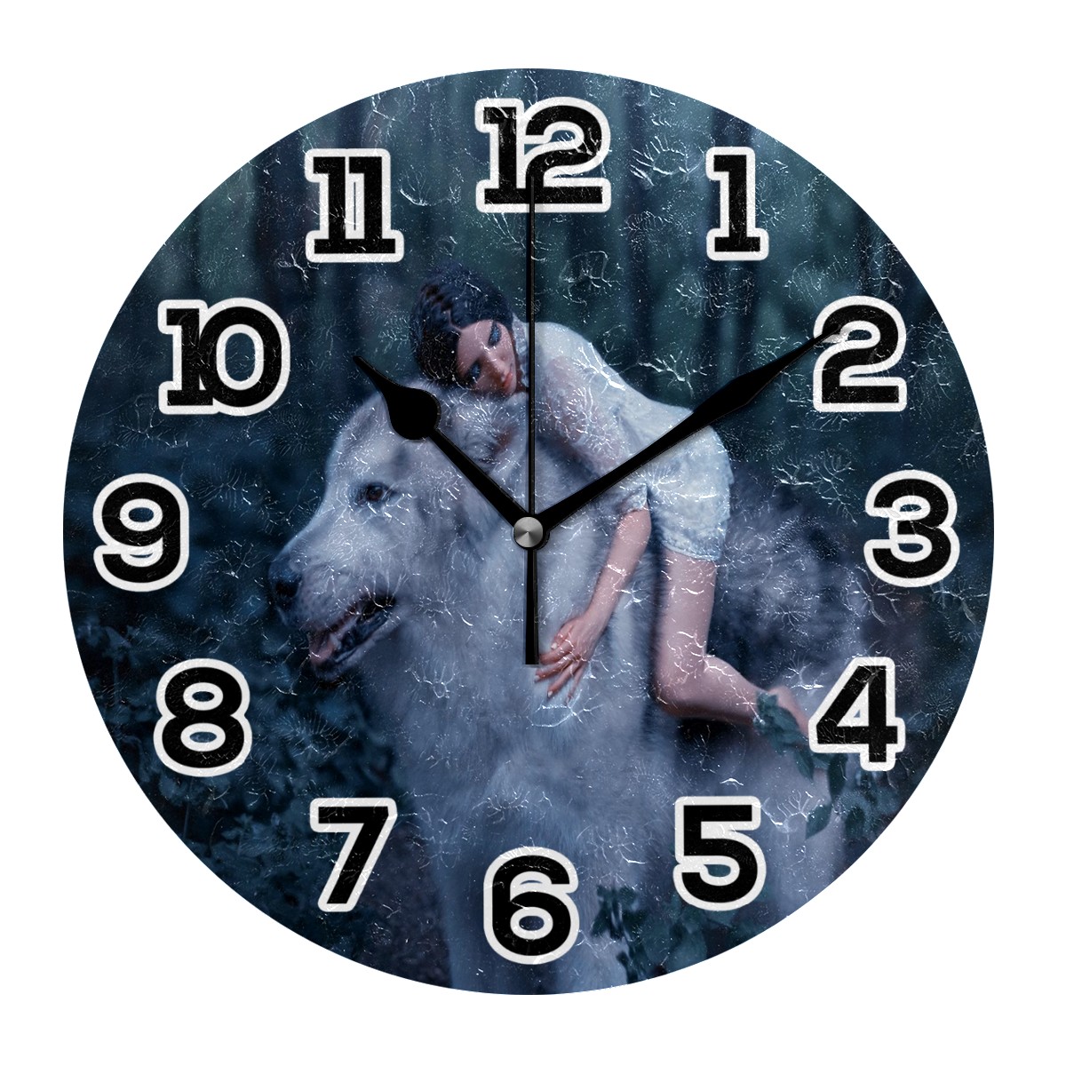 A Fragile Girl Riding A Wolf Clock Wall Decor Acrylic Decorative Round Battery Operated Wall Clocks for Home Bedroom Living Room Decor Silent Non Ticking