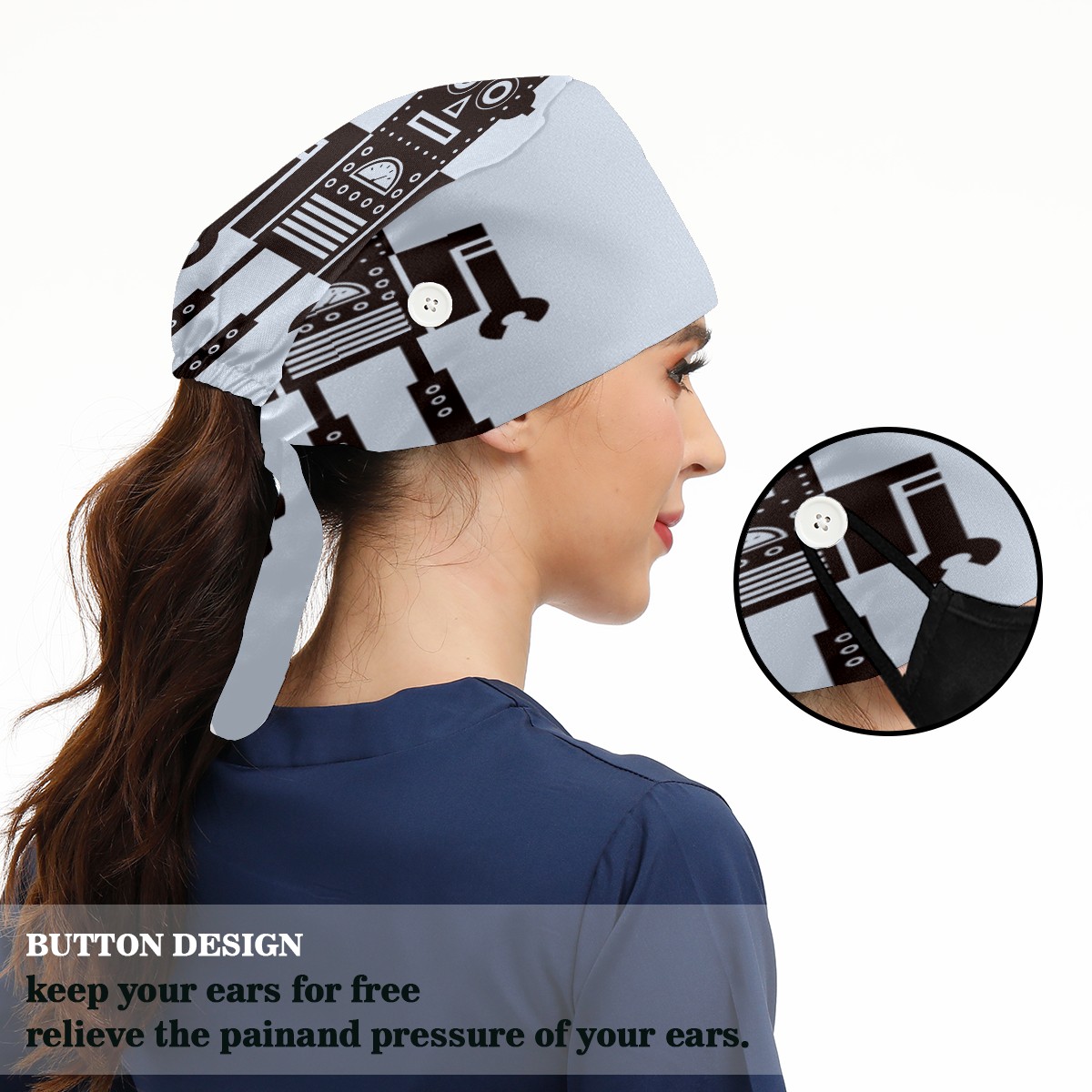 <p>Working cap with Sweatband and Button for Women Men</p><p>Material&nbsp;: 50% cotton+50% polyester</p><p>Size:&nbsp;One size fits most,&nbsp;suitable for both men and women.</p><p>Working Cap with Buttons Design:special&nbsp;design with buttons to protect ears for those who are wearing ma-sk. These new styles hats will allow you to put the straps around the buttons instead of your ears, make you feel more comfortable.</p><p>Sweat-absorbent towel cloth inside: Built-in&nbsp;100% cotton sweatband, keep the forehead clean after long time working.</p><p>Widely occasion: Widely used in beauty spa, house cleaning, cooking, sleeping, or for cos-play&nbsp;party.</p><p>Lovely pattern: lovely&nbsp;3D printed&nbsp;pattern,&nbsp;it's perfect for gift to you family&nbsp;and friends.</p>