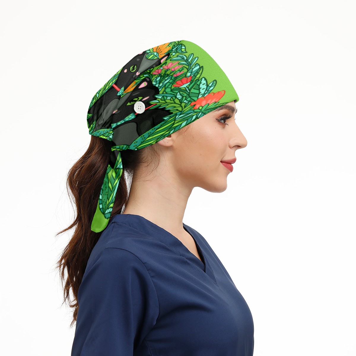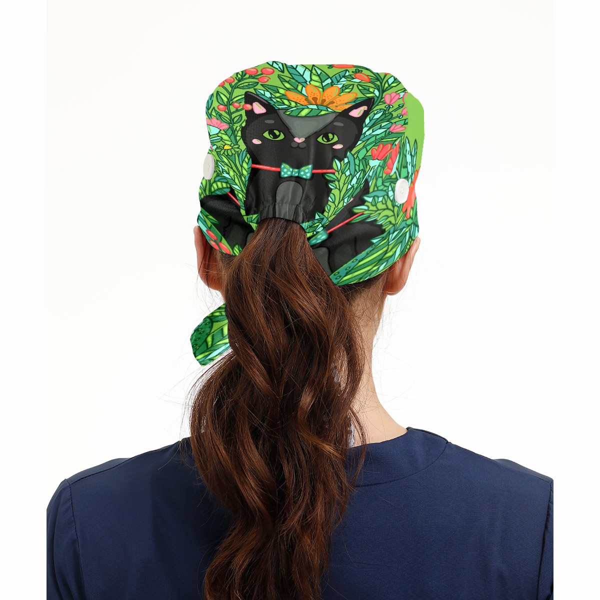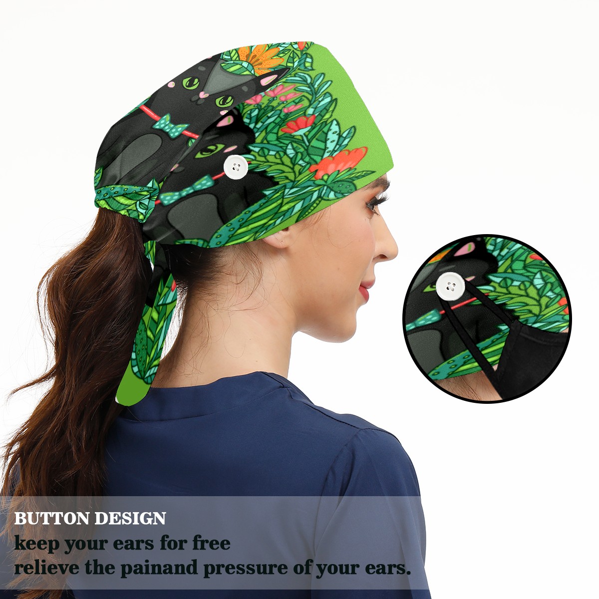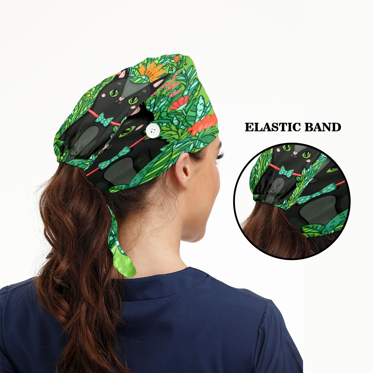 Funny Cat With Floral Print Working Cap Button and Sweatband Adjustable Elastic Head Cover Hair Tie Back Work Hats for Women Men