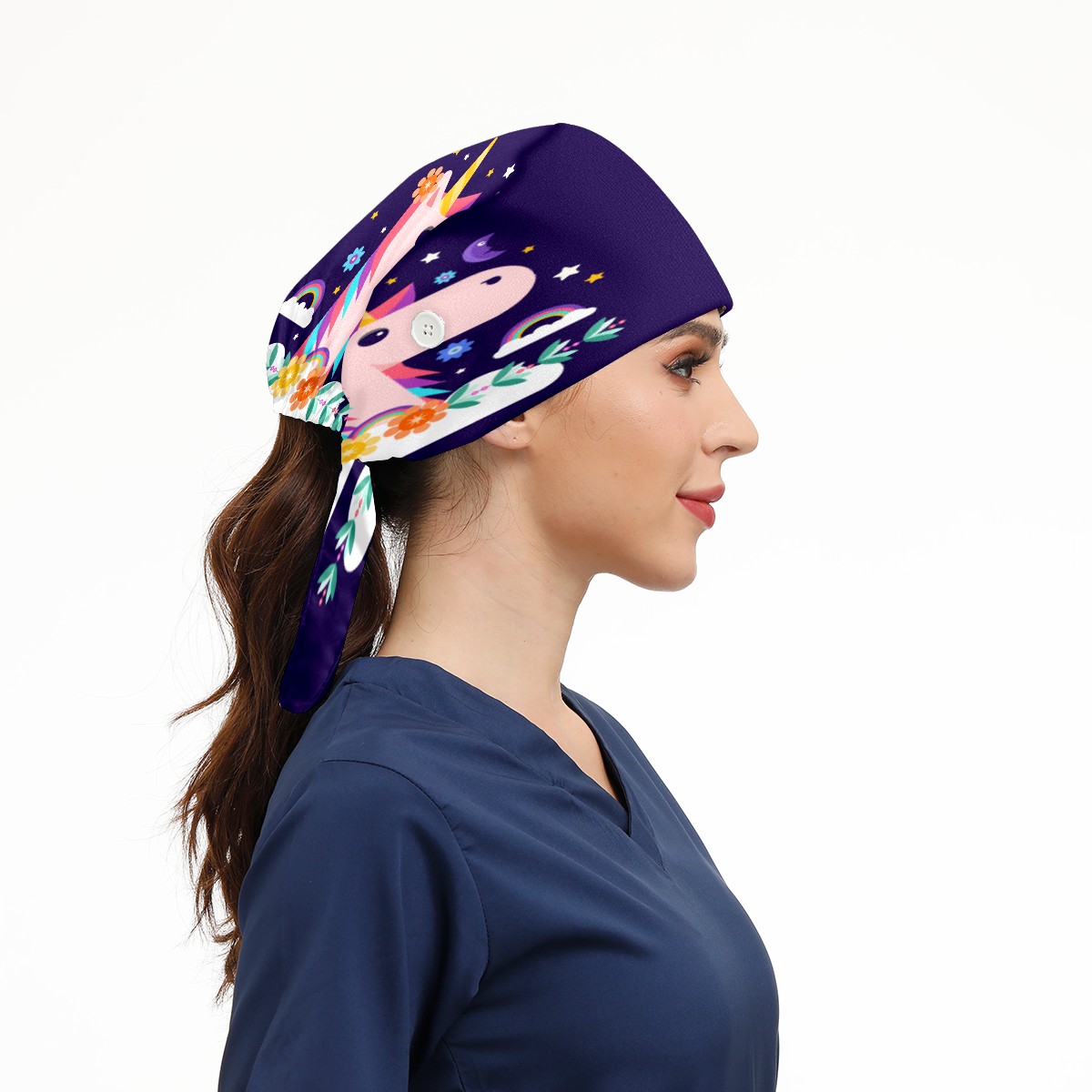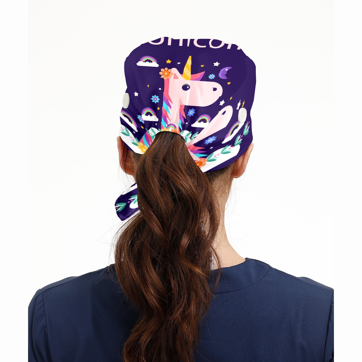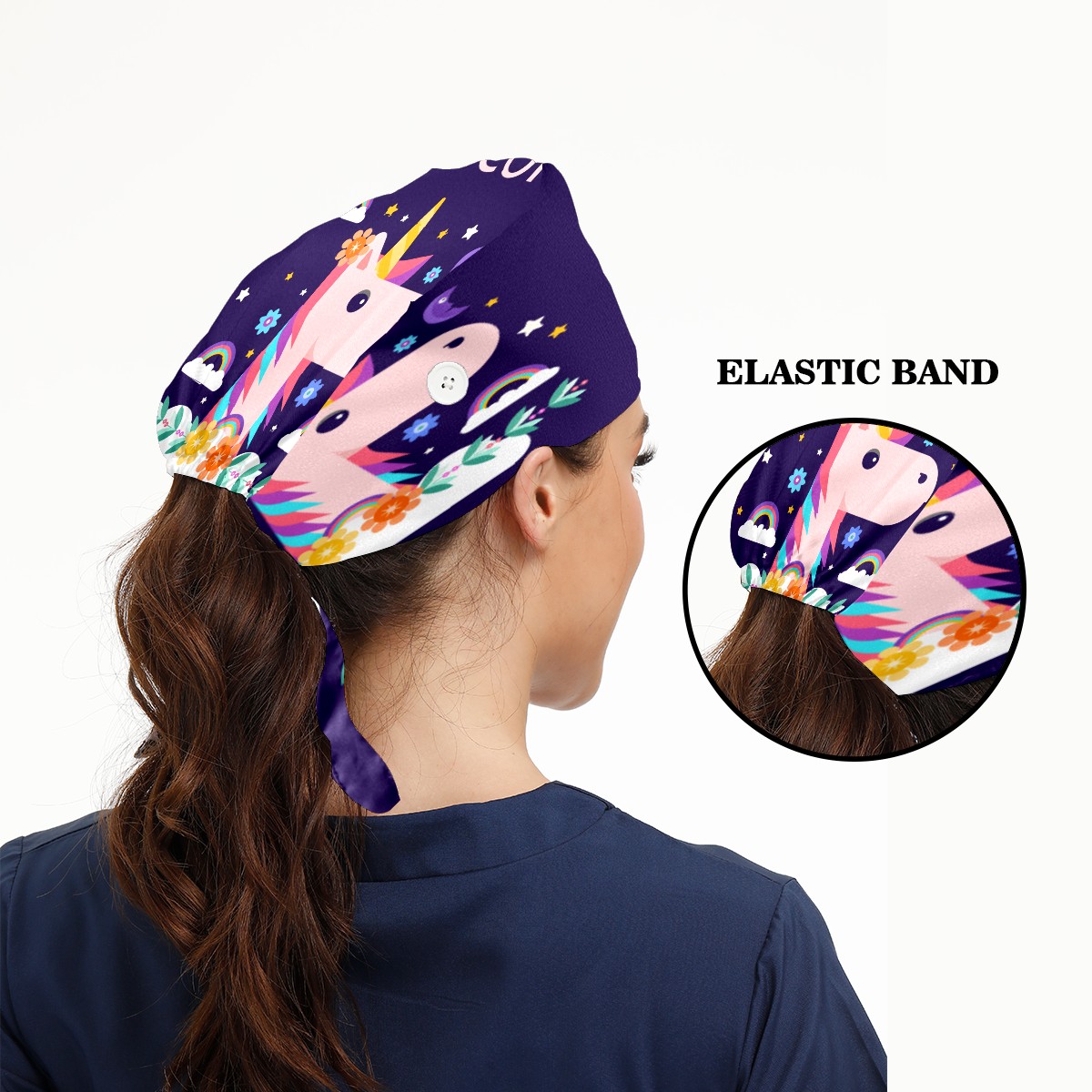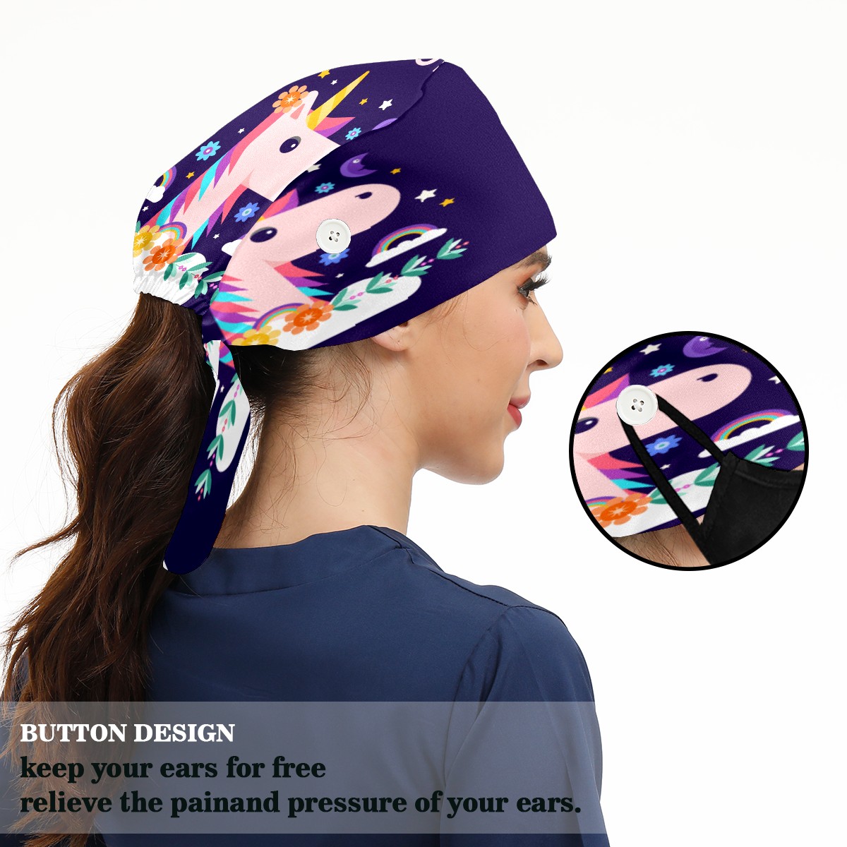 Rainbow Unicorn Cartoon Working Cap Button and Sweatband Adjustable Elastic Head Cover Hair Tie Back Work Hats for Women Men
