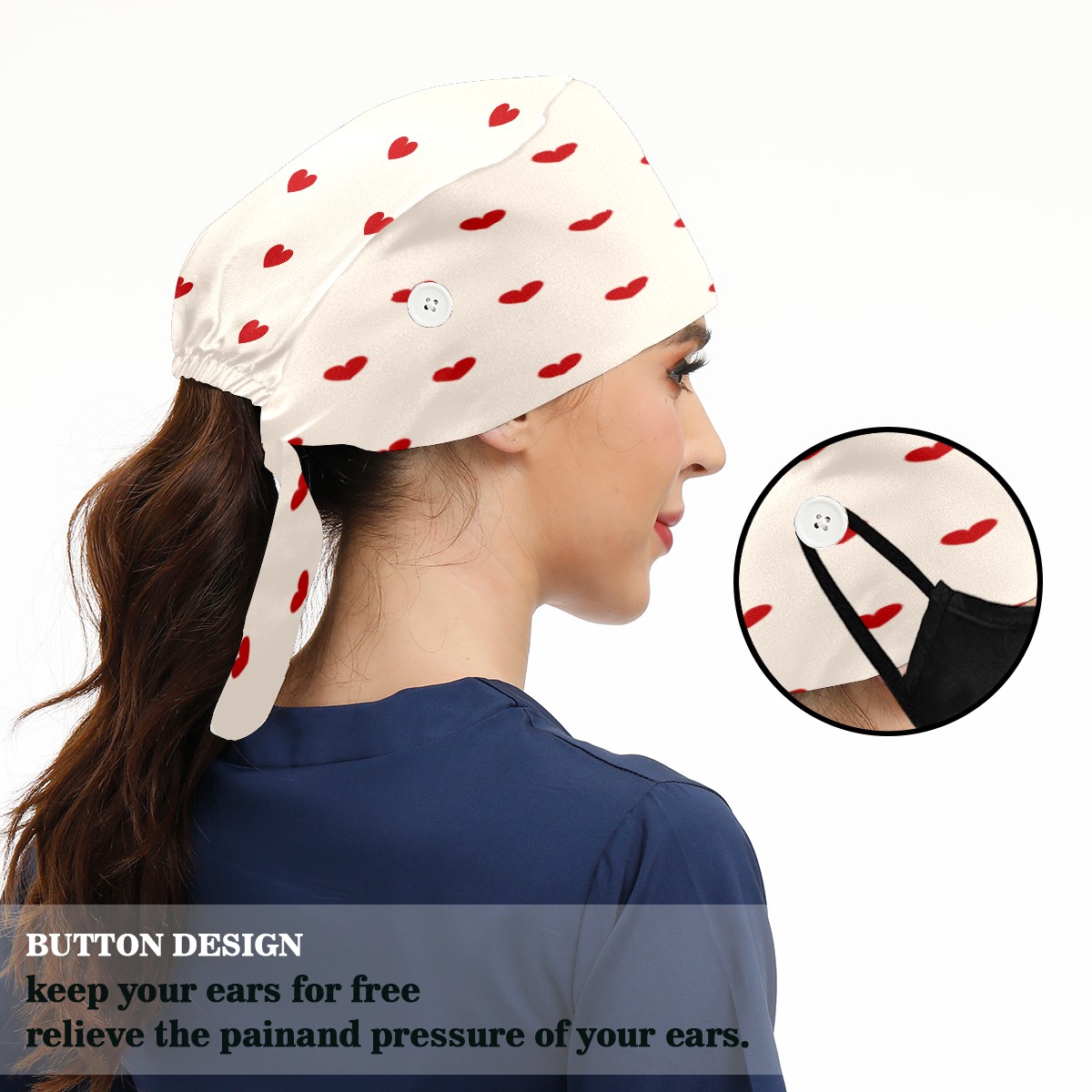 <p>Working cap with Sweatband and Button for Women Men</p><p>Material&nbsp;: 50% cotton+50% polyester</p><p>Size:&nbsp;One size fits most,&nbsp;suitable for both men and women.</p><p>Working Cap with Buttons Design:special&nbsp;design with buttons to protect ears for those who are wearing ma-sk. These new styles hats will allow you to put the straps around the buttons instead of your ears, make you feel more comfortable.</p><p>Sweat-absorbent towel cloth inside: Built-in&nbsp;100% cotton sweatband, keep the forehead clean after long time working.</p><p>Widely occasion: Widely used in beauty spa, house cleaning, cooking, sleeping, or for cos-play&nbsp;party.</p><p>Lovely pattern: lovely&nbsp;3D printed&nbsp;pattern,&nbsp;it's perfect for gift to you family&nbsp;and friends.</p>