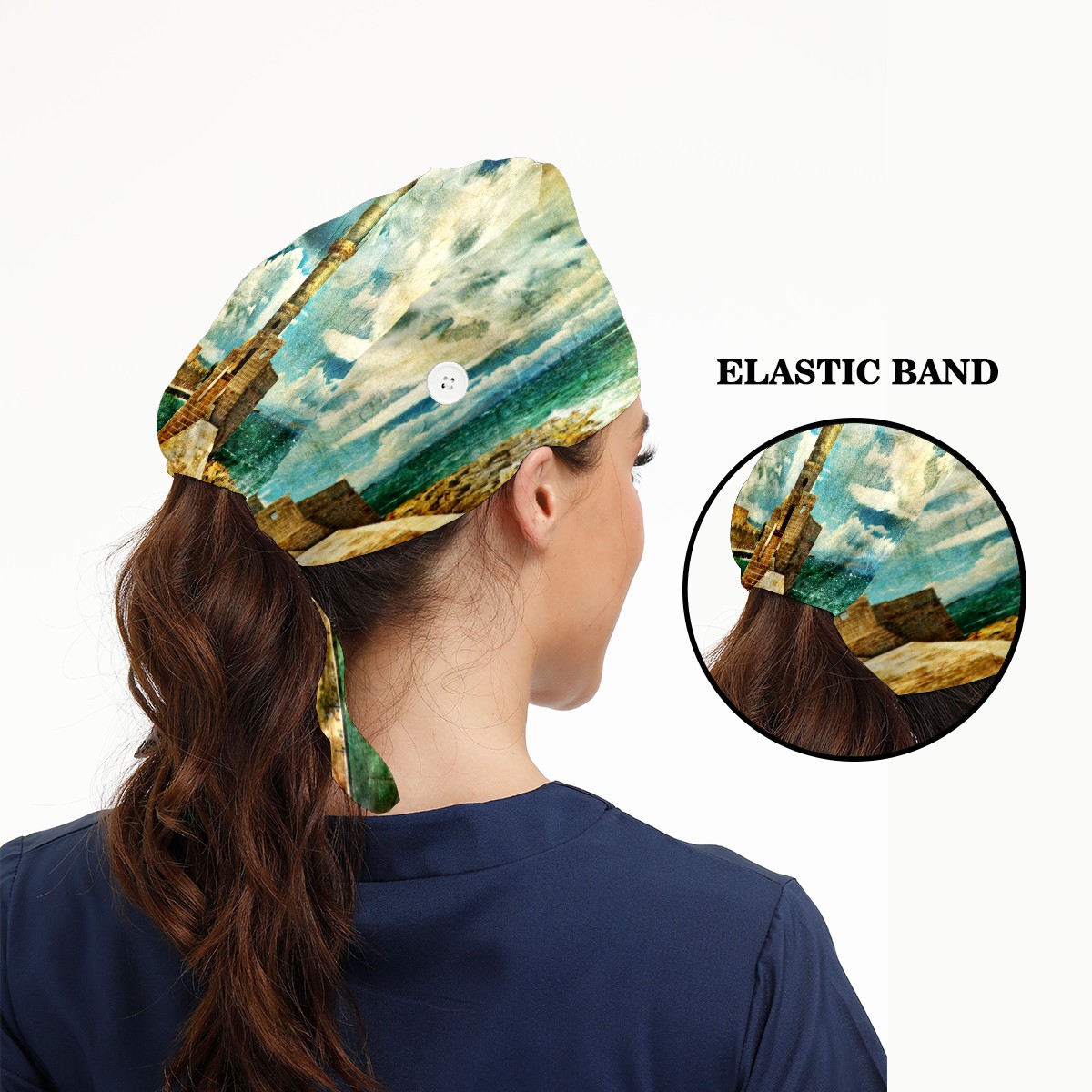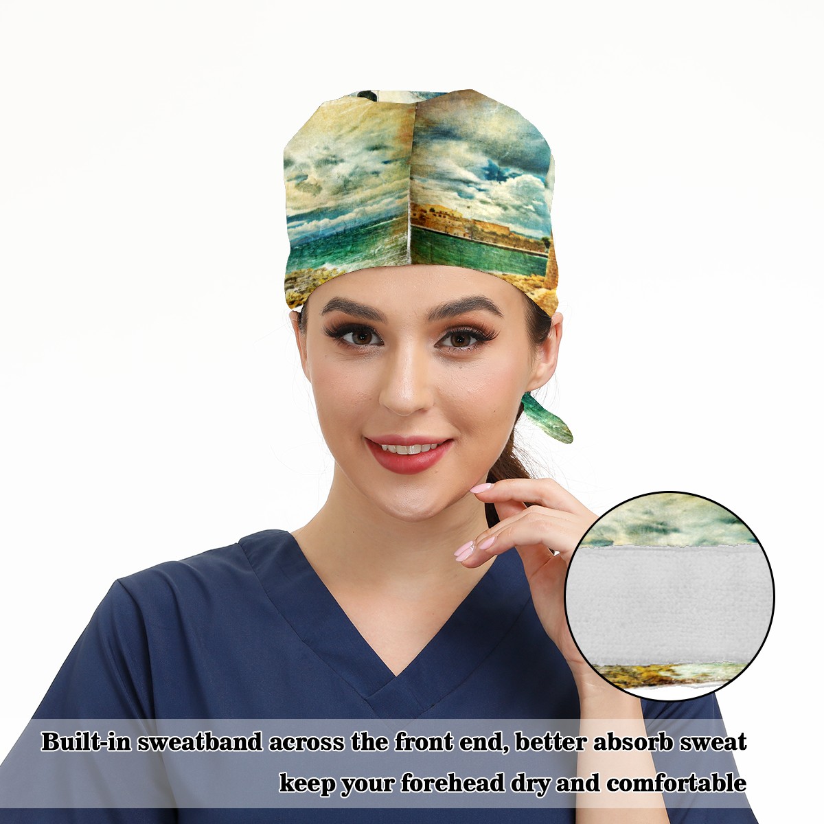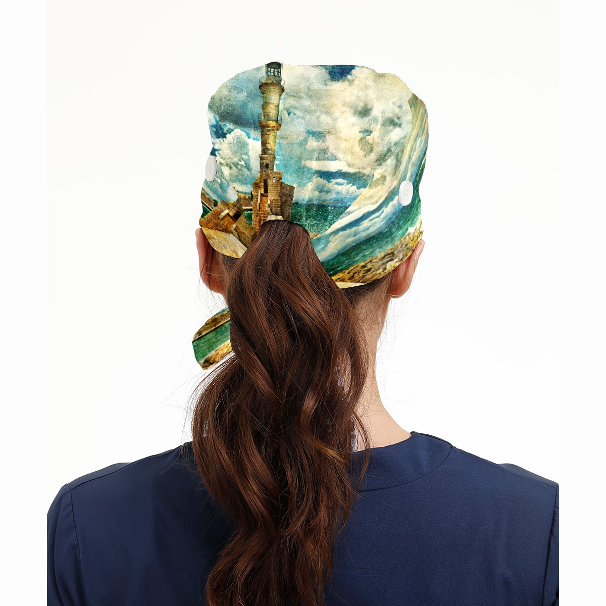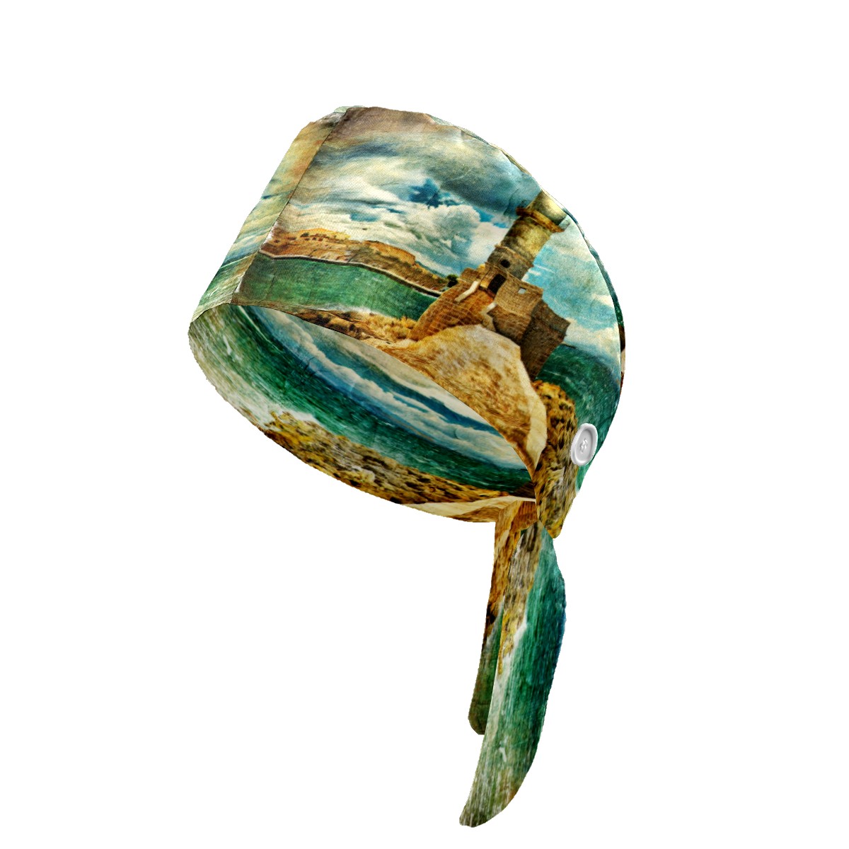 Vintage Nautical Wave Lighthouse Working Cap Button and Sweatband Adjustable Elastic Head Cover Hair Tie Back Work Hats for Women Men
