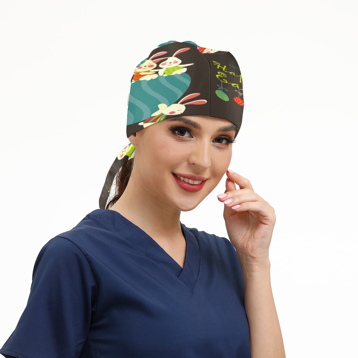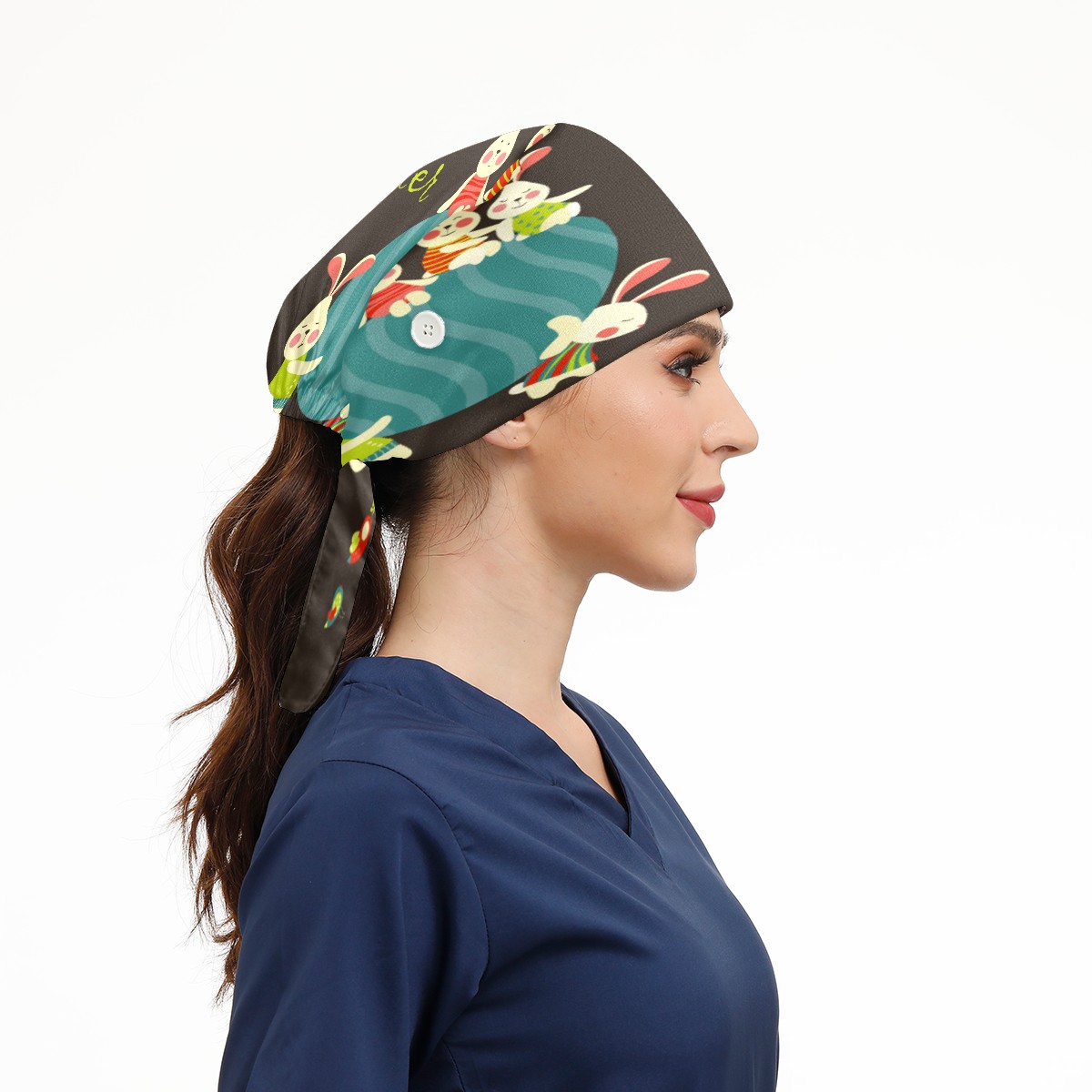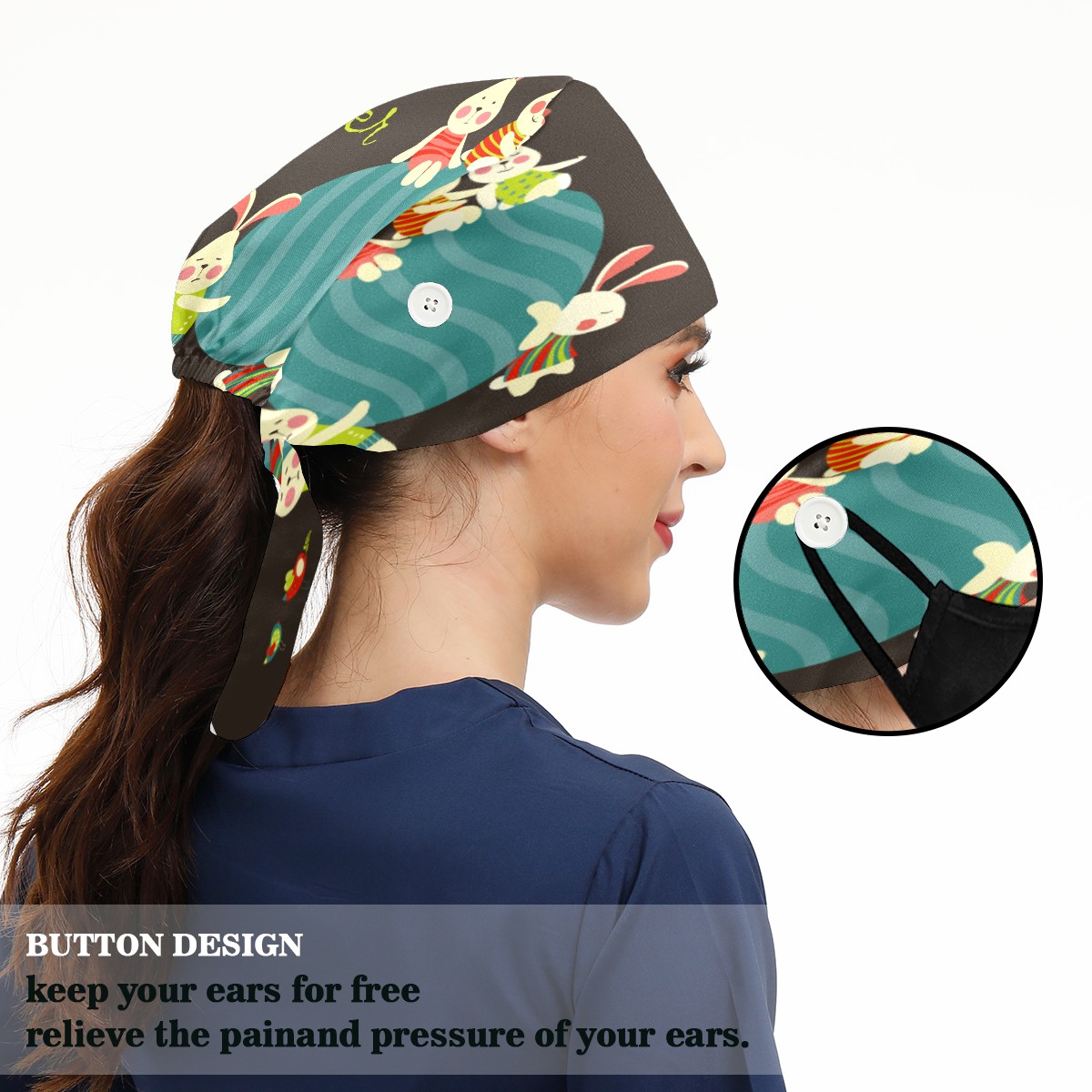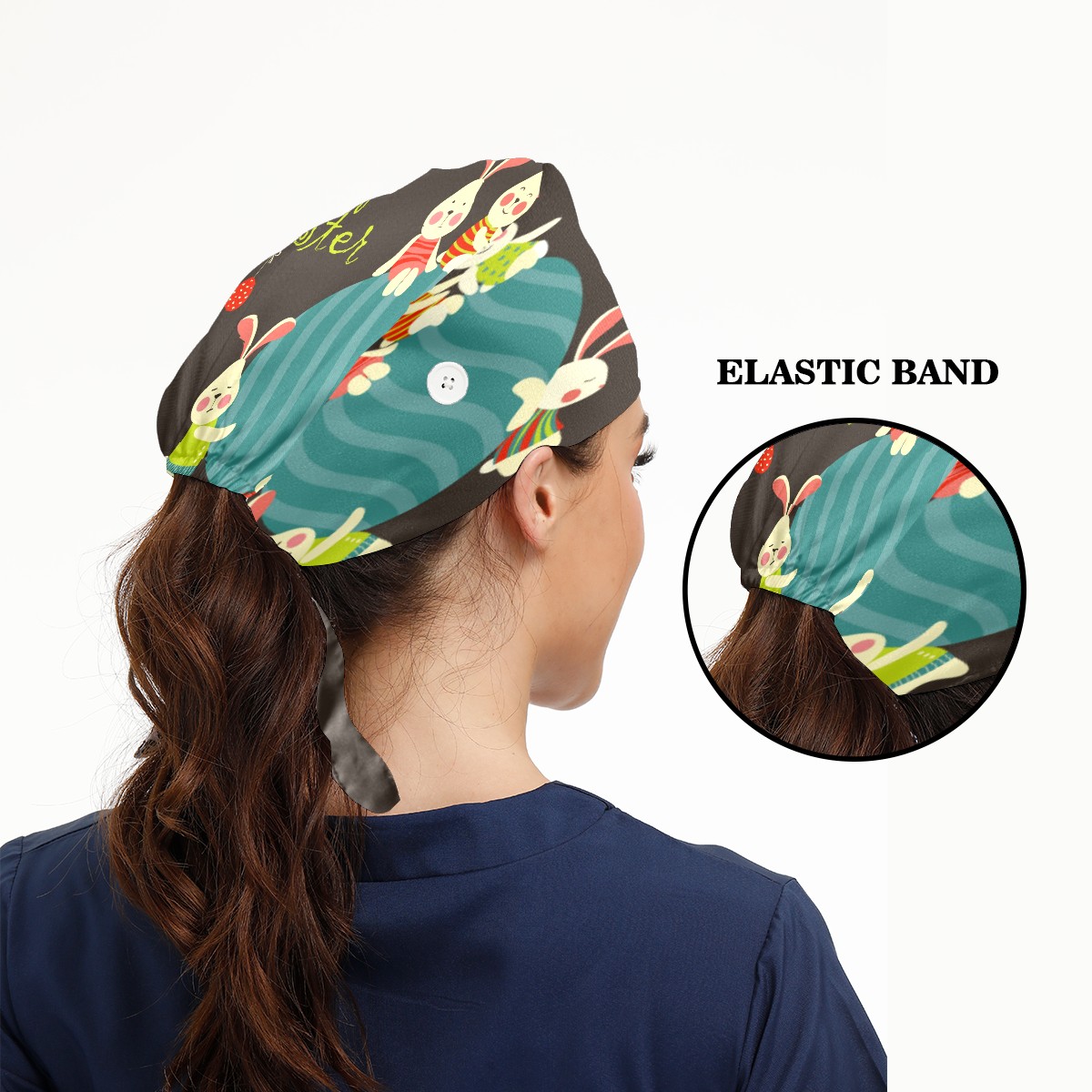 Happy Easter Rabbit With Eggs Working Cap Button and Sweatband Adjustable Elastic Head Cover Hair Tie Back Work Hats for Women Men