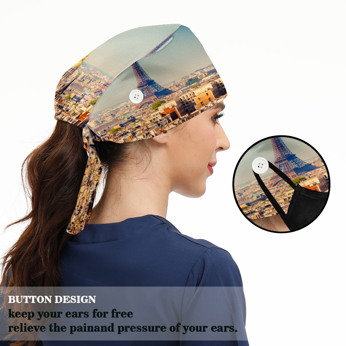 <p>Working cap with Sweatband and Button for Women Men</p><p>Material&nbsp;: 50% cotton+50% polyester</p><p>Size:&nbsp;One size fits most,&nbsp;suitable for both men and women.</p><p>Working Cap with Buttons Design:special&nbsp;design with buttons to protect ears for those who are wearing ma-sk. These new styles hats will allow you to put the straps around the buttons instead of your ears, make you feel more comfortable.</p><p>Sweat-absorbent towel cloth inside: Built-in&nbsp;100% cotton sweatband, keep the forehead clean after long time working.</p><p>Widely occasion: Widely used in beauty spa, house cleaning, cooking, sleeping, or for cos-play&nbsp;party.</p><p>Lovely pattern: lovely&nbsp;3D printed&nbsp;pattern,&nbsp;it's perfect for gift to you family&nbsp;and friends.</p>
