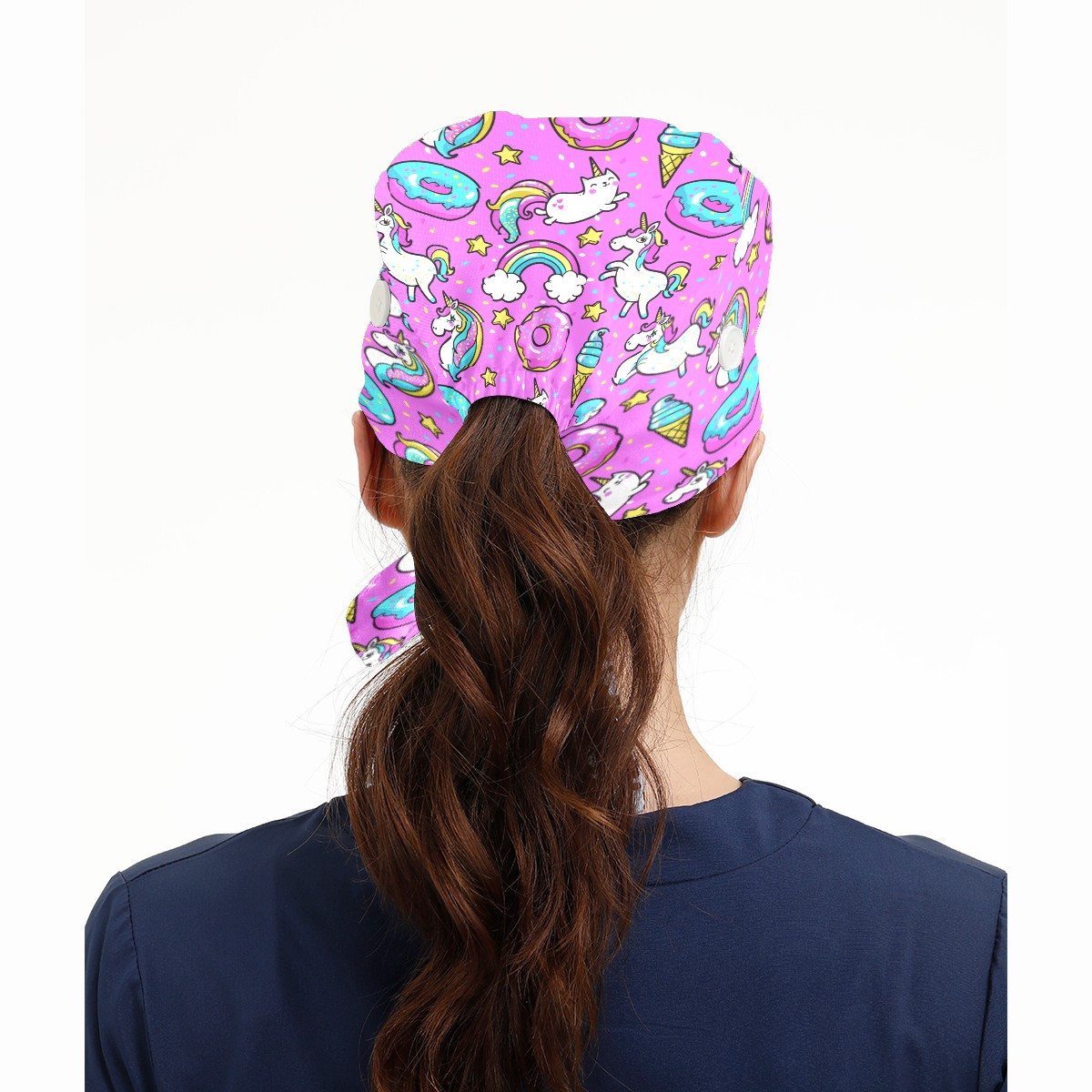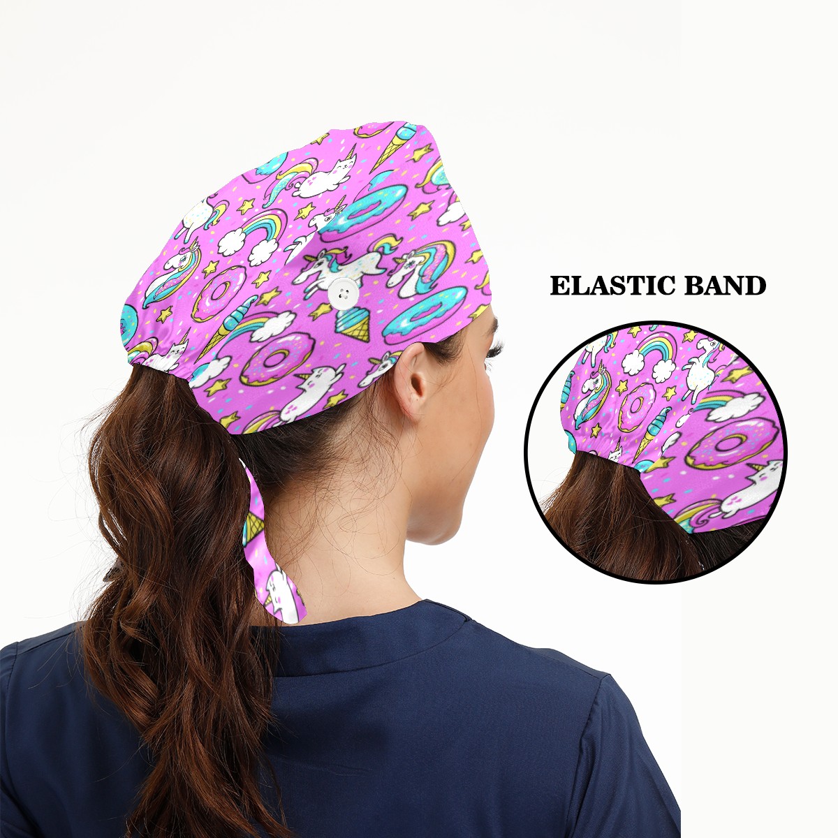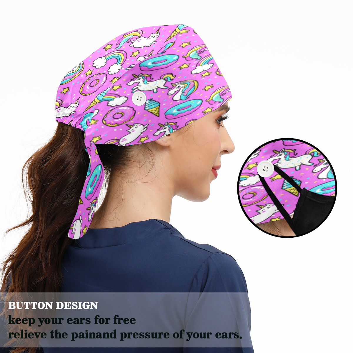Pink Unicorn Rainbow Donuts Pattern Working Cap Button and Sweatband Adjustable Elastic Head Cover Hair Tie Back Work Hats for Women Men