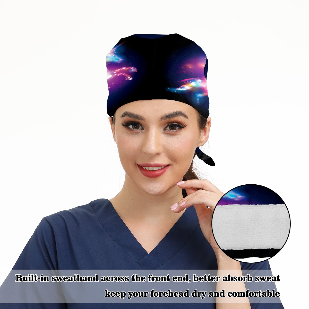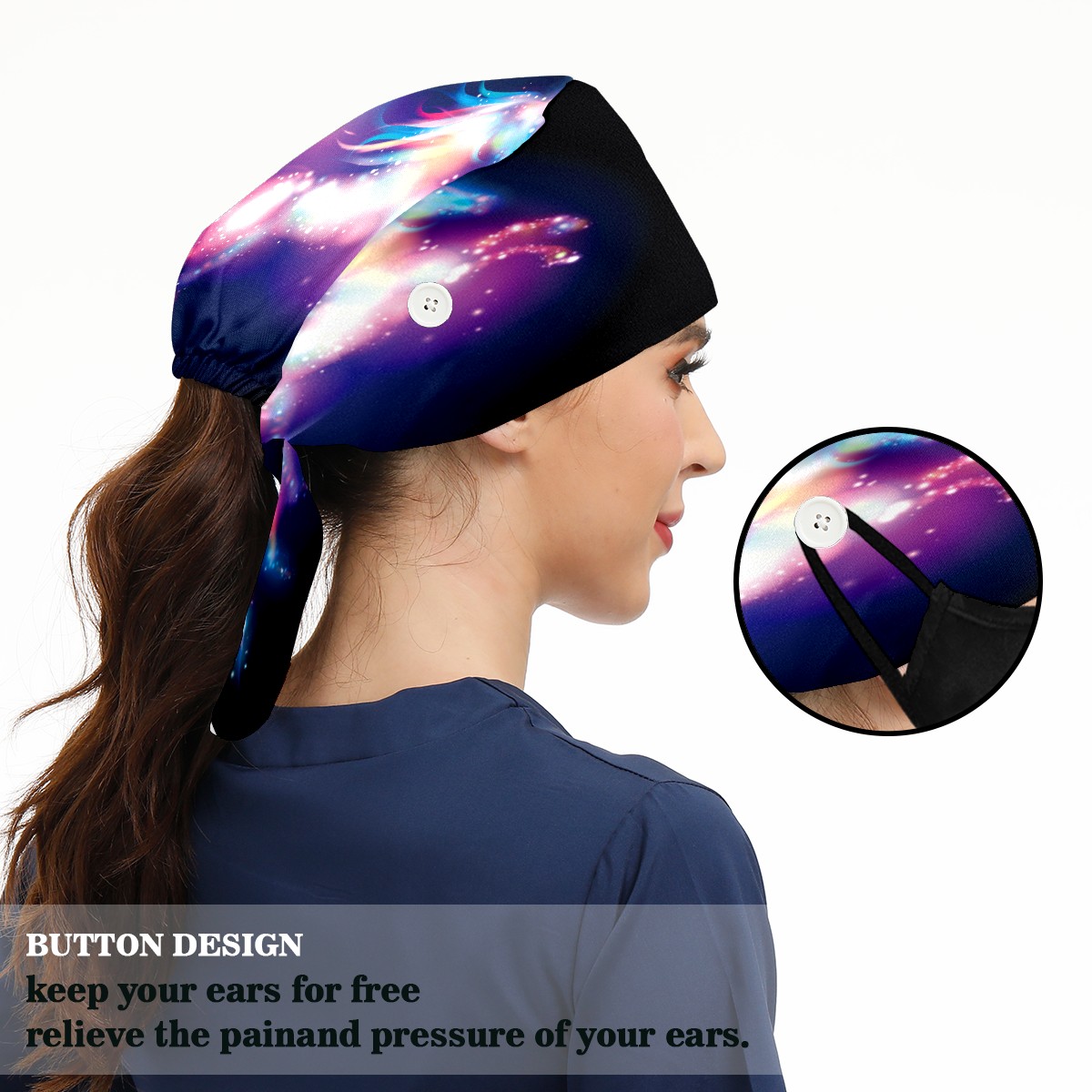 <p>Working cap with Sweatband and Button for Women Men</p><p>Material&nbsp;: 50% cotton+50% polyester</p><p>Size:&nbsp;One size fits most,&nbsp;suitable for both men and women.</p><p>Working Cap with Buttons Design:special&nbsp;design with buttons to protect ears for those who are wearing ma-sk. These new styles hats will allow you to put the straps around the buttons instead of your ears, make you feel more comfortable.</p><p>Sweat-absorbent towel cloth inside: Built-in&nbsp;100% cotton sweatband, keep the forehead clean after long time working.</p><p>Widely occasion: Widely used in beauty spa, house cleaning, cooking, sleeping, or for cos-play&nbsp;party.</p><p>Lovely pattern: lovely&nbsp;3D printed&nbsp;pattern,&nbsp;it's perfect for gift to you family&nbsp;and friends.</p>