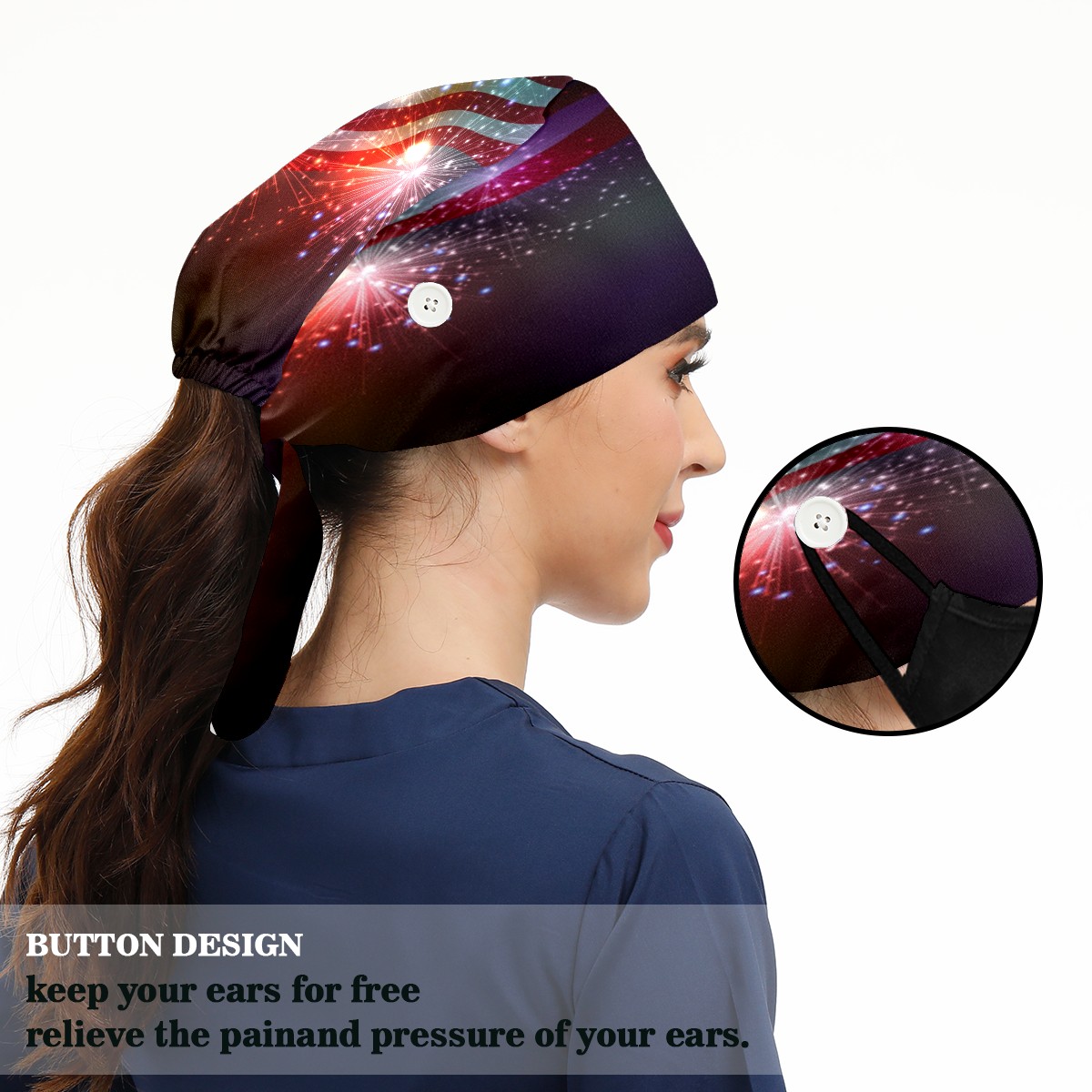 <p>Working cap with Sweatband and Button for Women Men</p><p>Material&nbsp;: 50% cotton+50% polyester</p><p>Size:&nbsp;One size fits most,&nbsp;suitable for both men and women.</p><p>Working Cap with Buttons Design:special&nbsp;design with buttons to protect ears for those who are wearing ma-sk. These new styles hats will allow you to put the straps around the buttons instead of your ears, make you feel more comfortable.</p><p>Sweat-absorbent towel cloth inside: Built-in&nbsp;100% cotton sweatband, keep the forehead clean after long time working.</p><p>Widely occasion: Widely used in beauty spa, house cleaning, cooking, sleeping, or for cos-play&nbsp;party.</p><p>Lovely pattern: lovely&nbsp;3D printed&nbsp;pattern,&nbsp;it's perfect for gift to you family&nbsp;and friends.</p>
