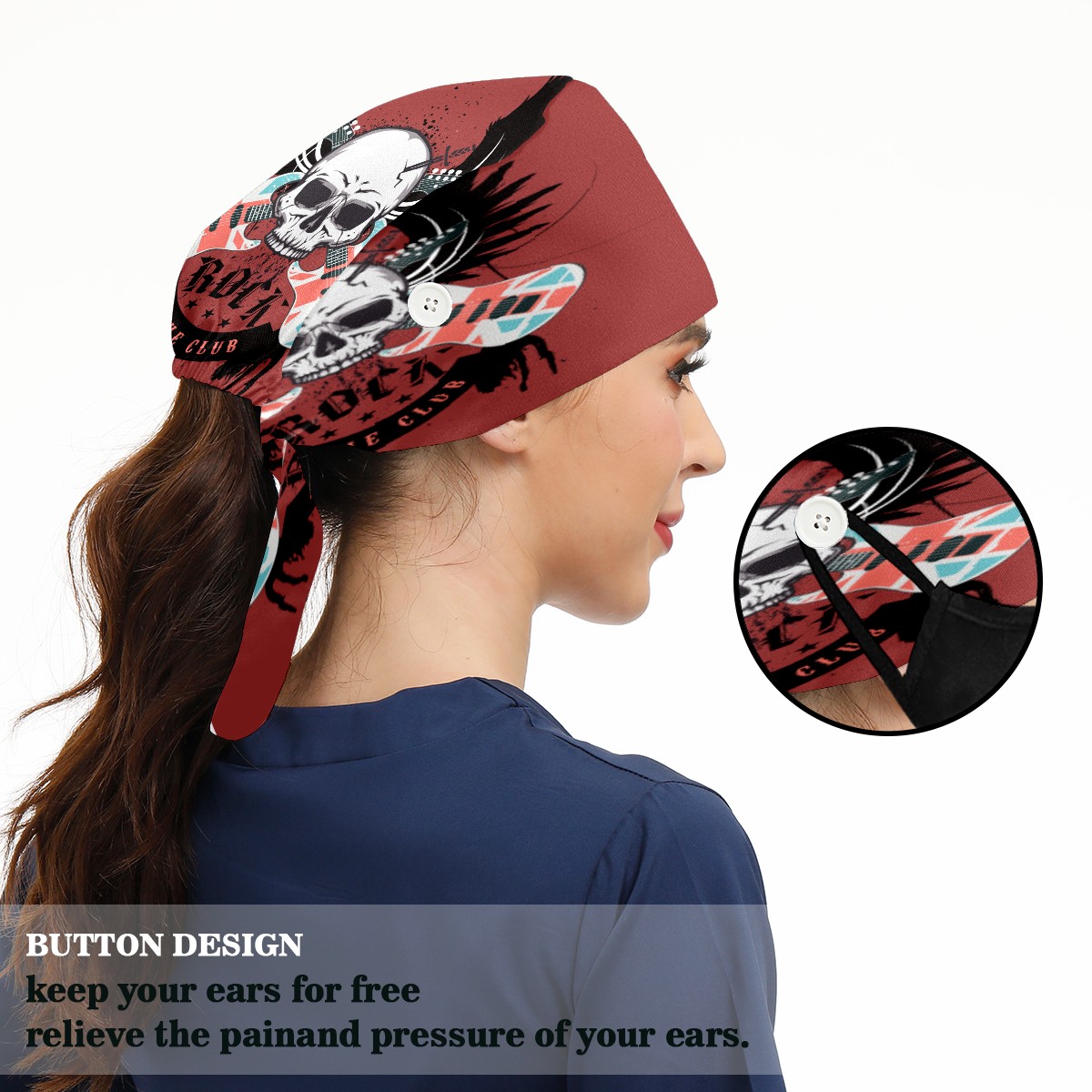<p>Working cap with Sweatband and Button for Women Men</p><p>Material&nbsp;: 50% cotton+50% polyester</p><p>Size:&nbsp;One size fits most,&nbsp;suitable for both men and women.</p><p>Working Cap with Buttons Design:special&nbsp;design with buttons to protect ears for those who are wearing ma-sk. These new styles hats will allow you to put the straps around the buttons instead of your ears, make you feel more comfortable.</p><p>Sweat-absorbent towel cloth inside: Built-in&nbsp;100% cotton sweatband, keep the forehead clean after long time working.</p><p>Widely occasion: Widely used in beauty spa, house cleaning, cooking, sleeping, or for cos-play&nbsp;party.</p><p>Lovely pattern: lovely&nbsp;3D printed&nbsp;pattern,&nbsp;it's perfect for gift to you family&nbsp;and friends.</p>