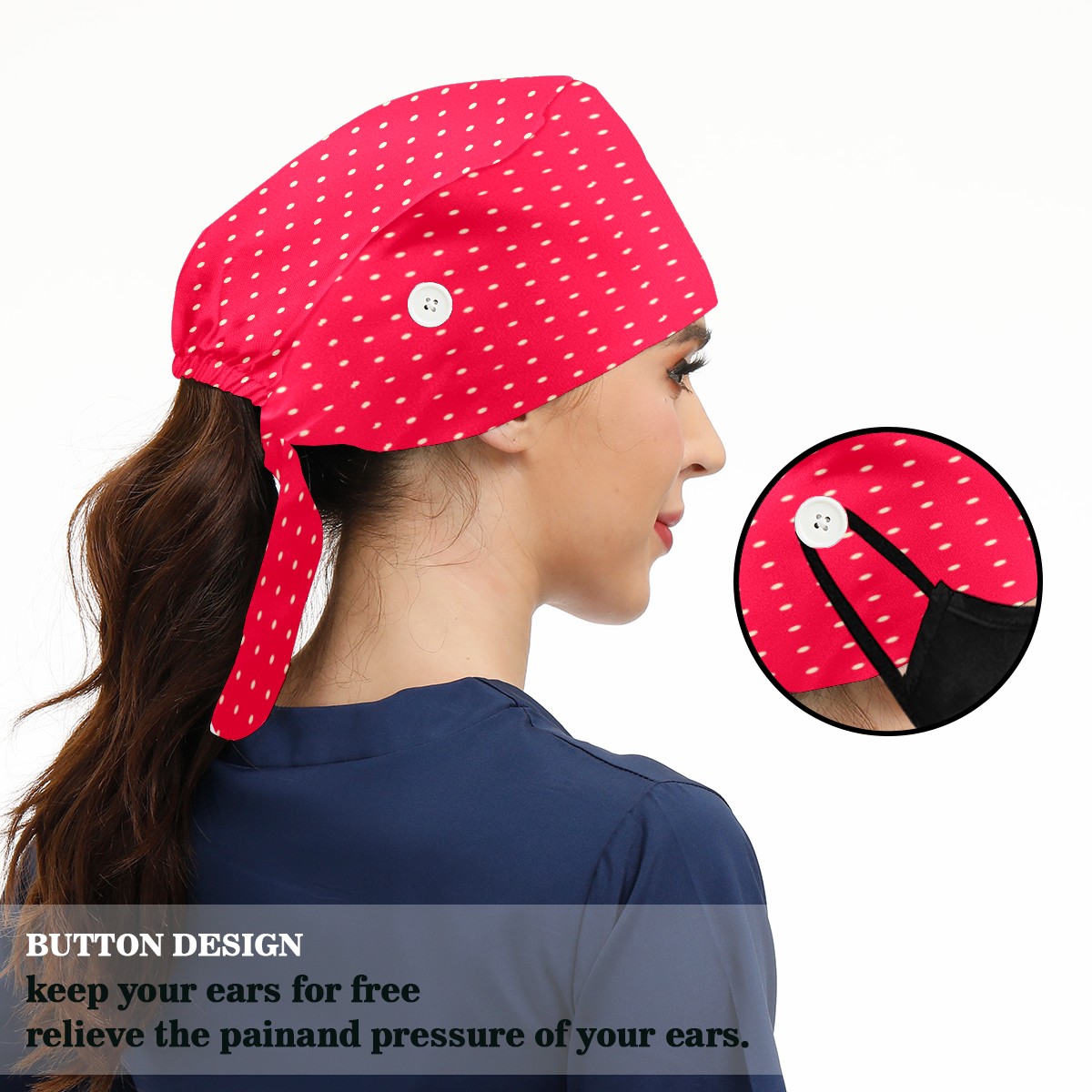 <p>Working cap with Sweatband and Button for Women Men</p><p>Material&nbsp;: 50% cotton+50% polyester</p><p>Size:&nbsp;One size fits most,&nbsp;suitable for both men and women.</p><p>Working Cap with Buttons Design:special&nbsp;design with buttons to protect ears for those who are wearing ma-sk. These new styles hats will allow you to put the straps around the buttons instead of your ears, make you feel more comfortable.</p><p>Sweat-absorbent towel cloth inside: Built-in&nbsp;100% cotton sweatband, keep the forehead clean after long time working.</p><p>Widely occasion: Widely used in beauty spa, house cleaning, cooking, sleeping, or for cos-play&nbsp;party.</p><p>Lovely pattern: lovely&nbsp;3D printed&nbsp;pattern,&nbsp;it's perfect for gift to you family&nbsp;and friends.</p>