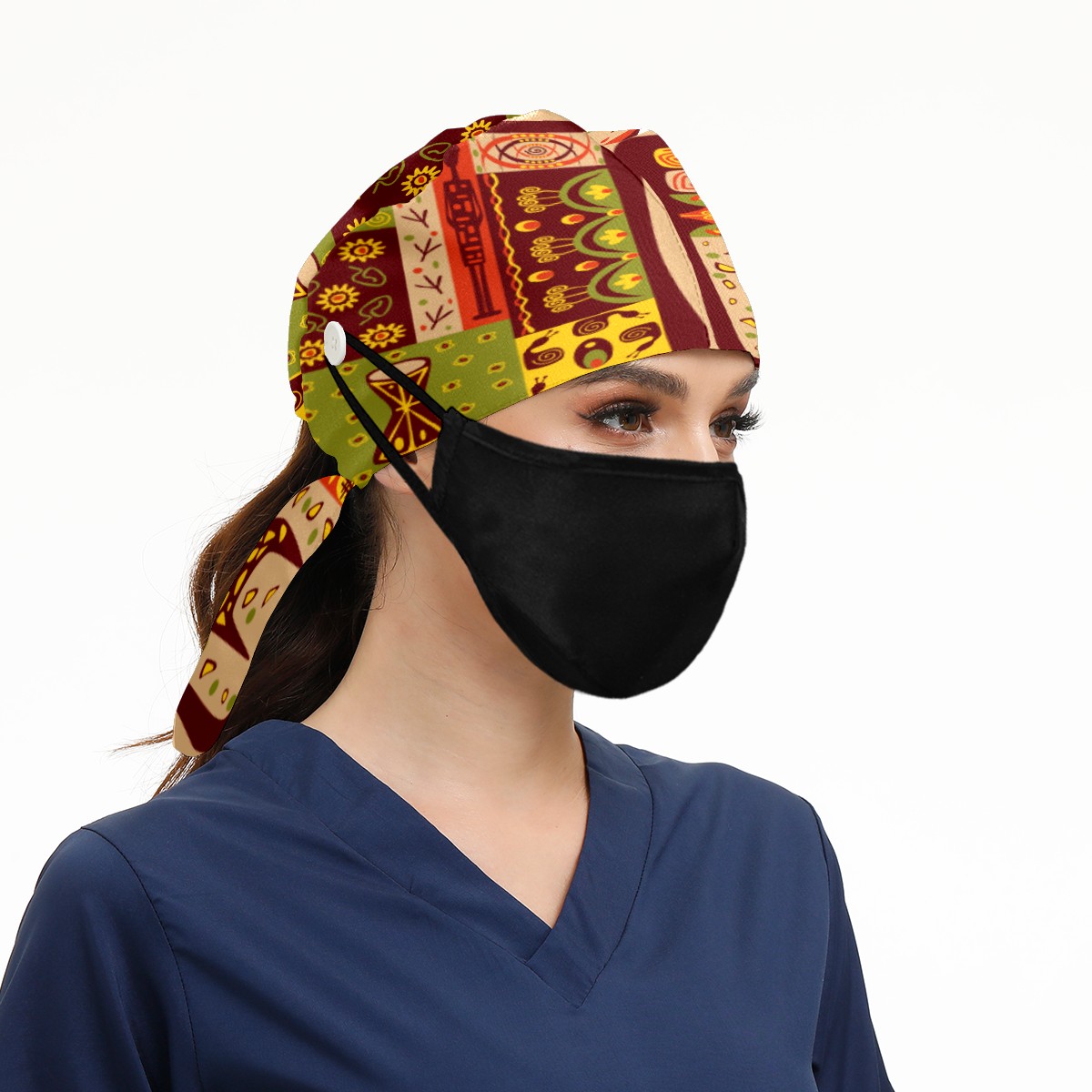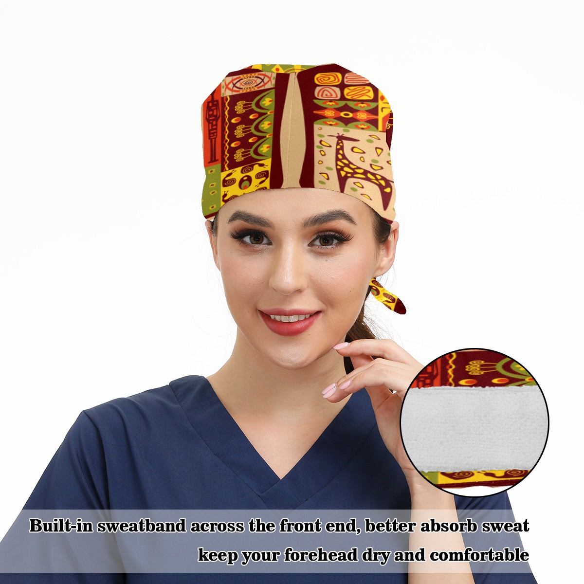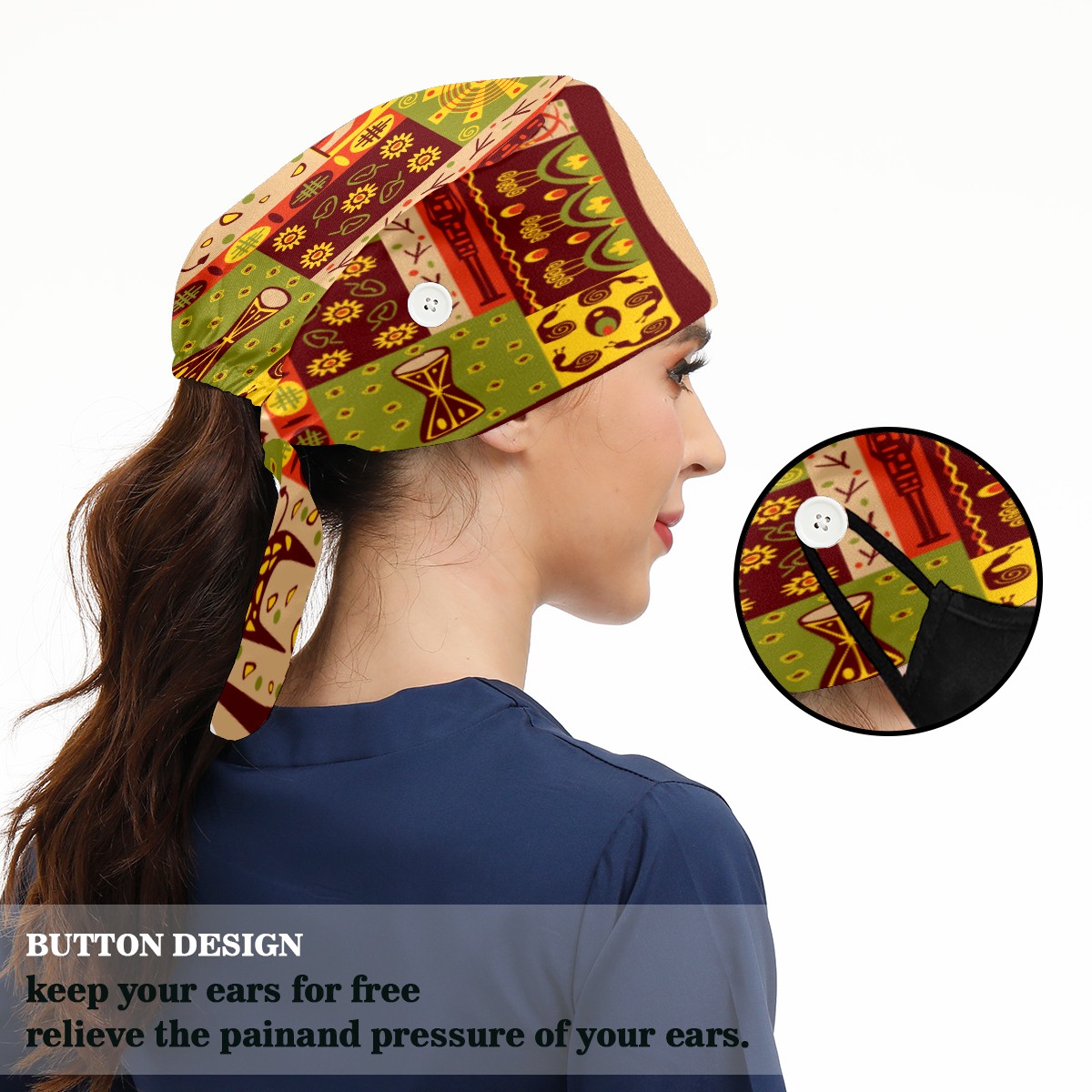 <p>Working cap with Sweatband and Button for Women Men</p><p>Material&nbsp;: 50% cotton+50% polyester</p><p>Size:&nbsp;One size fits most,&nbsp;suitable for both men and women.</p><p>Working Cap with Buttons Design:special&nbsp;design with buttons to protect ears for those who are wearing ma-sk. These new styles hats will allow you to put the straps around the buttons instead of your ears, make you feel more comfortable.</p><p>Sweat-absorbent towel cloth inside: Built-in&nbsp;100% cotton sweatband, keep the forehead clean after long time working.</p><p>Widely occasion: Widely used in beauty spa, house cleaning, cooking, sleeping, or for cos-play&nbsp;party.</p><p>Lovely pattern: lovely&nbsp;3D printed&nbsp;pattern,&nbsp;it's perfect for gift to you family&nbsp;and friends.</p>