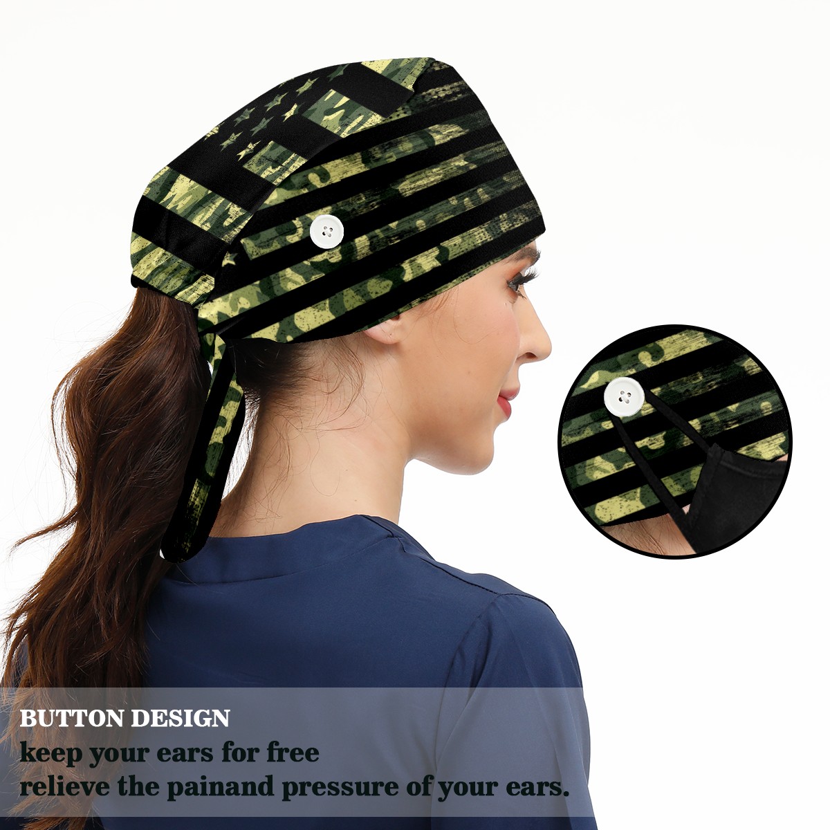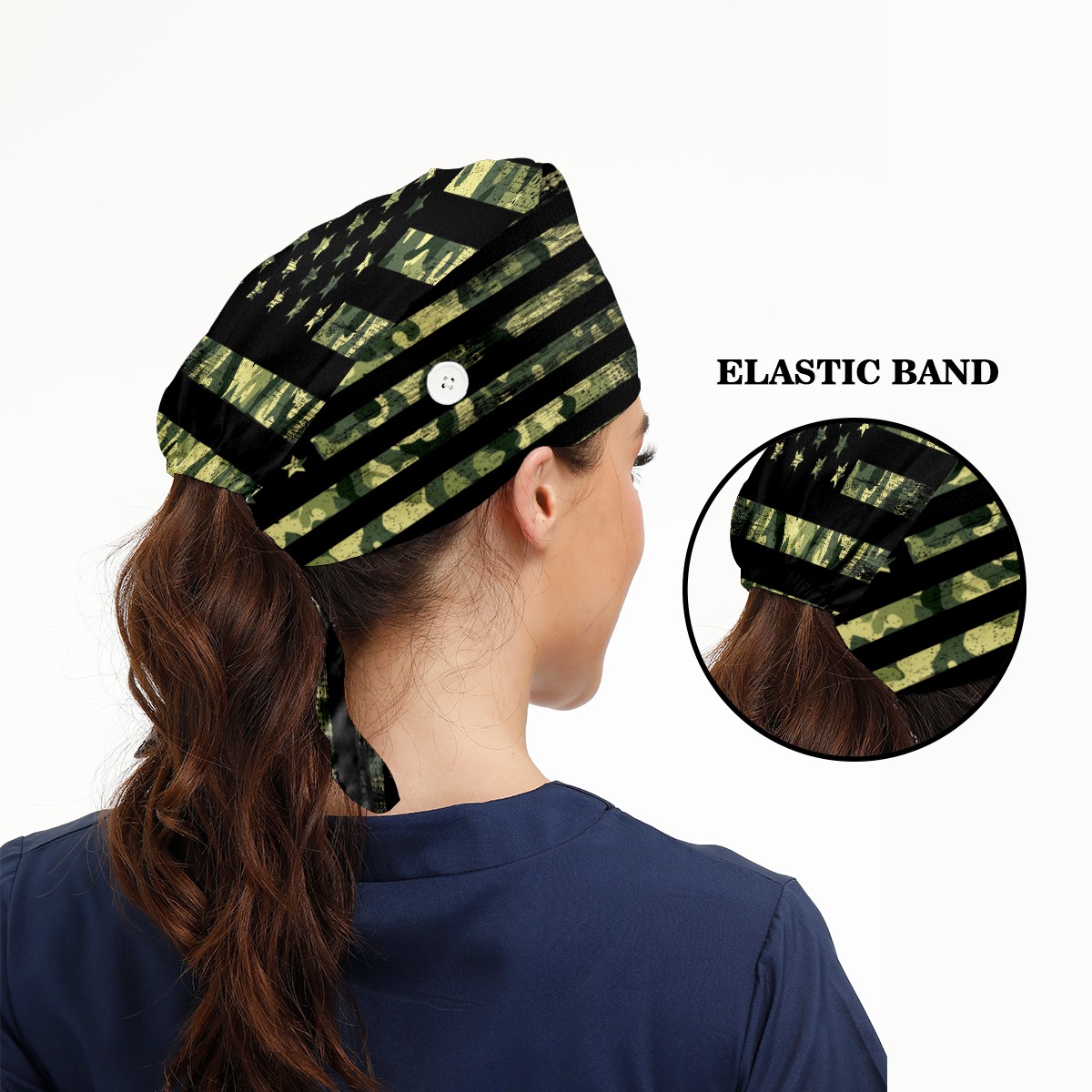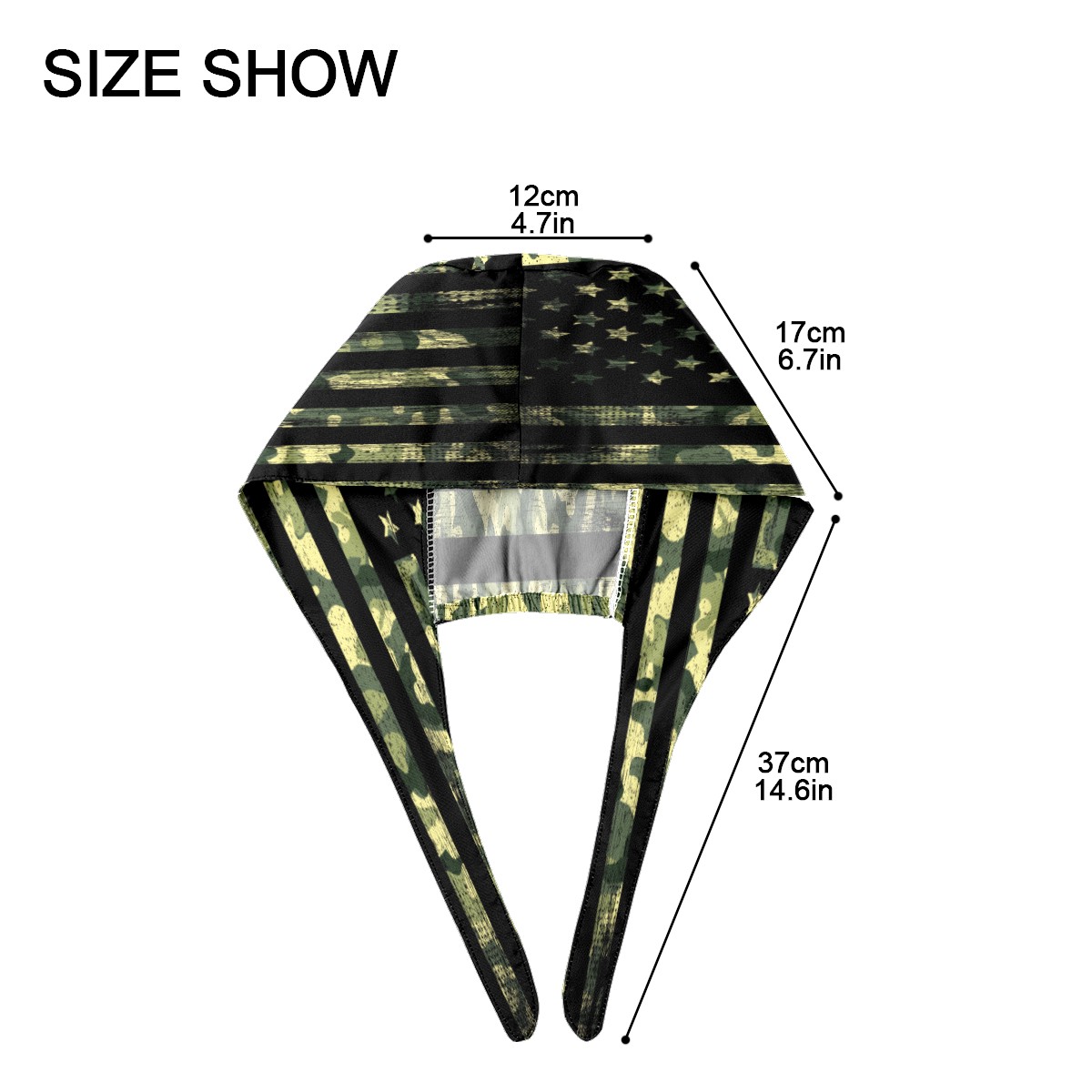 Retro Rustic Green Camo American Flag Working Cap Button and Sweatband Adjustable Elastic Head Cover Hair Tie Back Work Hats for Women Men