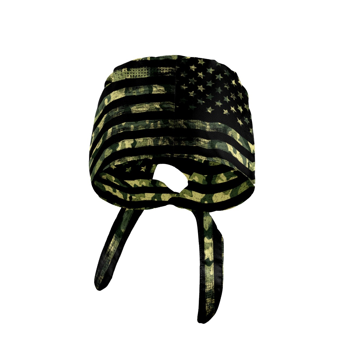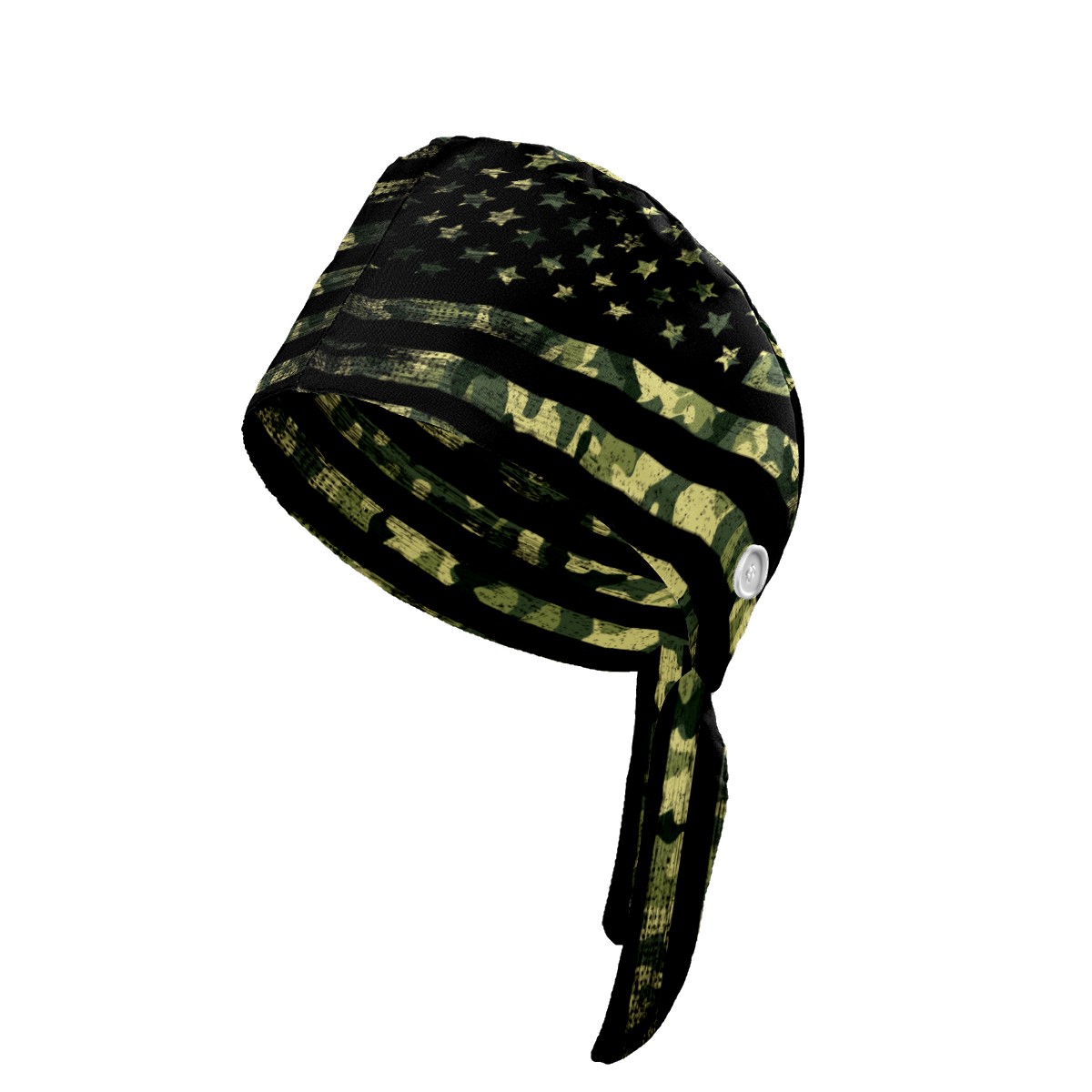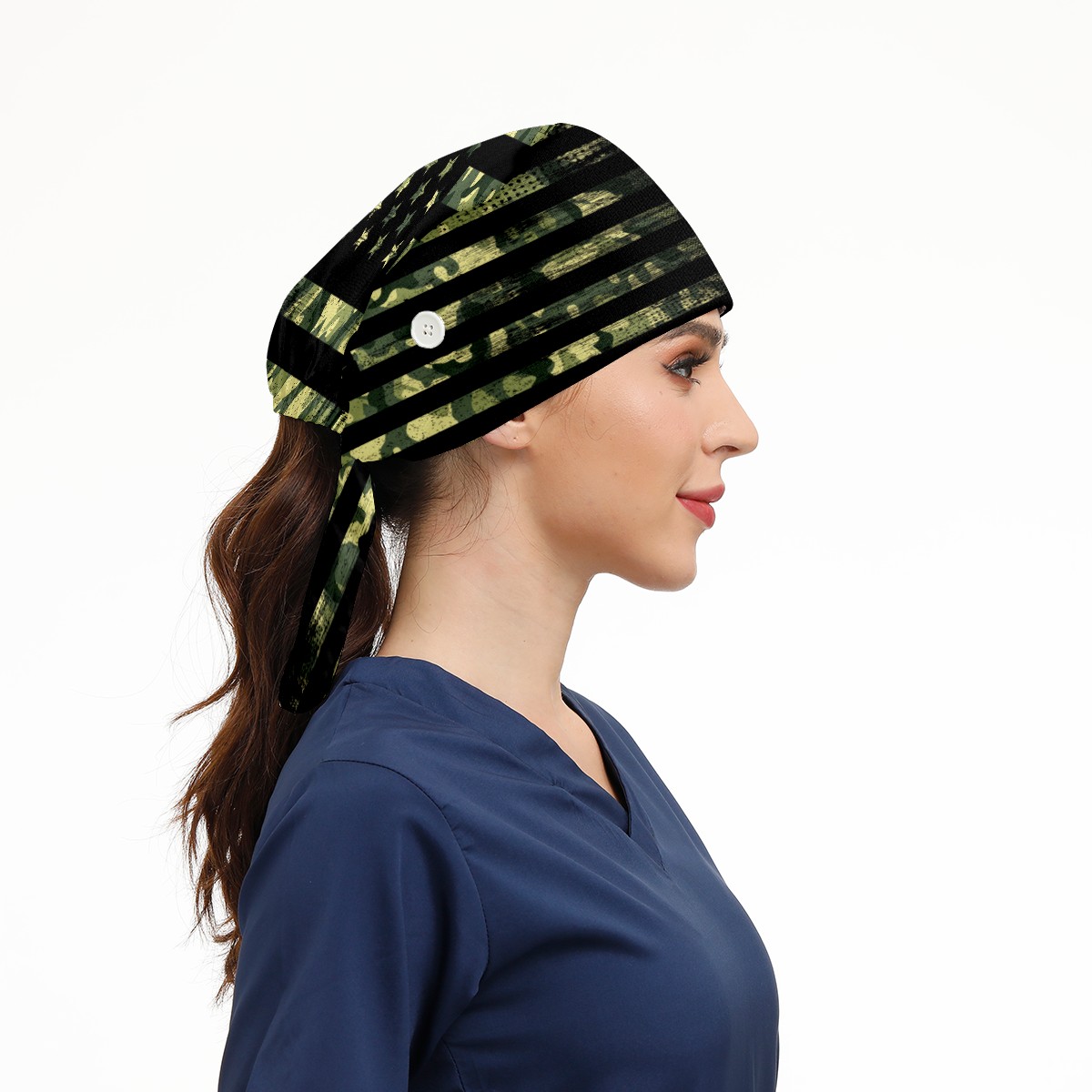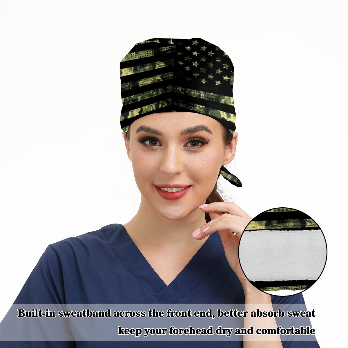 Retro Rustic Green Camo American Flag Working Cap Button and Sweatband Adjustable Elastic Head Cover Hair Tie Back Work Hats for Women Men