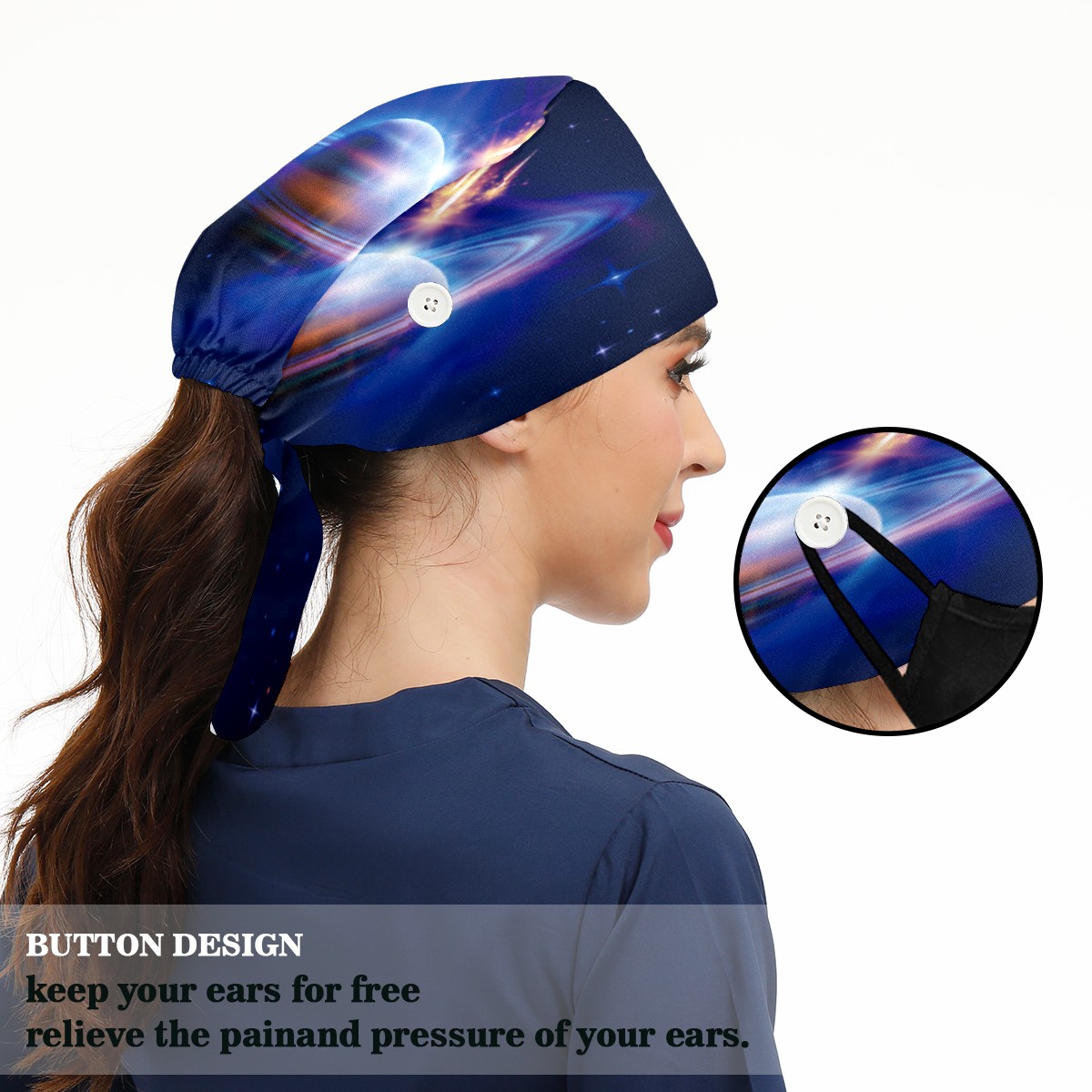 <p>Working cap with Sweatband and Button for Women Men</p><p>Material&nbsp;: 50% cotton+50% polyester</p><p>Size:&nbsp;One size fits most,&nbsp;suitable for both men and women.</p><p>Working Cap with Buttons Design:special&nbsp;design with buttons to protect ears for those who are wearing ma-sk. These new styles hats will allow you to put the straps around the buttons instead of your ears, make you feel more comfortable.</p><p>Sweat-absorbent towel cloth inside: Built-in&nbsp;100% cotton sweatband, keep the forehead clean after long time working.</p><p>Widely occasion: Widely used in beauty spa, house cleaning, cooking, sleeping, or for cos-play&nbsp;party.</p><p>Lovely pattern: lovely&nbsp;3D printed&nbsp;pattern,&nbsp;it's perfect for gift to you family&nbsp;and friends.</p>