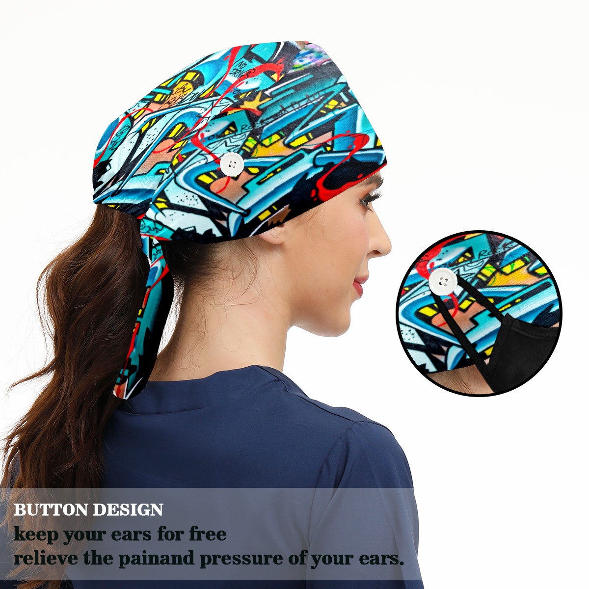 <p>Working cap with Sweatband and Button for Women Men</p><p>Material&nbsp;: 50% cotton+50% polyester</p><p>Size:&nbsp;One size fits most,&nbsp;suitable for both men and women.</p><p>Working Cap with Buttons Design:special&nbsp;design with buttons to protect ears for those who are wearing ma-sk. These new styles hats will allow you to put the straps around the buttons instead of your ears, make you feel more comfortable.</p><p>Sweat-absorbent towel cloth inside: Built-in&nbsp;100% cotton sweatband, keep the forehead clean after long time working.</p><p>Widely occasion: Widely used in beauty spa, house cleaning, cooking, sleeping, or for cos-play&nbsp;party.</p><p>Lovely pattern: lovely&nbsp;3D printed&nbsp;pattern,&nbsp;it's perfect for gift to you family&nbsp;and friends.</p>